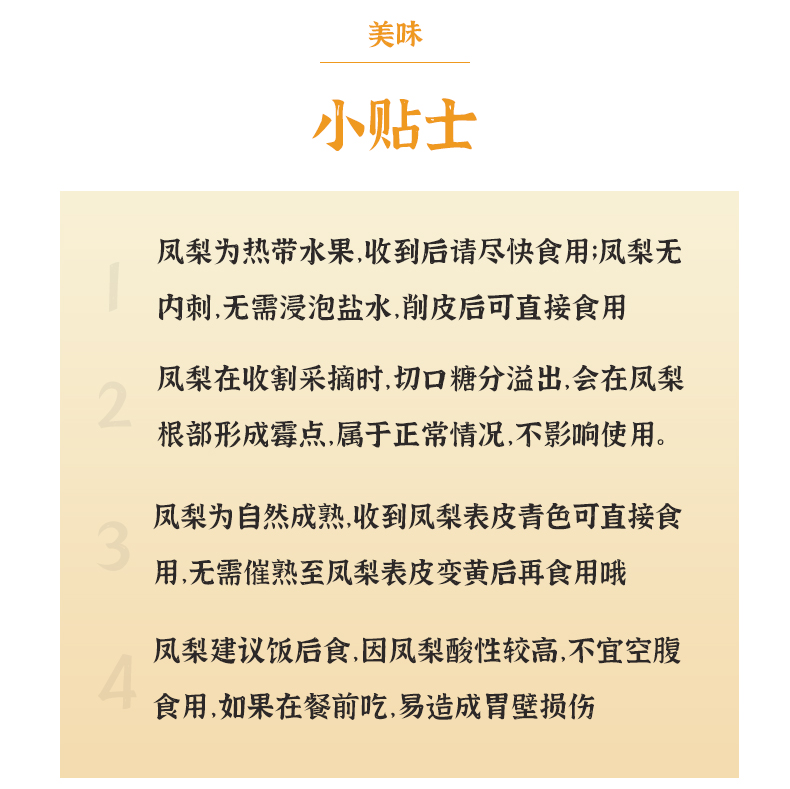1.收到后请尽快食用,菠萝切开后可不泡盐水食用,怕麻嘴建议先用盐水浸泡15分钟左右后再食用