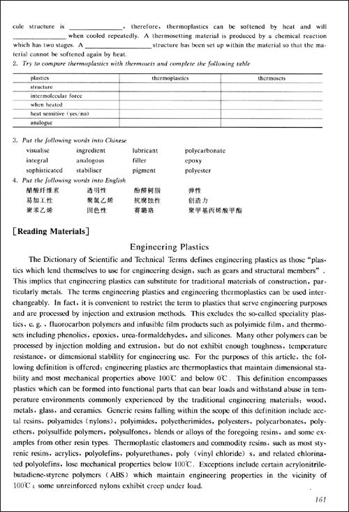《高分子材料工程专业英语(第2版)》是《高分子材料工程专业英语》的第二版,是“大学英语专业阅读教材编写委员会”组织编写的高等学校化工专业英语系列教材之一。全书共分32课,包括高分子化学、高分子物理、聚合反应工程、聚合物性能、成型加工及应用,以及高分子材料的实验、研制与生产等多方面的内容。每课均由课文、重点词汇(单词、音标及解释)、词组、课文注释、练习、阅读材料等部分组成。