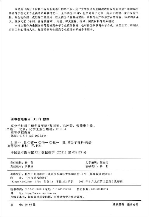《高分子材料工程专业英语(第2版)》主要作为全国各高等院校高分子专业英语教材,也可作为从事高分子合成、成型加工、研制及应用工作的科技人员、教师及研究生提高专业英语水平的参考用书。