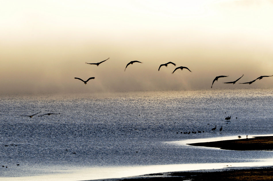 黑颈鹤国家级自然保护区的大海子湿地,上千只被誉为“鸟类熊猫”的黑颈鹤聚集在一起“抱团取暖”,时而伫立不动,时而引吭高歌,时而翩翩起舞,时而悠闲漫步,时而展翅翱翔,鹤影重重迷人眼,鸣叫声声盈耳际,鹤群动静结合,鹤“阵”变化多端。