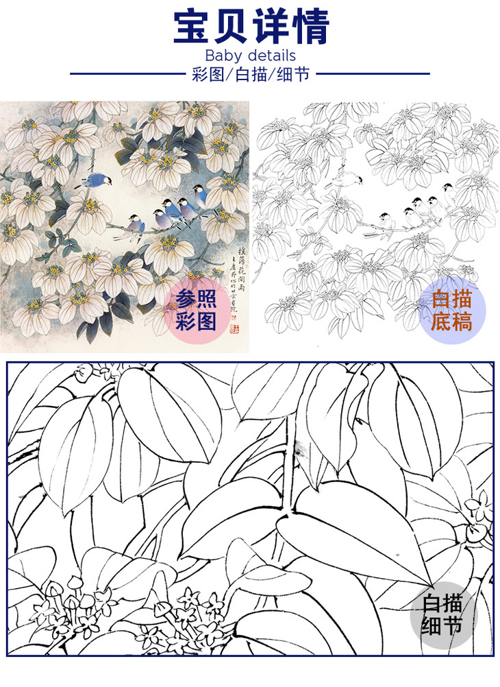 工笔花鸟白描底稿-王庆升《摇荡花间雨》斗方小品册页-多种白描尺寸可选-QB15