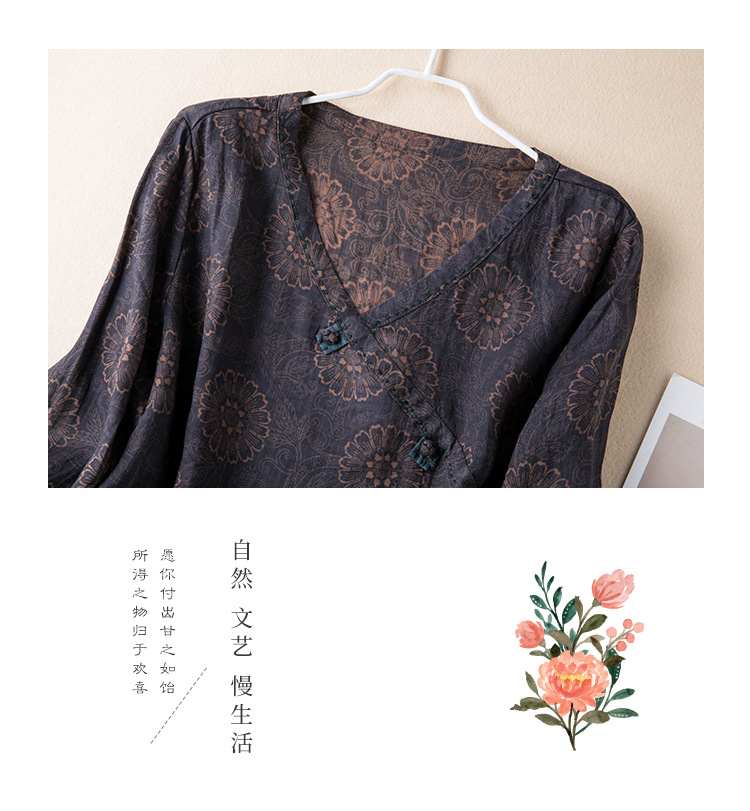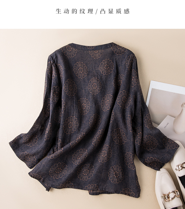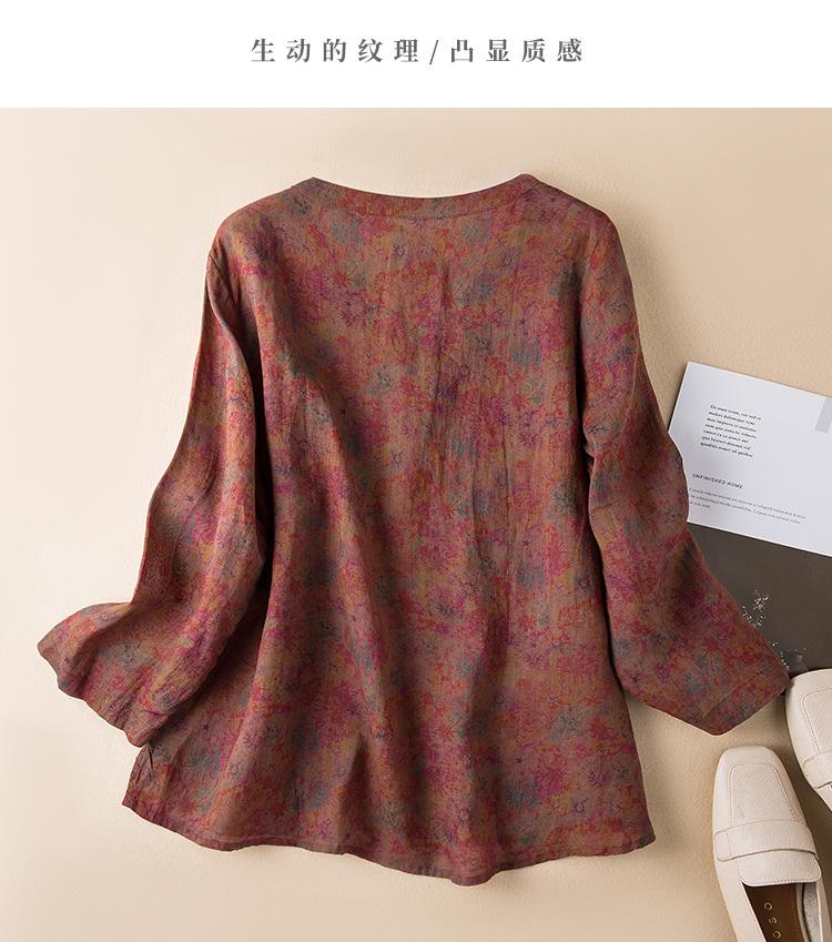 2025春新款苎麻V领碎花复古文艺衬衫宽松长袖百搭港味棉麻上衣女