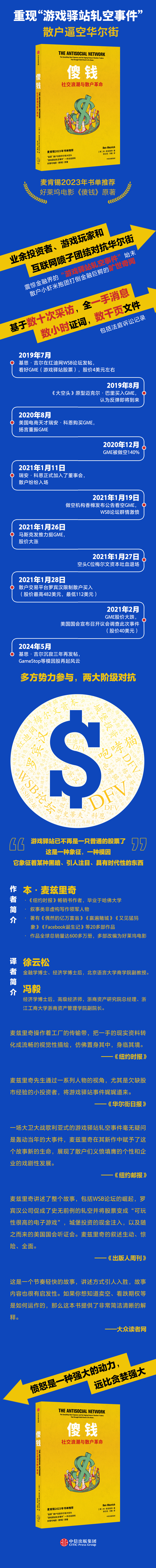麦兹里奇讲述了整个故事,包括WSB论坛的崛起,罗宾汉公司促成了无例的轧空并将股票变成“可玩性很高的电子游戏”,城堡投资的现金注入,以及随之而来的美国国会听证会。麦兹里奇的叙述生动、惊险、全面。
