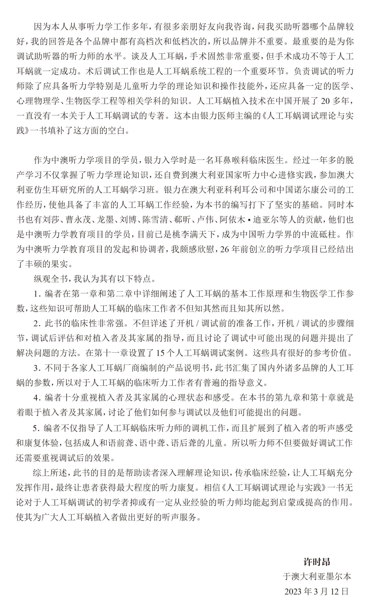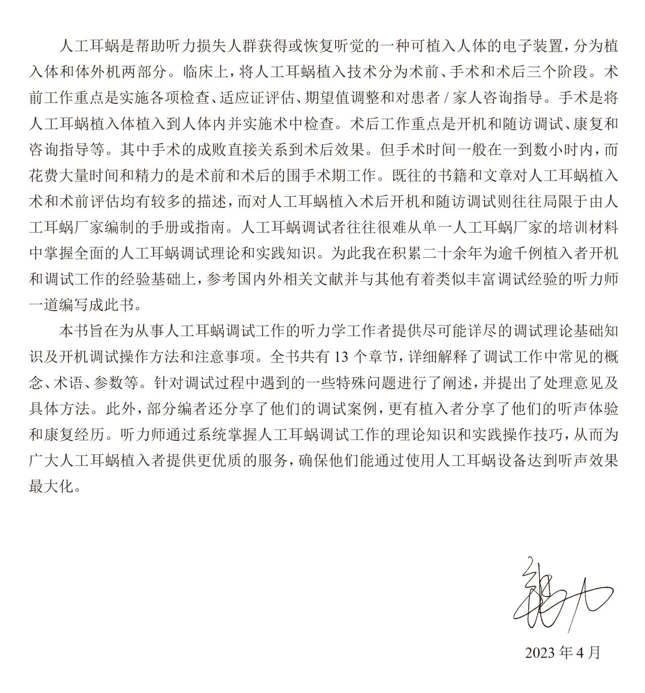☊ 3. 不同于各家人工耳蜗厂商编制的产品说明书,此书汇集了国内外诸多品牌的人工耳蜗的参数,所以对于人工耳蜗的临床听力工作者有普遍的指导意义。