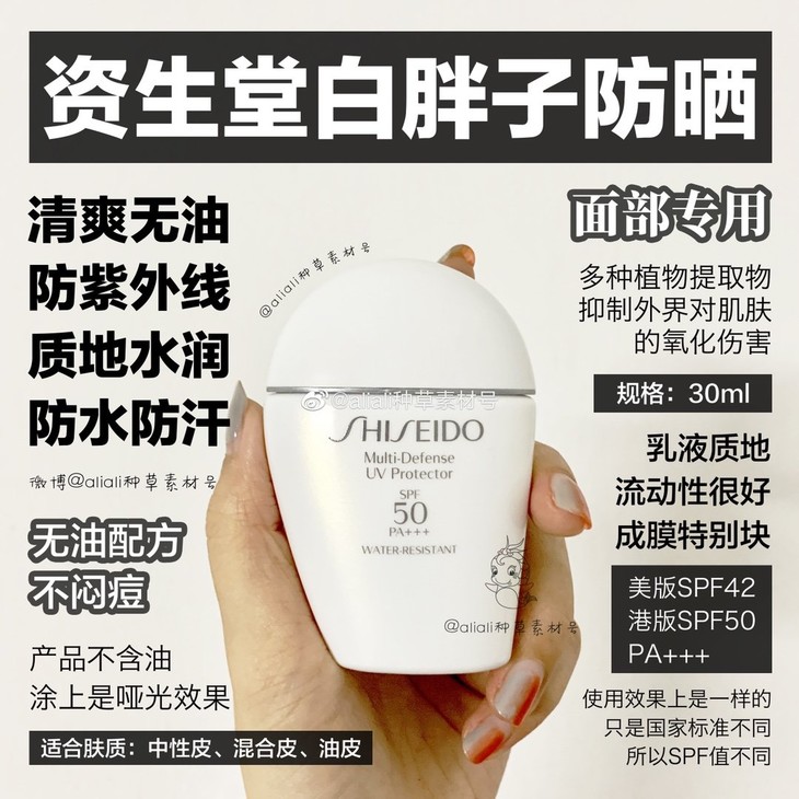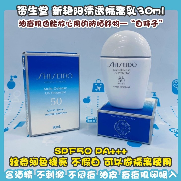 资生堂 新艳阳清透隔离乳30ml 03/20👍油痘肌也能放心用的防晒好物——“白胖子”👏。SPF50 PA+++,轻微润色提亮,不假白,可以做隔离使用🙃,所以涂上白胖子素颜出门很安心🌟。防止皮肤细胞损伤的3️⃣个主要原因:紫外线☀,氧化和皮脂过度产生。无油配方,超级清透水润💦,完全不油腻,后续上妆不搓泥,特别适合怕油的仙女💆。白胖子防晒不含酒精、不刺激、不闷痘,油皮、痘痘肌闭眼入!敏感肌肤也可以放心使用哦✅!