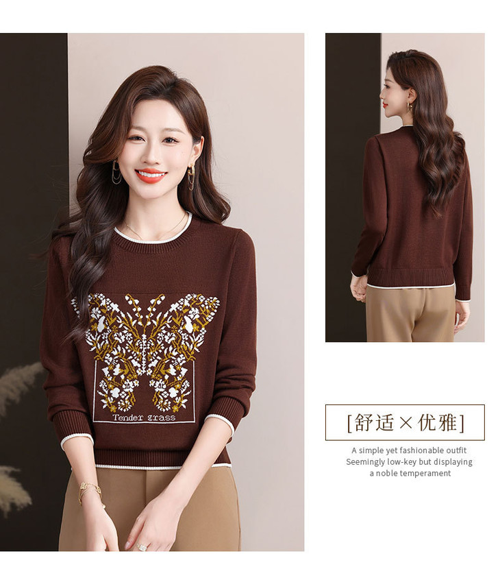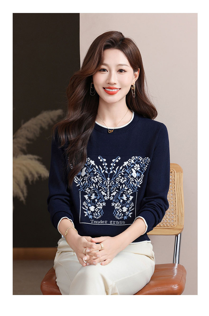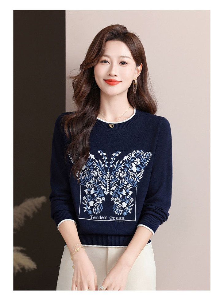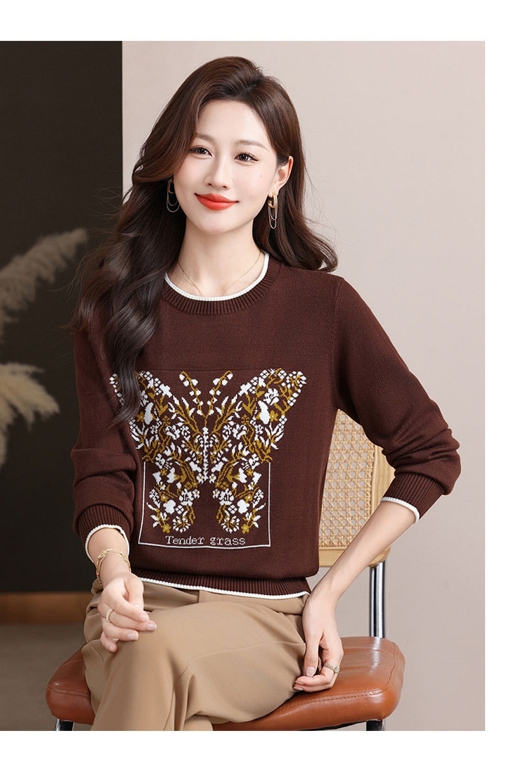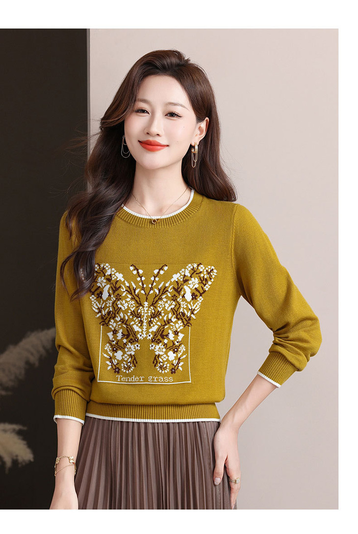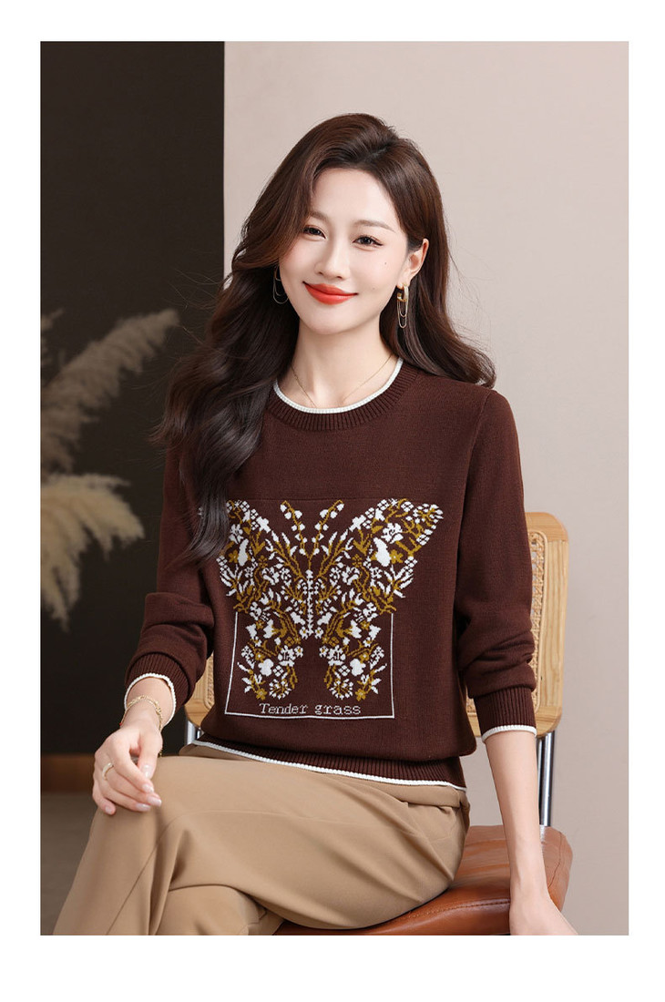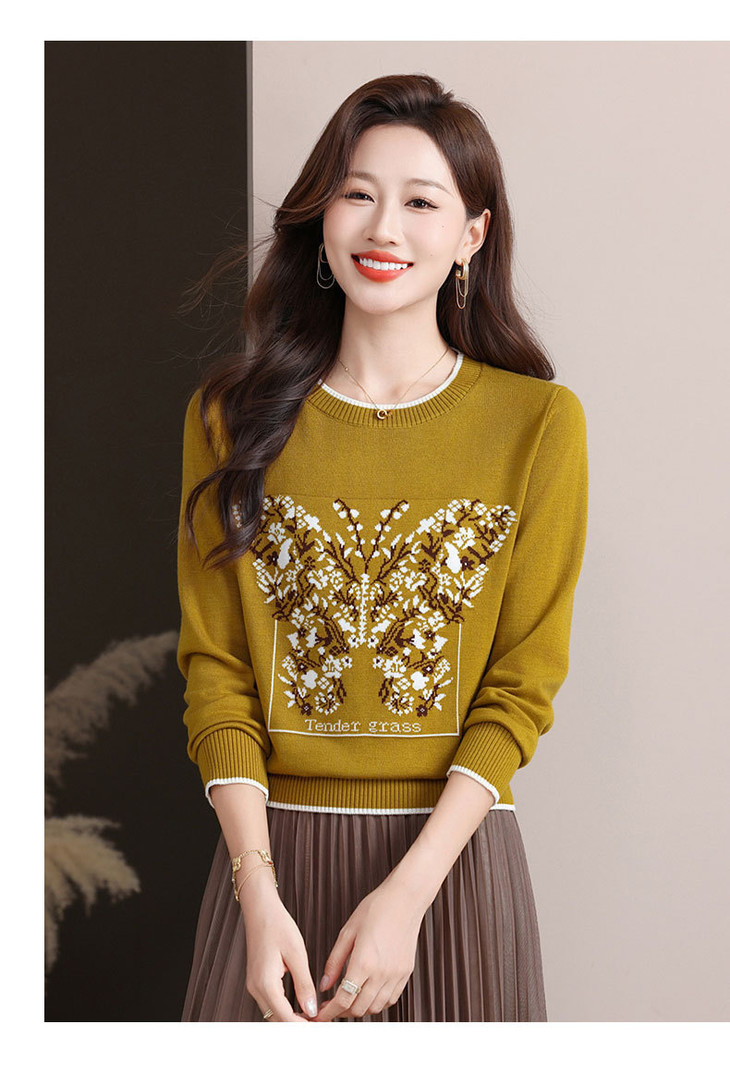 蝴蝶提花圆领针织衫, 复古风长袖显瘦套头百搭毛衣上衣CC-89-855