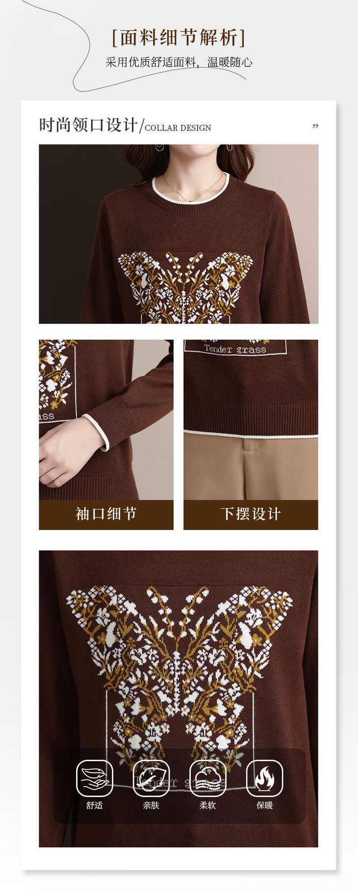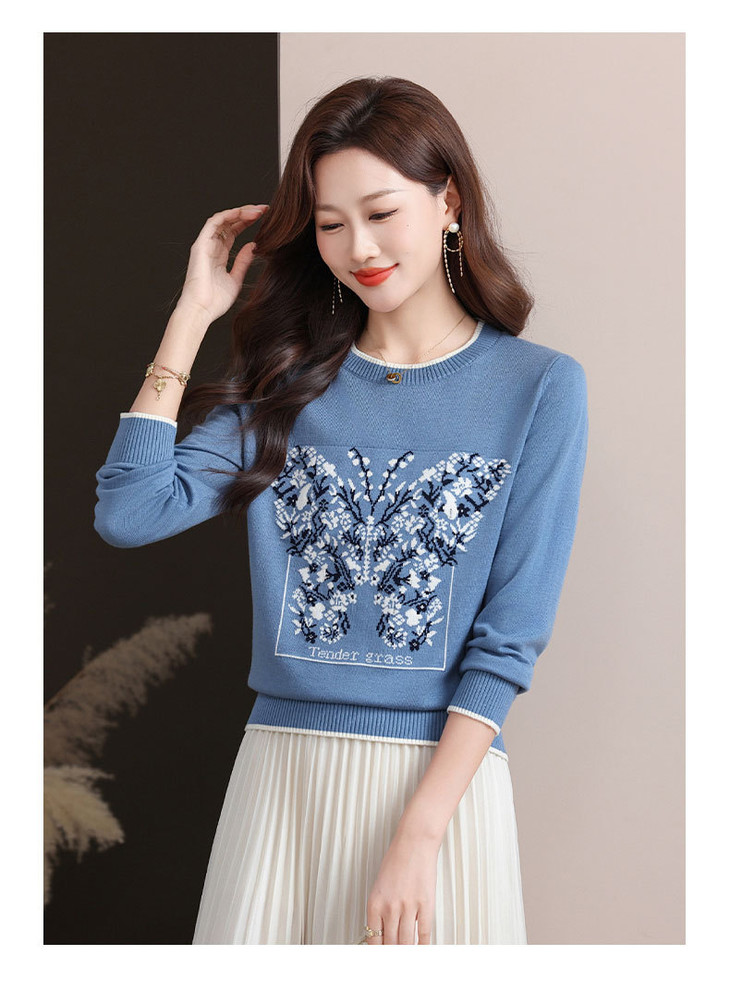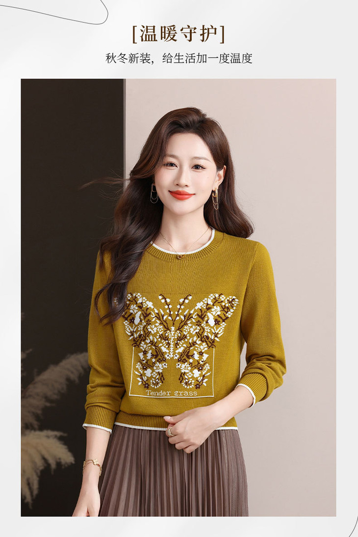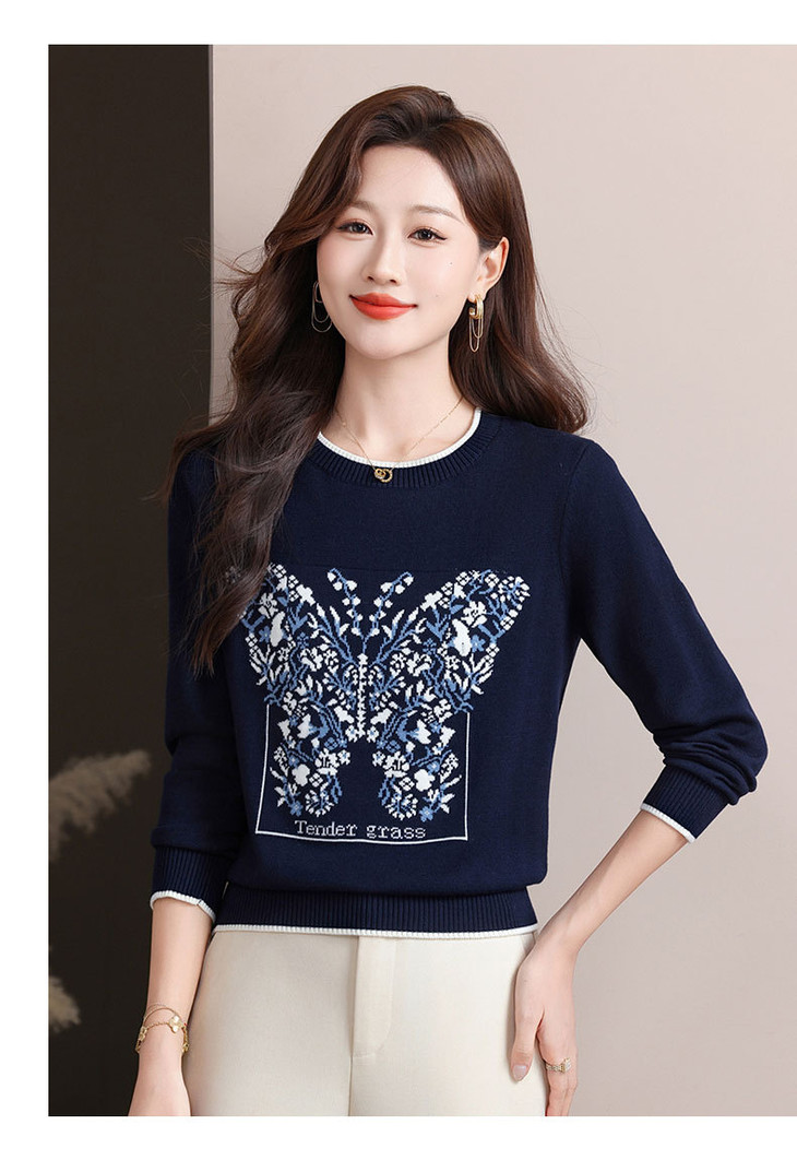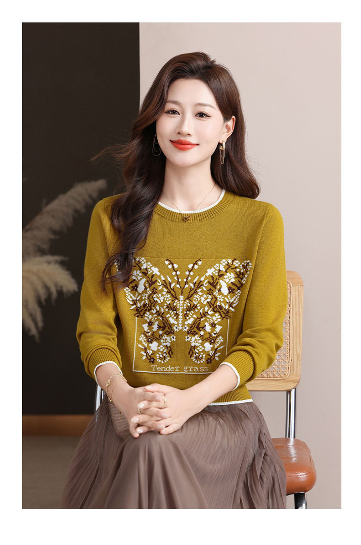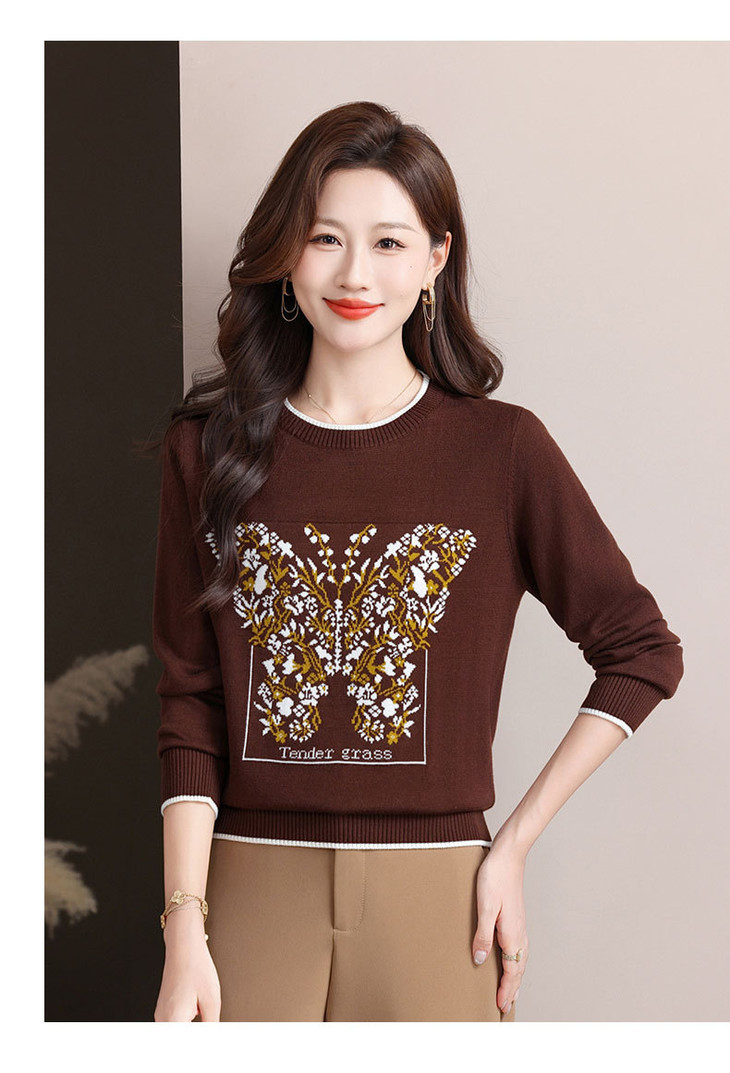蝴蝶提花圆领针织衫, 复古风长袖显瘦套头百搭毛衣上衣CC-89-855