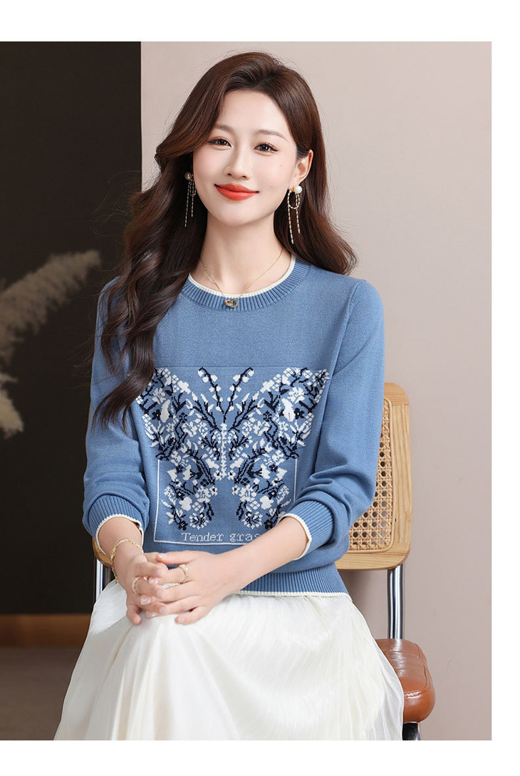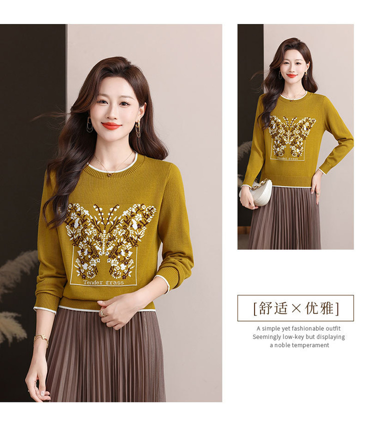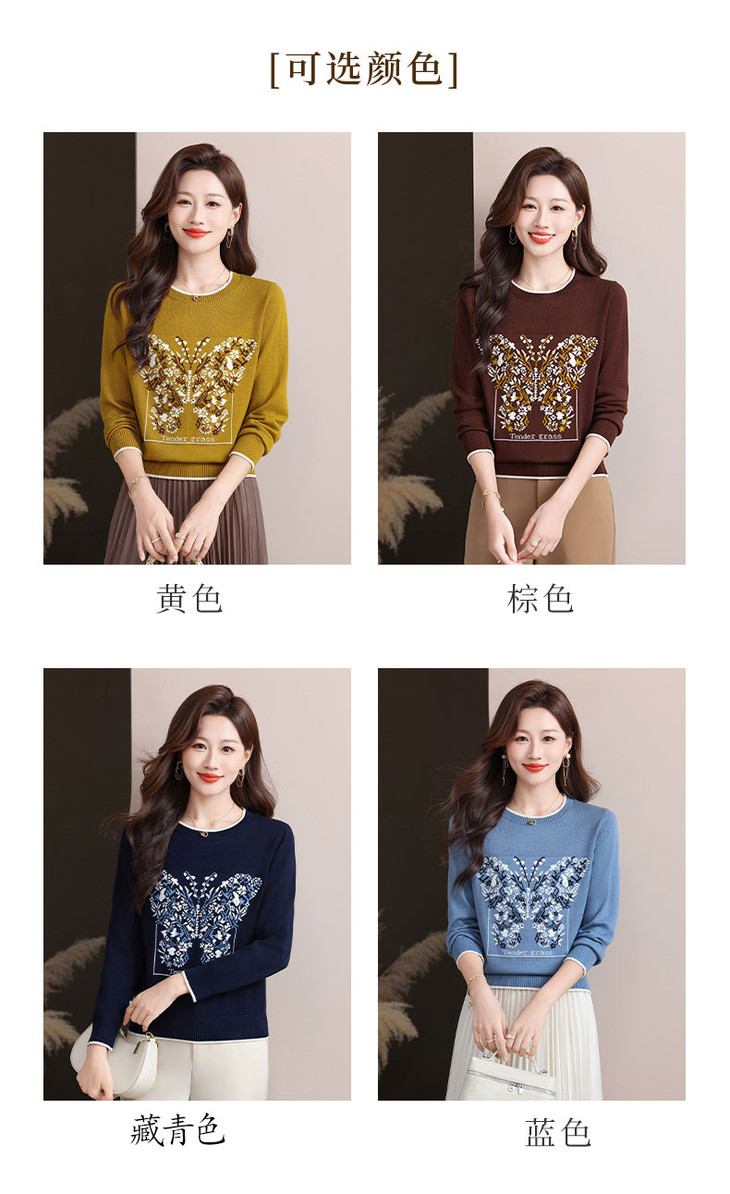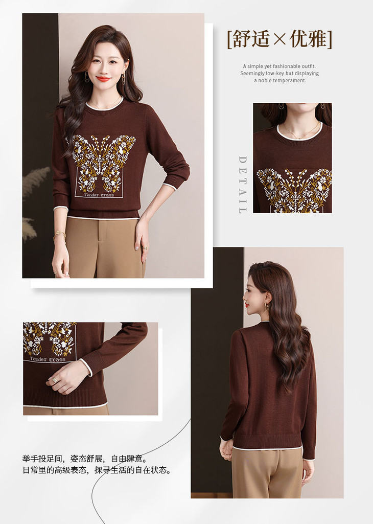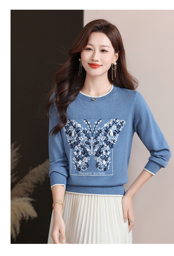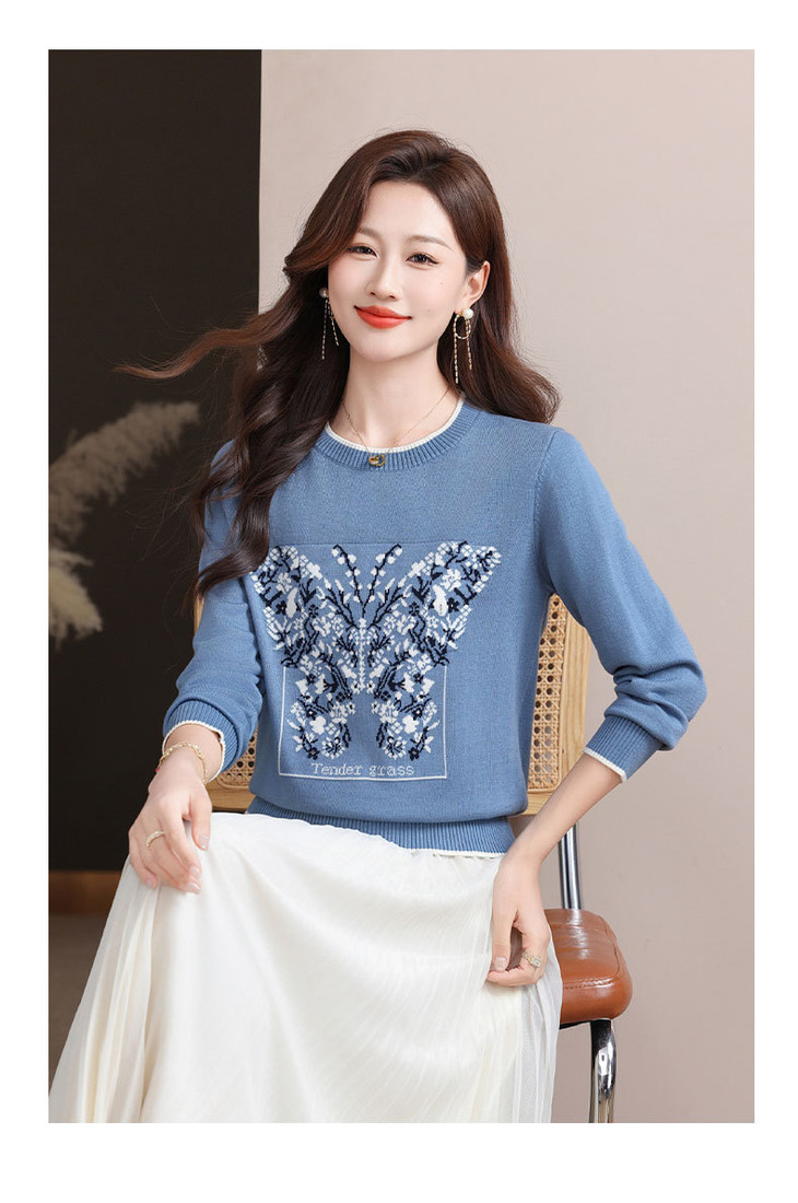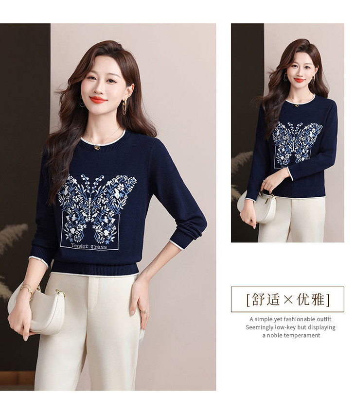 蝴蝶提花圆领针织衫, 复古风长袖显瘦套头百搭毛衣上衣CC-89-855