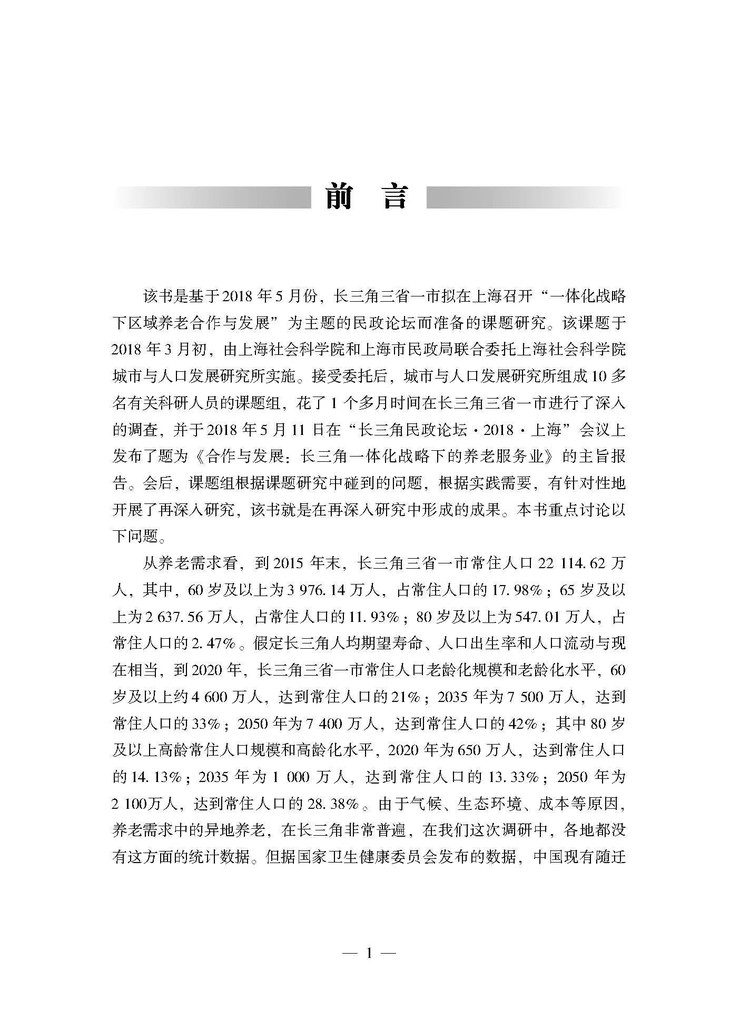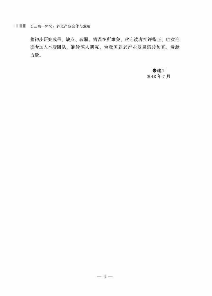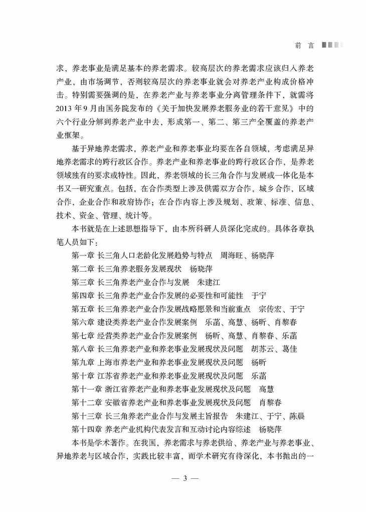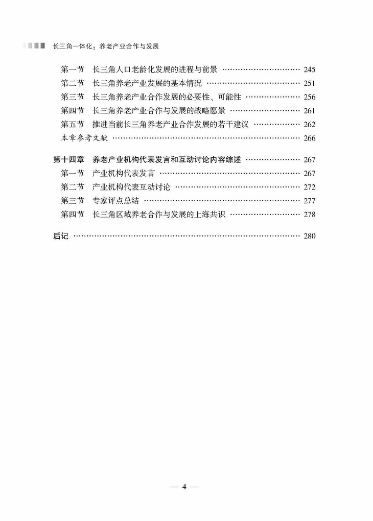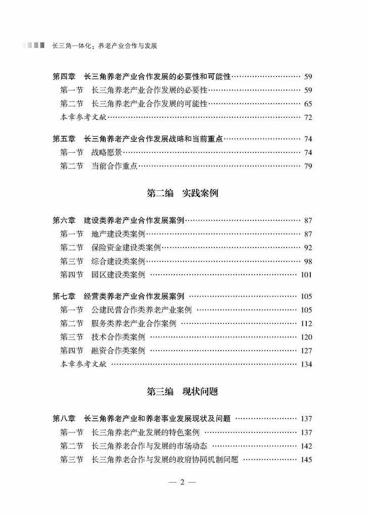 本书主要研究长三角养老产业合作与发展问题,分为理论综合、实践案例、现状问题、战略愿景四个部分。理论综合部分研究探讨了长三角人口老龄化发展趋势与特点;长三角养老产业合作发展的概念、情况与特征和类型;必要性和可能性;战略愿景和当前合作重点。实践案例部分介绍分析了建设类养老产业合作发展与经营类养老产业合作发展的若干案例。现状问题部分包括长三角养老产业合作与发展调研总报告与上海、江苏、浙江安徽三省一市分报告。战略愿景部分聚焦2018长三角民政论坛,包括长三角养老产业合作与发展主旨报告、养老产业机构代表发言和互动讨论内容综述。