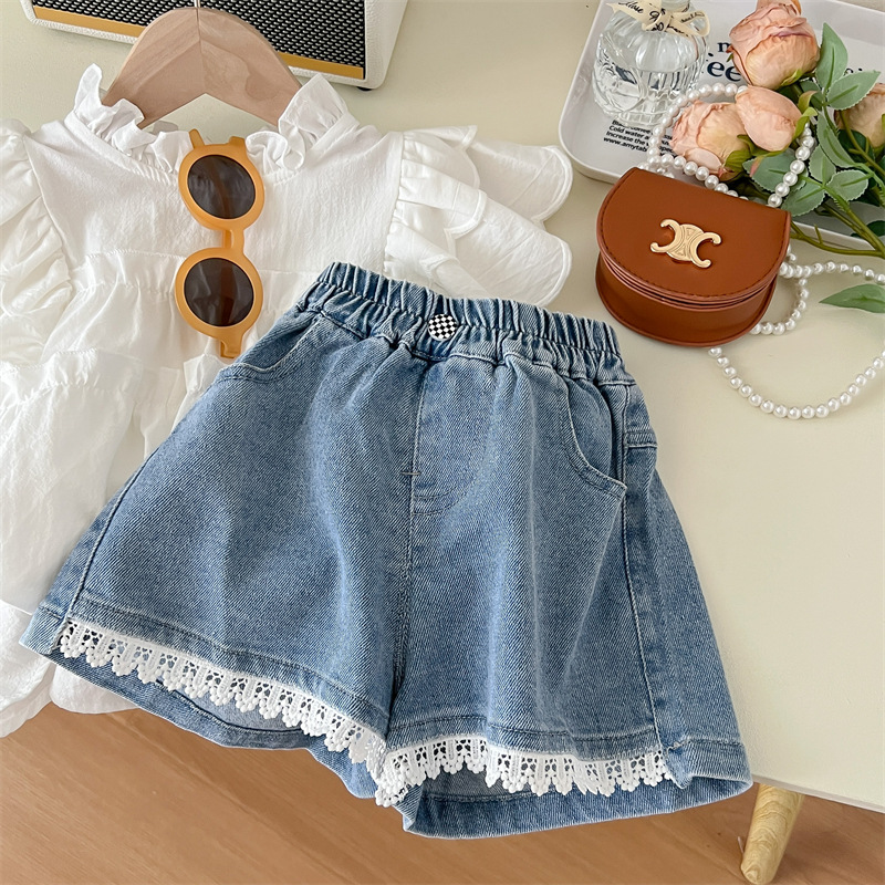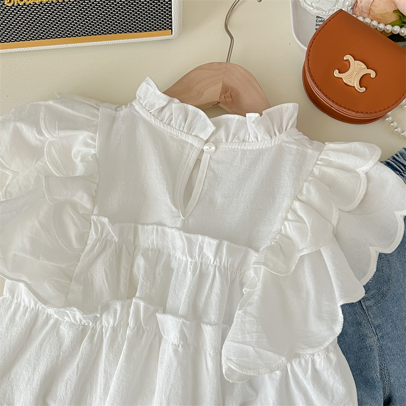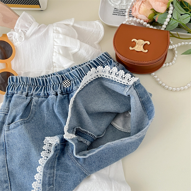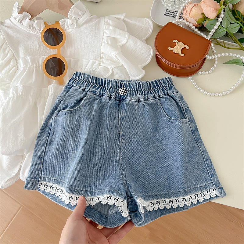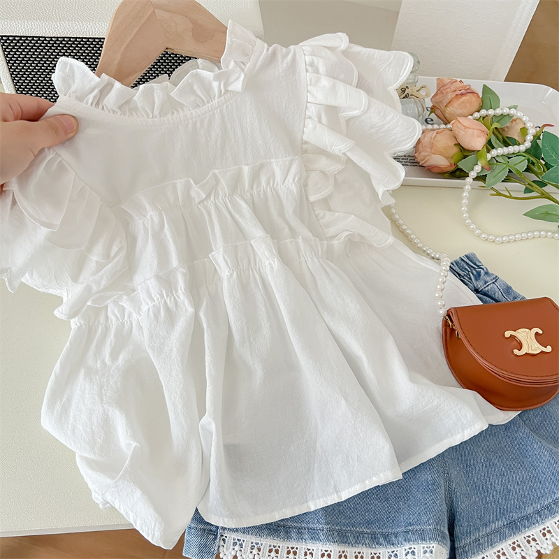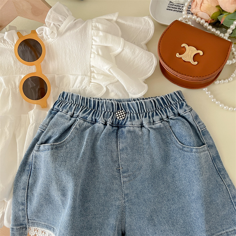【韩版白色短袖蓝色短裤,夏季超高效潮范!】2024夏季白色韩版女童 纯色棉潮范 圆领短袖夏季 白衬衫蓝色可爱短裤-QQ