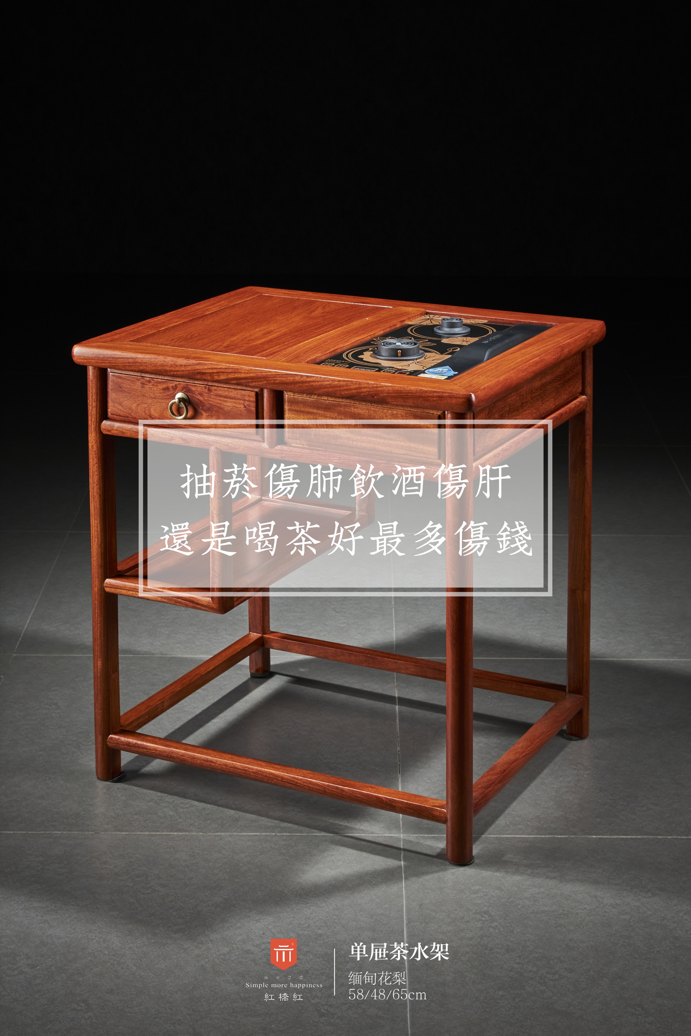 茶水架面是采用框架式的结构,顶部一侧面板可置物,一侧做内嵌式电磁茶炉,面板左侧设抽屉一具,抽屉下设置小层架,可用来陈列茶具,茶叶、摆件,文玩等器物,整器古典雅致,可放置于茶桌一侧。