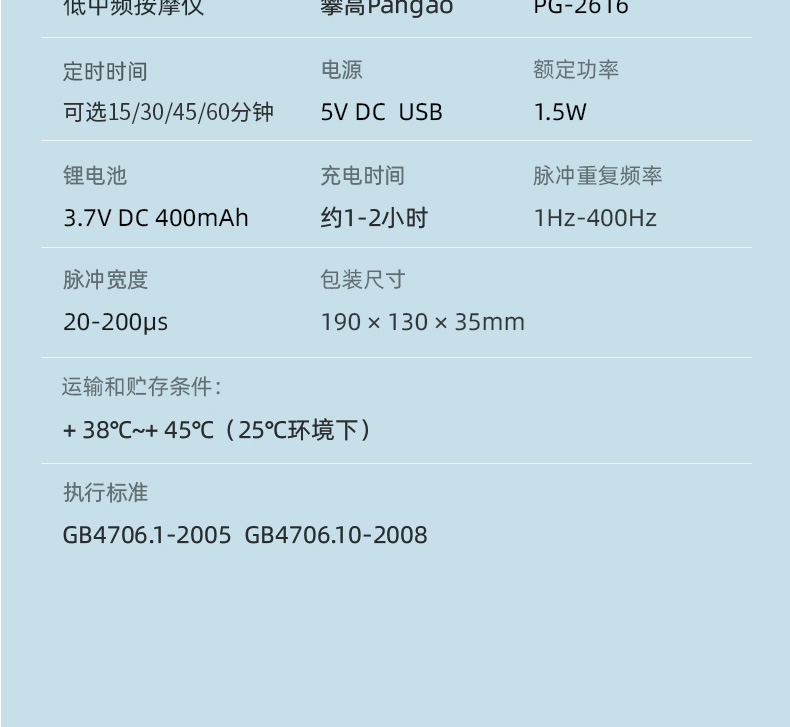 攀高中频按摩仪双通道PG-2616(充电款)电疗仪脉冲颈椎腰部按摩仪