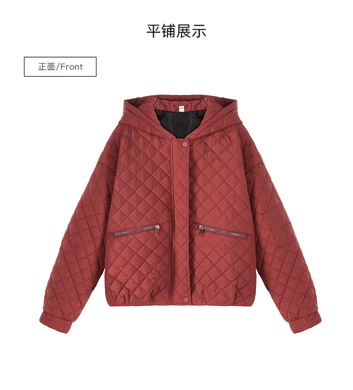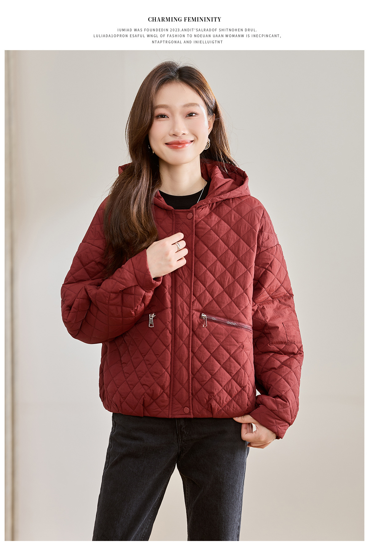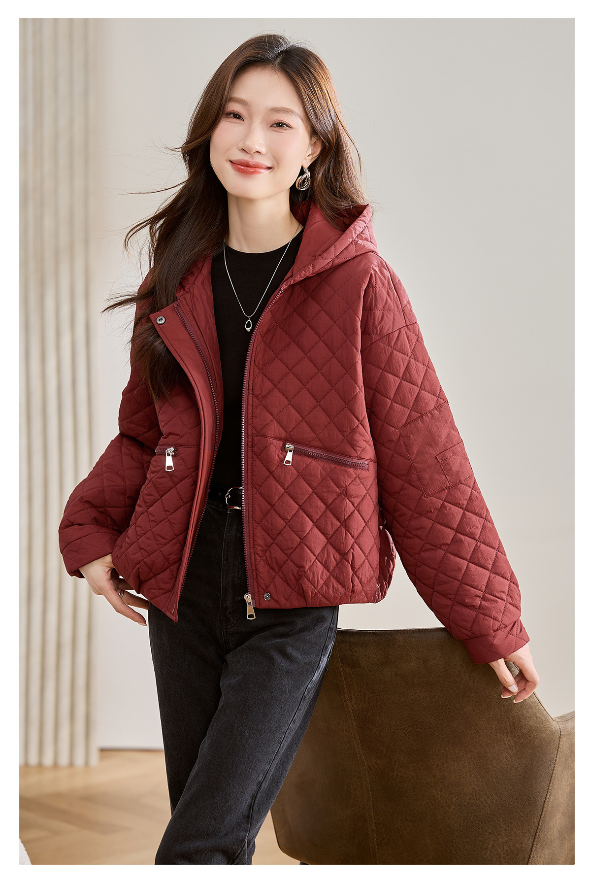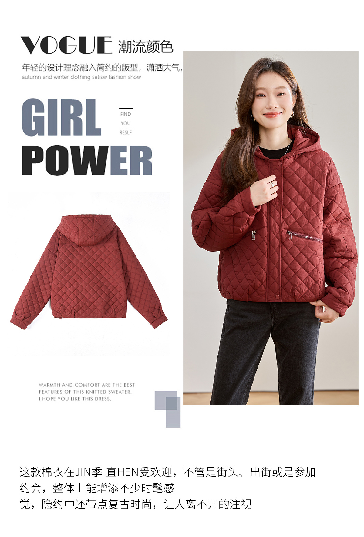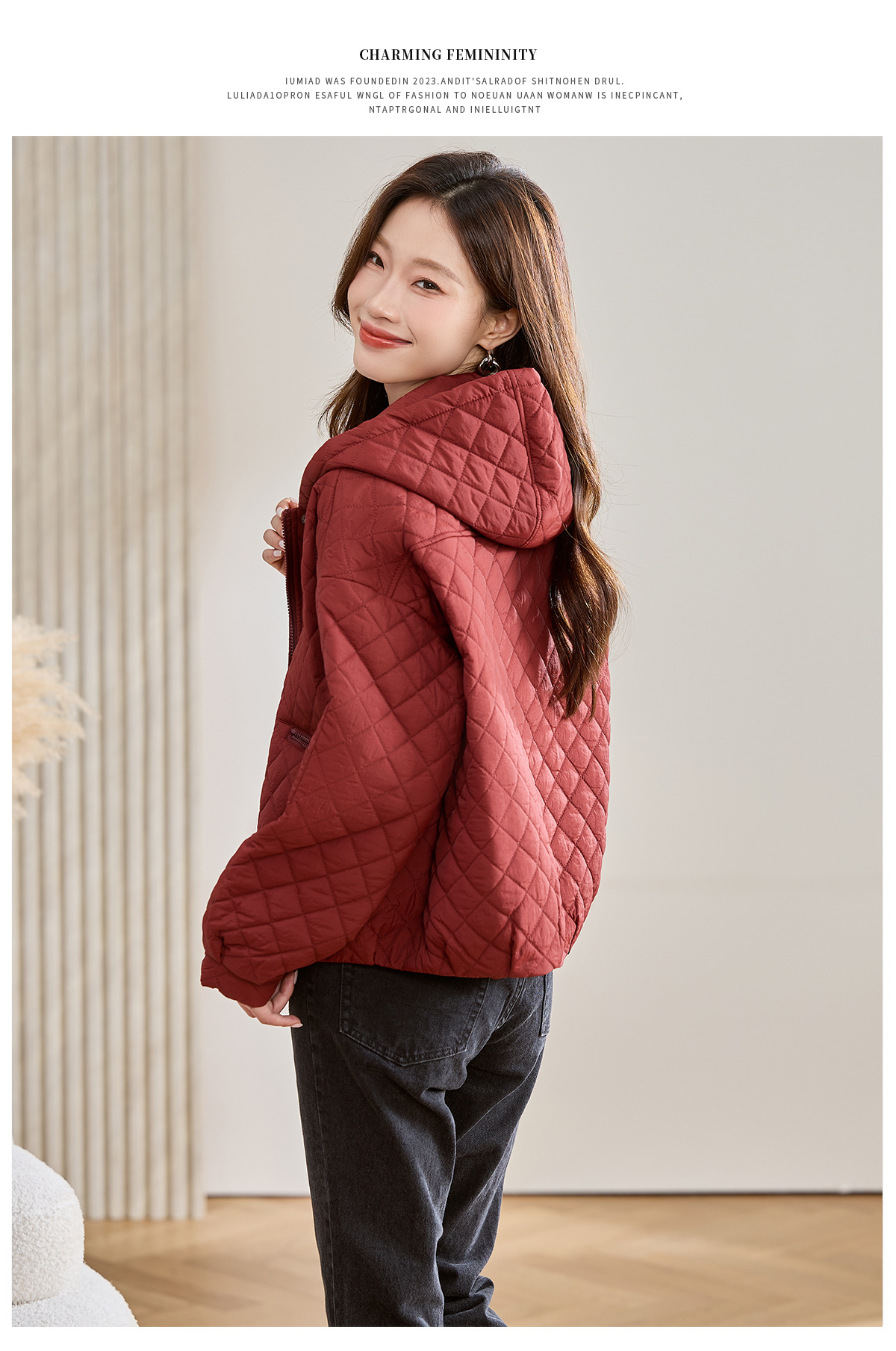 WXN5631红色轻薄棉衣外套女2025冬季新款洋气百搭显瘦夹棉菱形格连帽棉袄