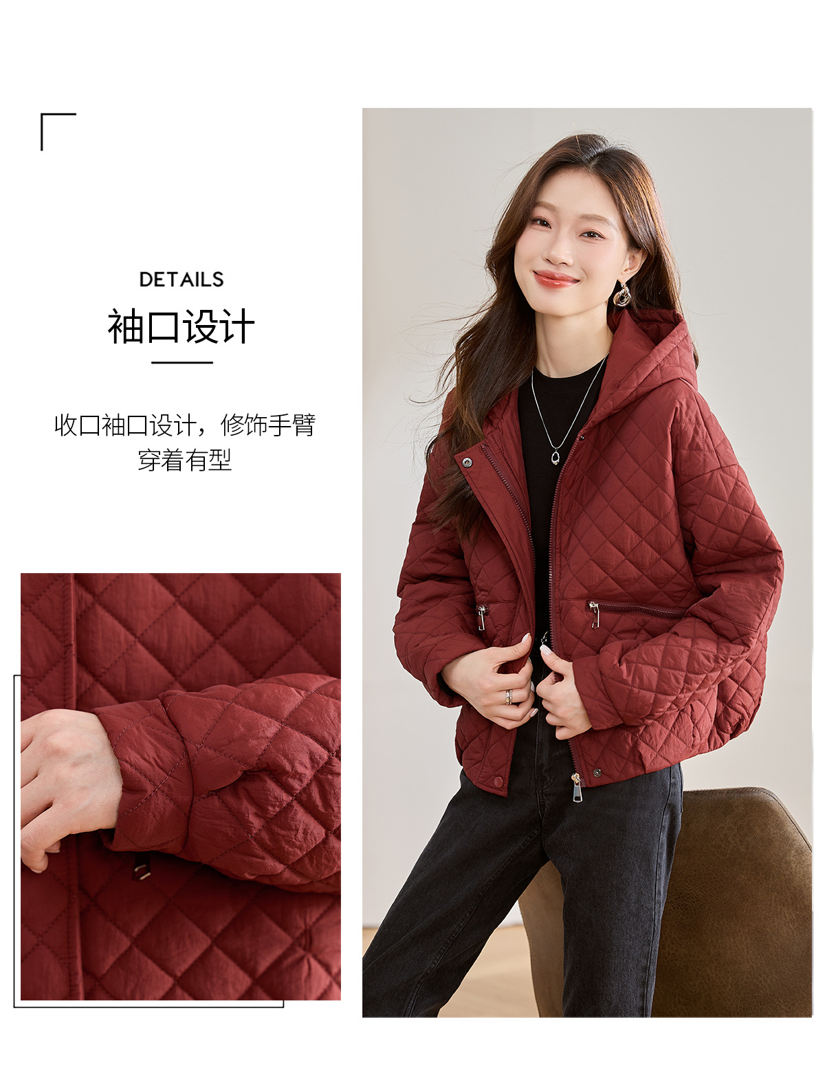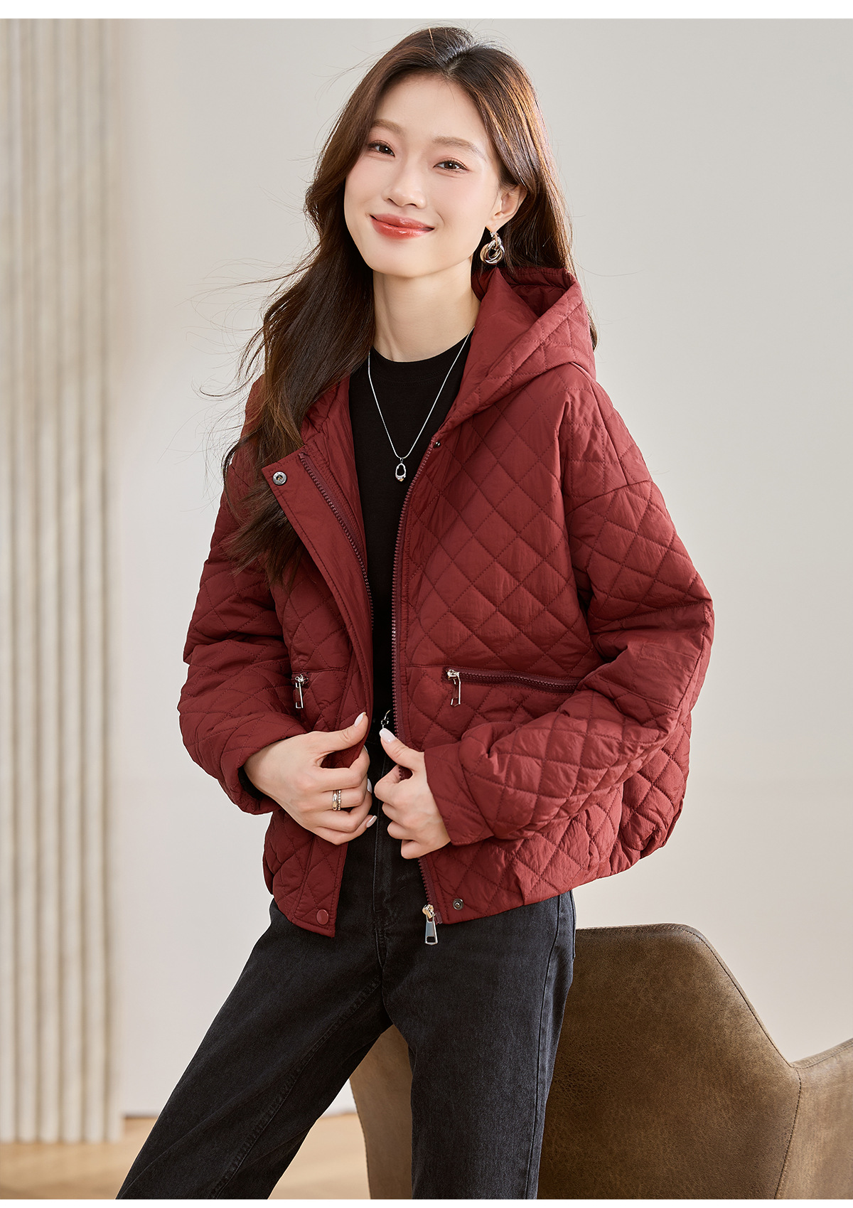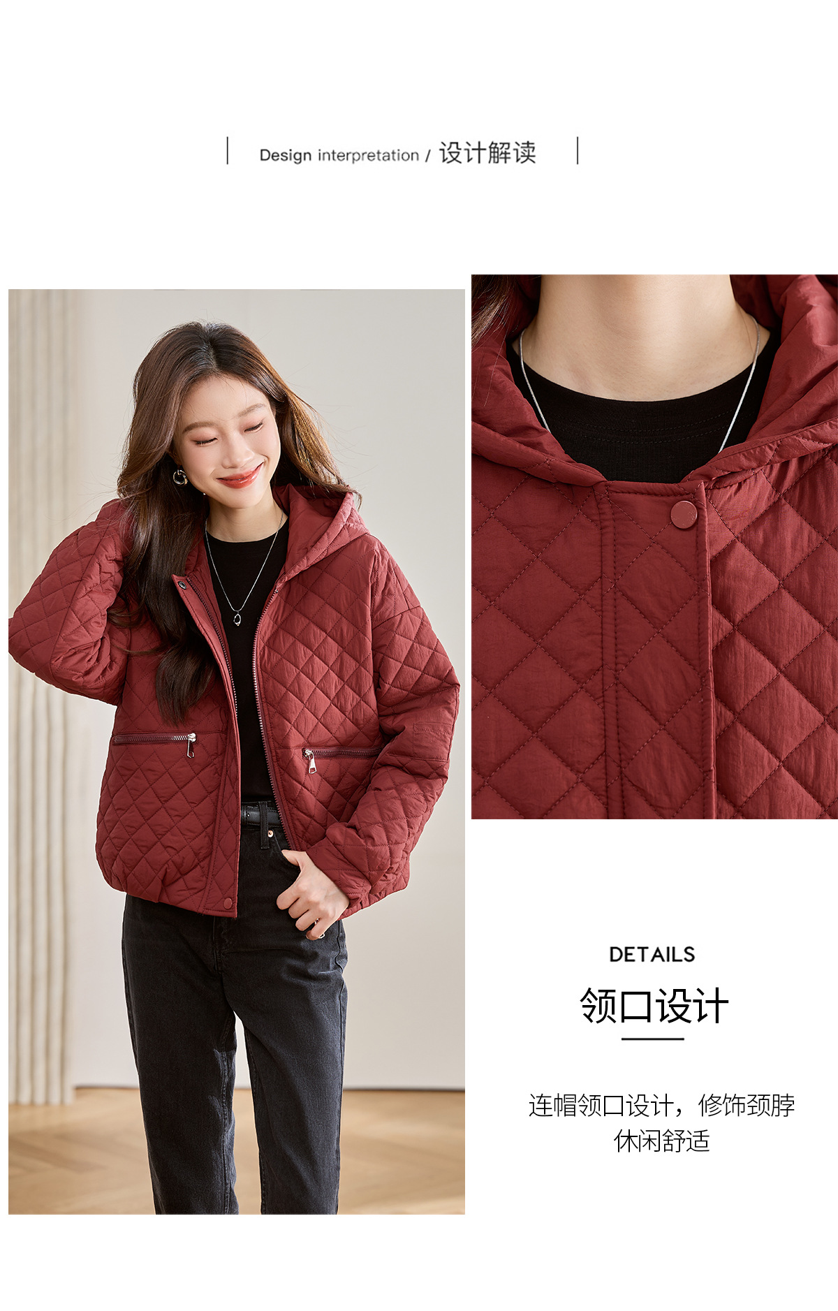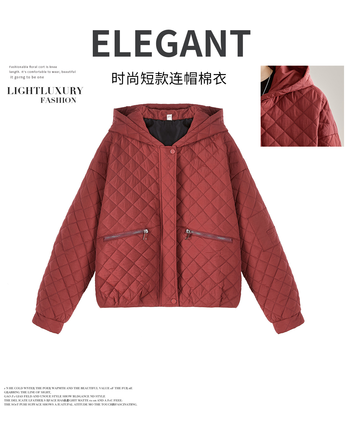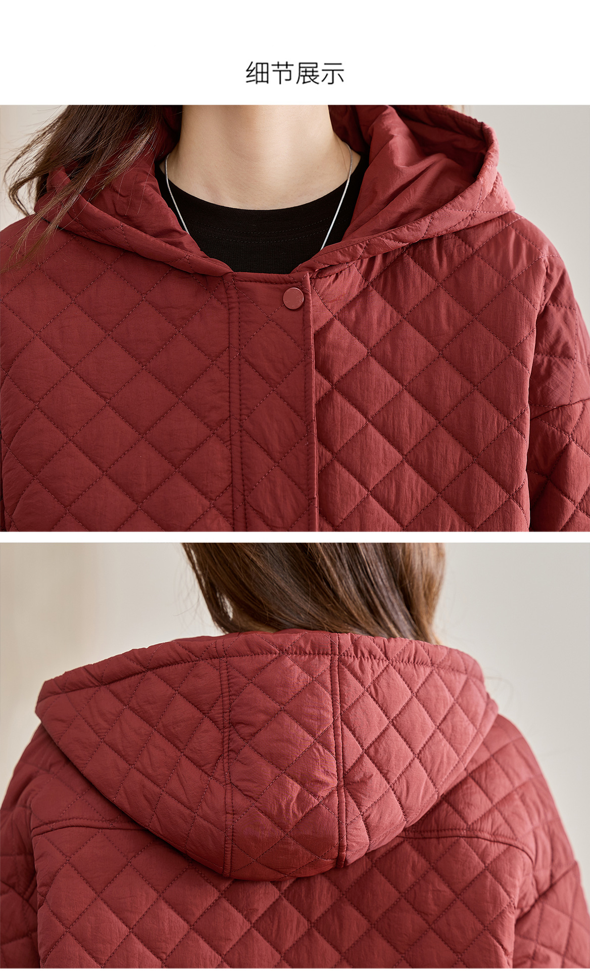WXN5631红色轻薄棉衣外套女2025冬季新款洋气百搭显瘦夹棉菱形格连帽棉袄