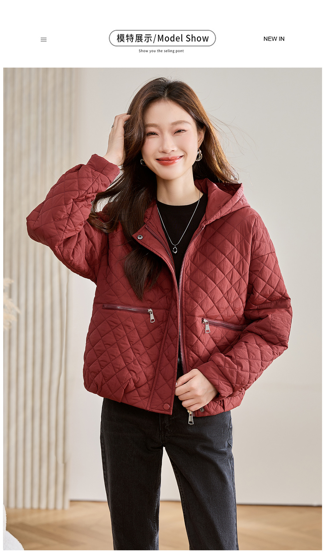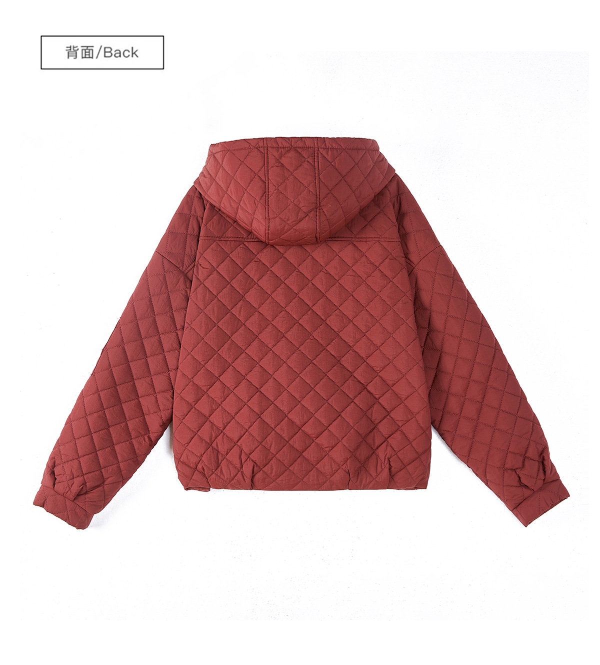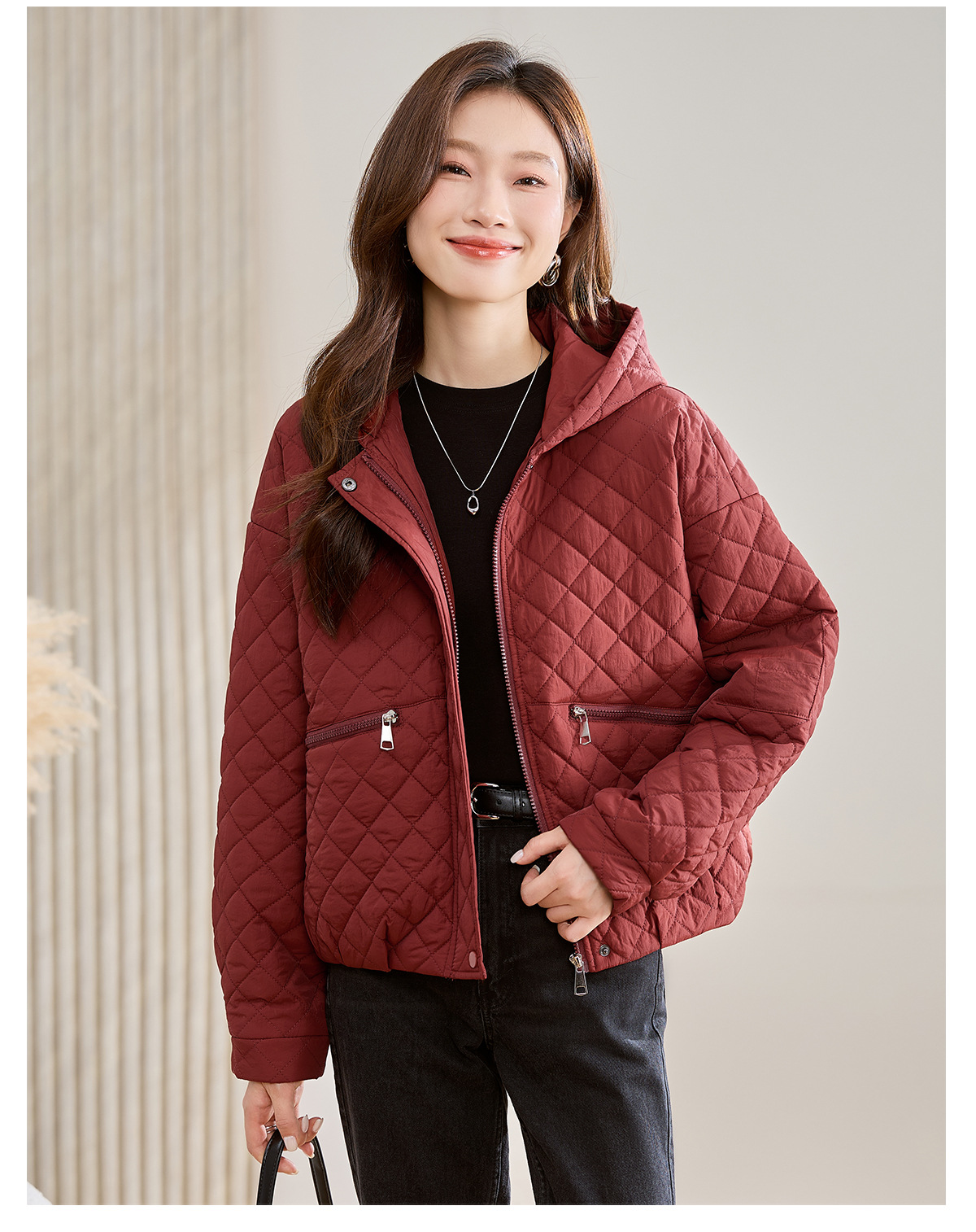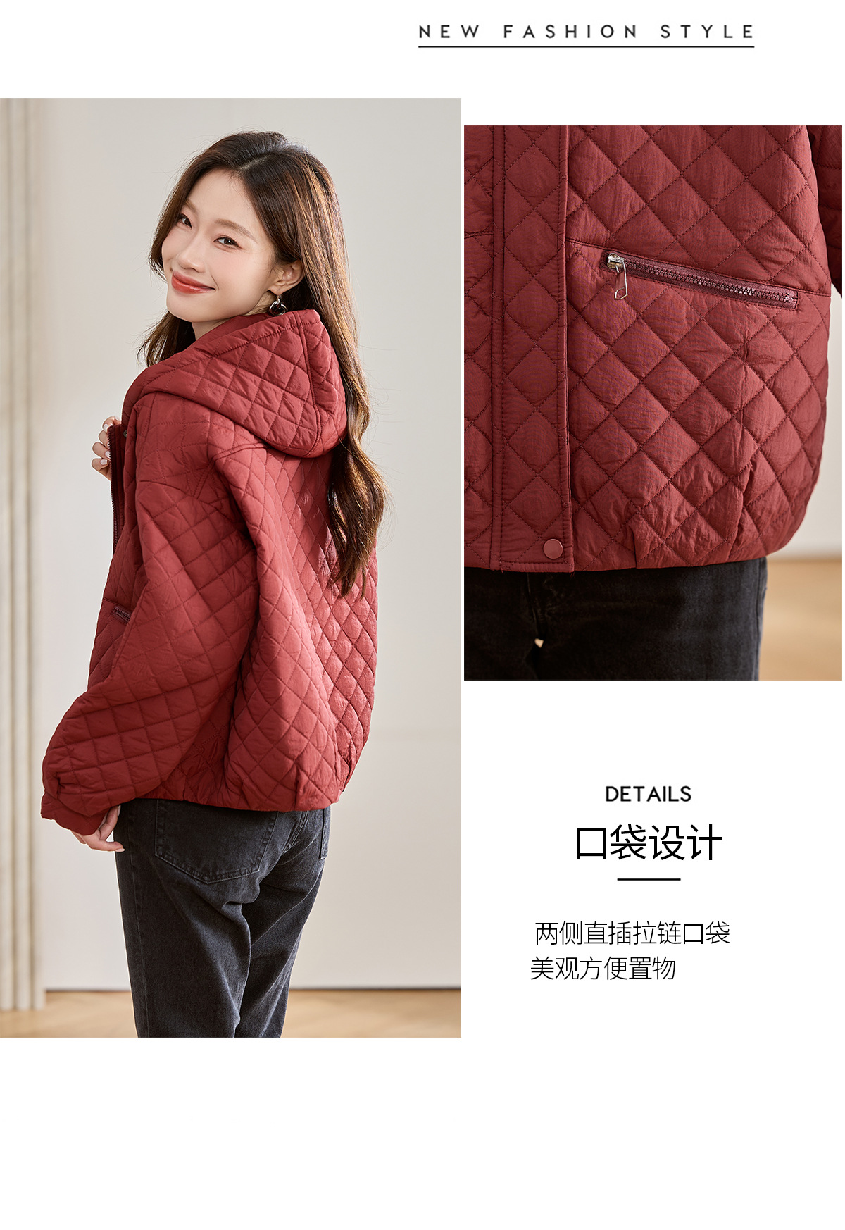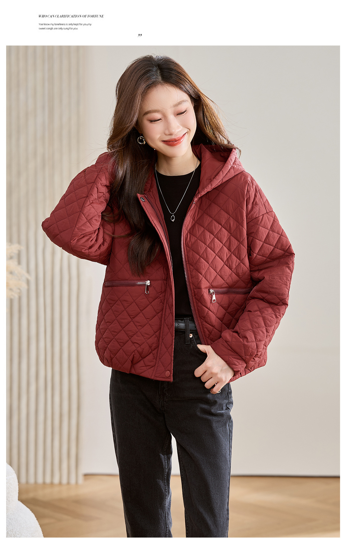 WXN5631红色轻薄棉衣外套女2025冬季新款洋气百搭显瘦夹棉菱形格连帽棉袄