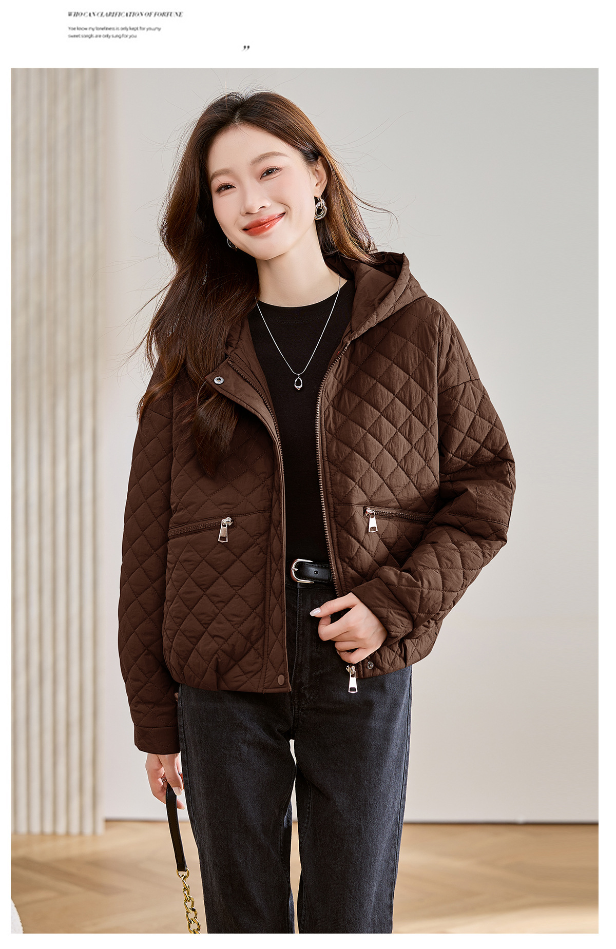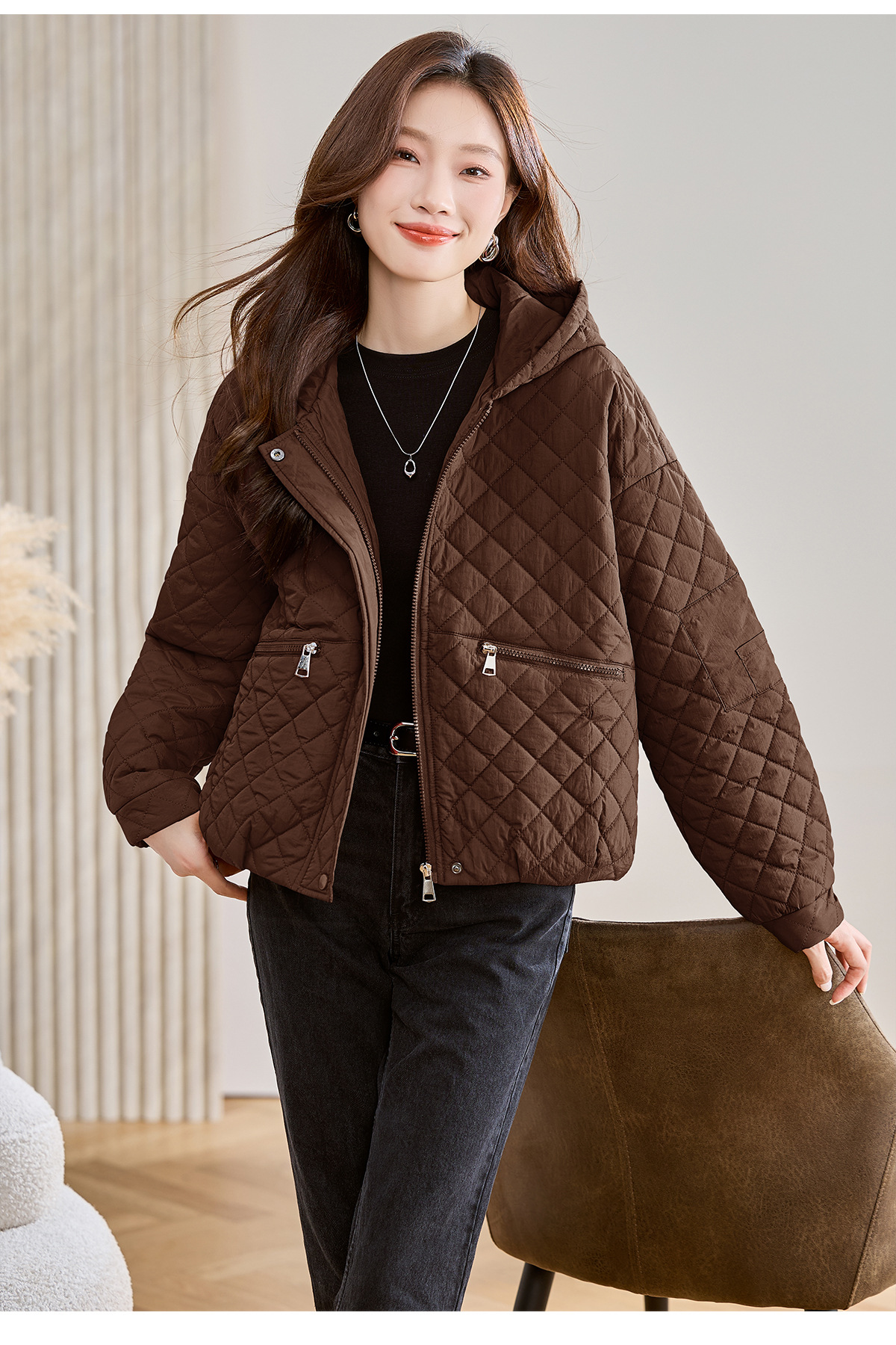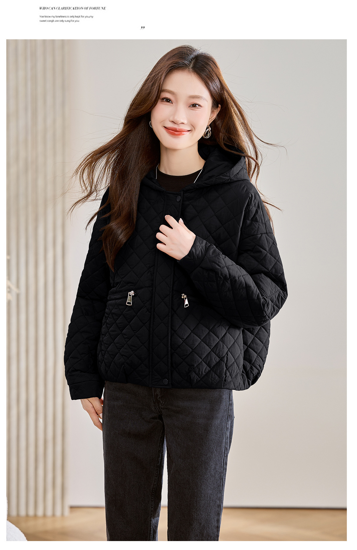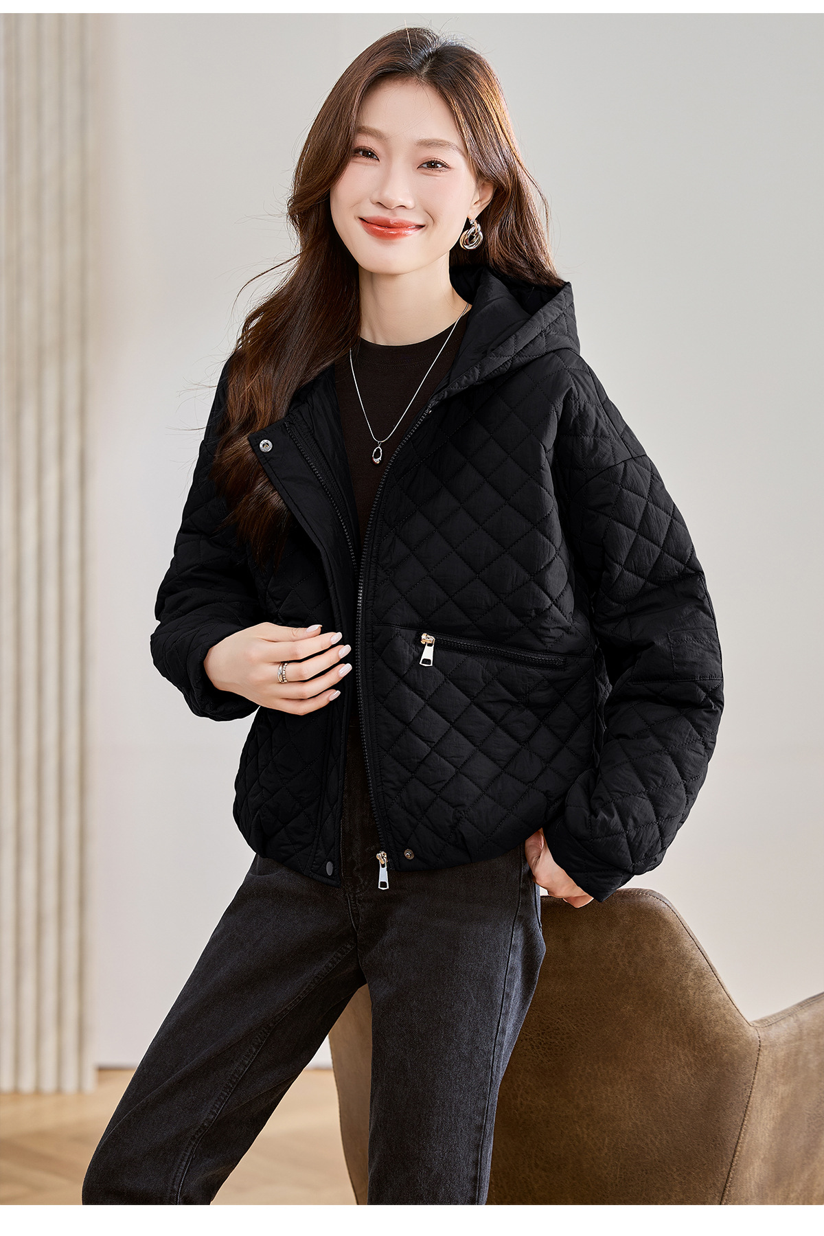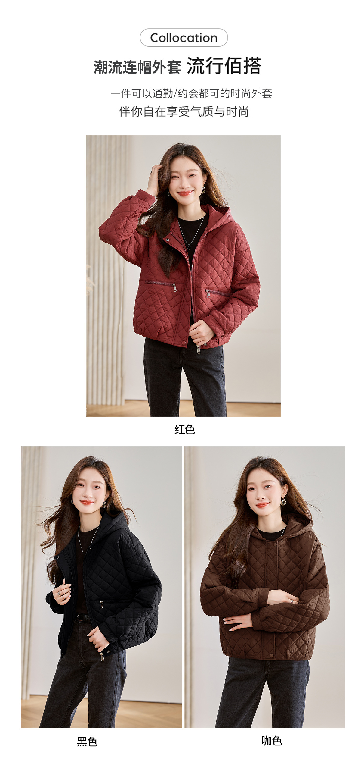 WXN5631红色轻薄棉衣外套女2025冬季新款洋气百搭显瘦夹棉菱形格连帽棉袄