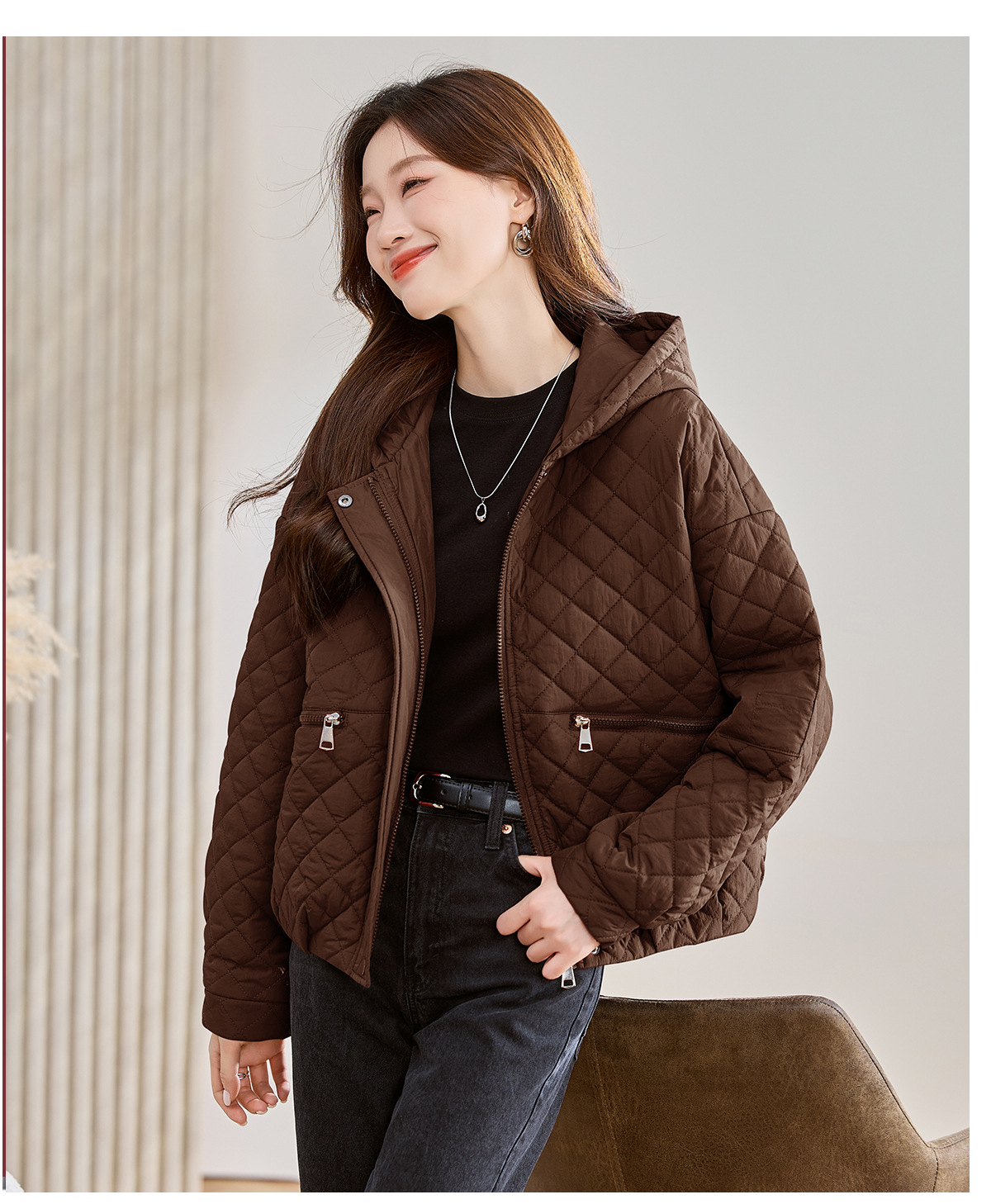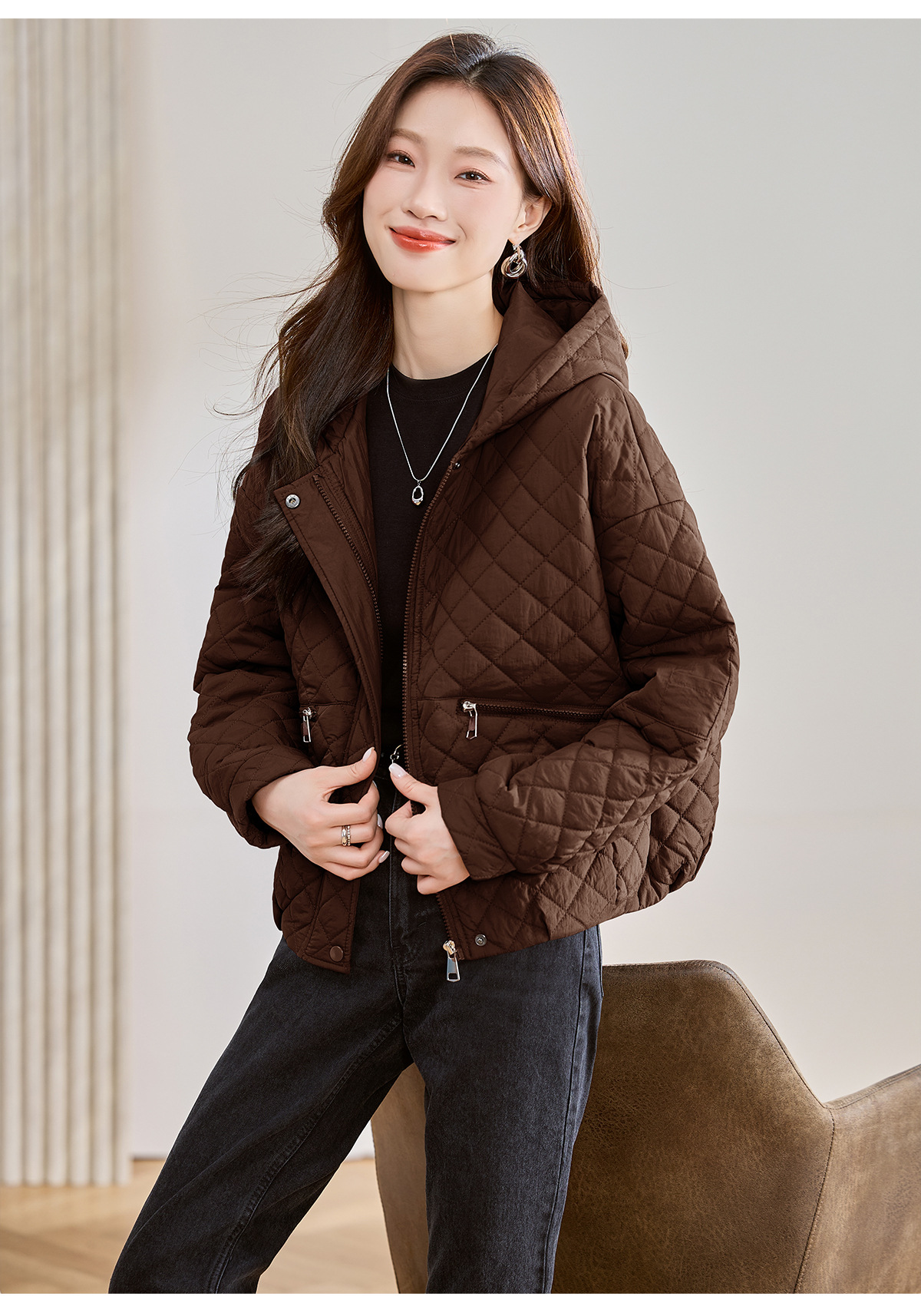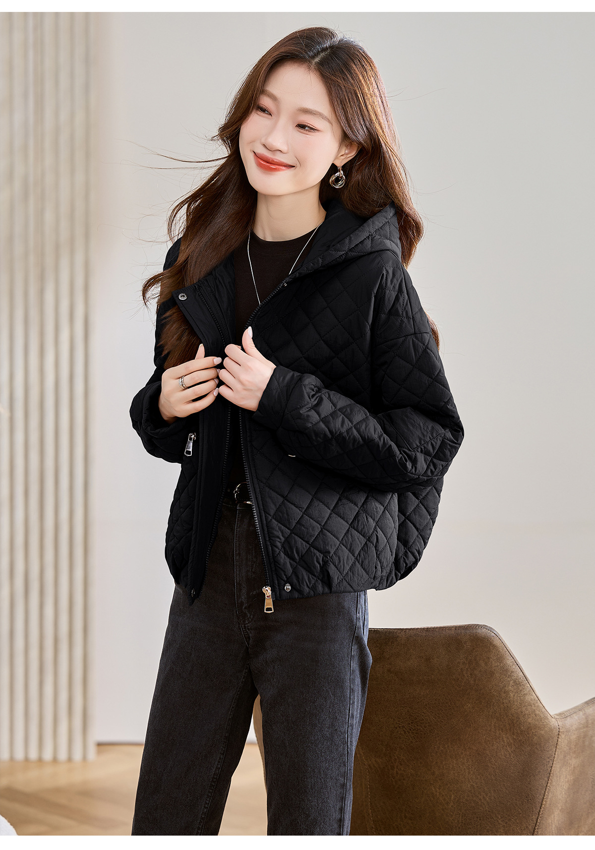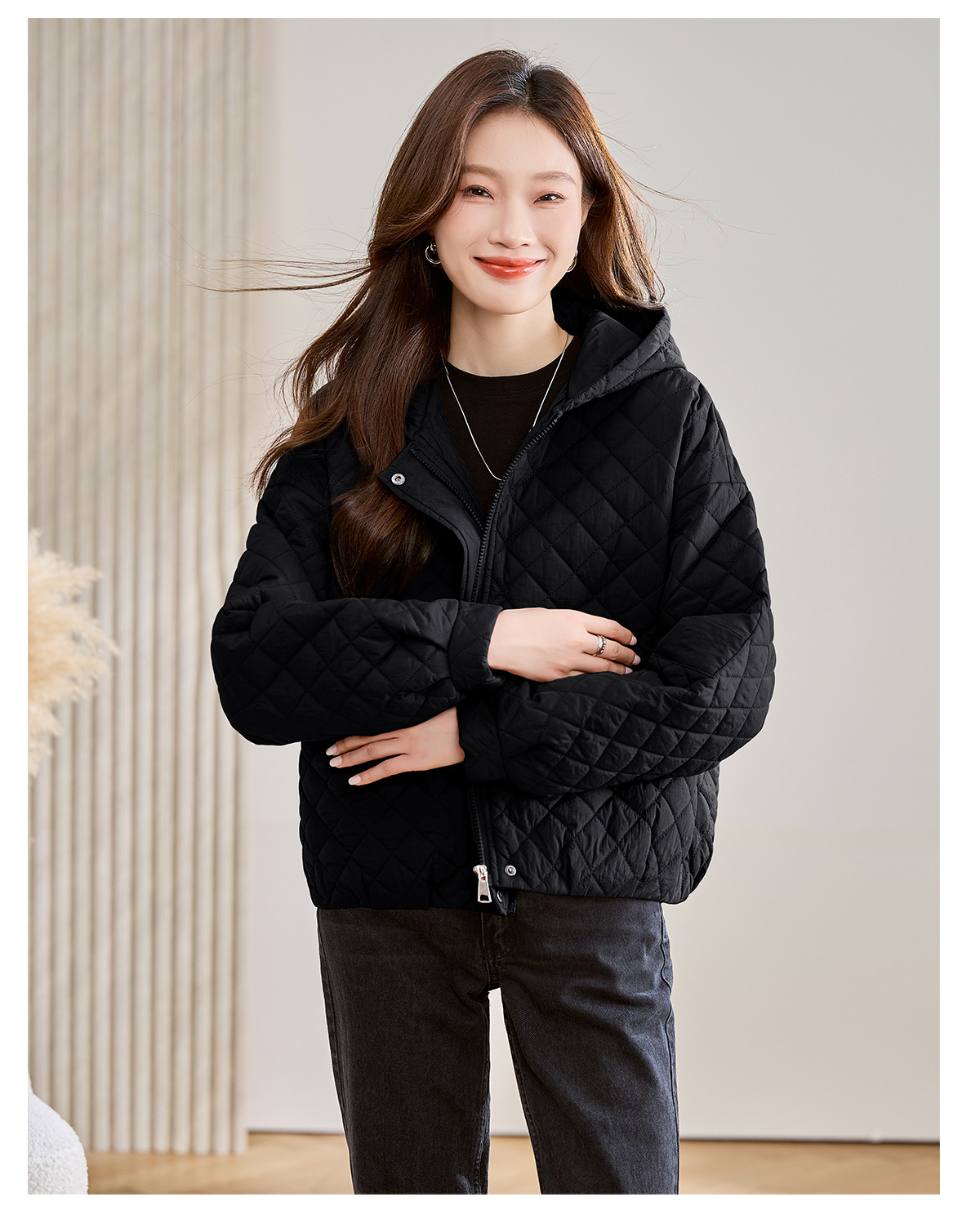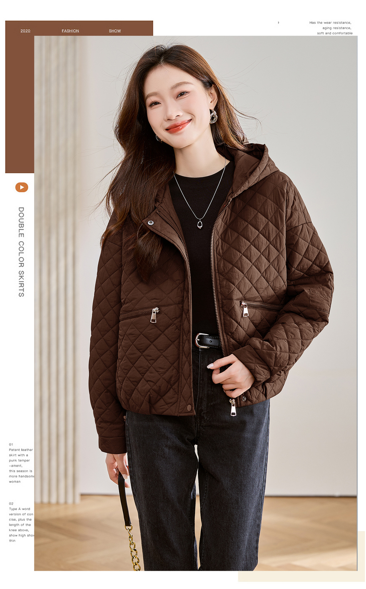 WXN5631红色轻薄棉衣外套女2025冬季新款洋气百搭显瘦夹棉菱形格连帽棉袄