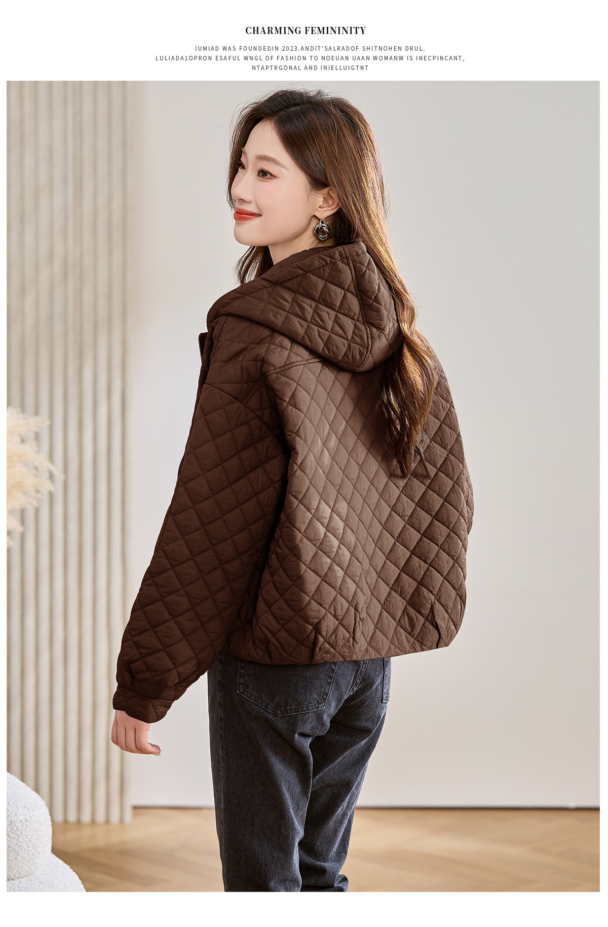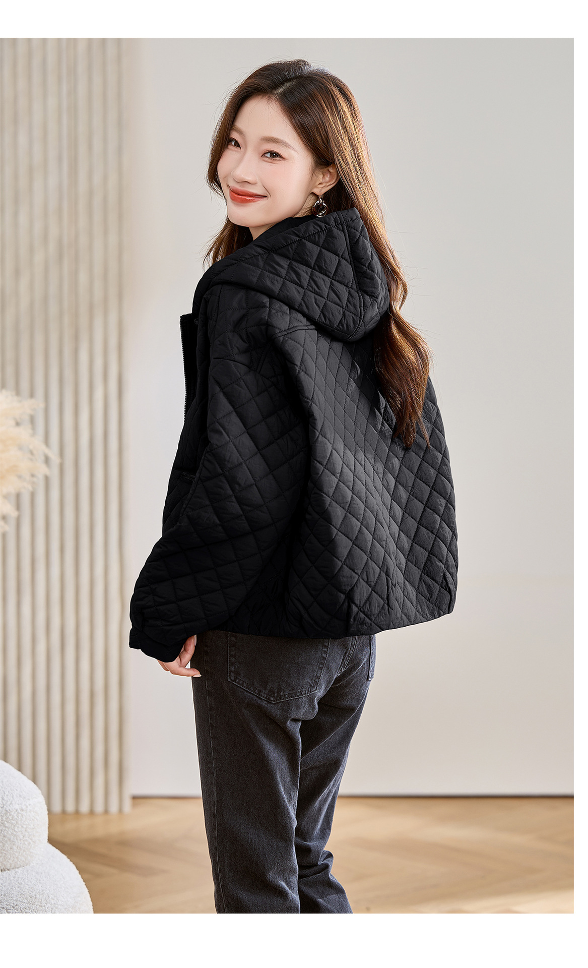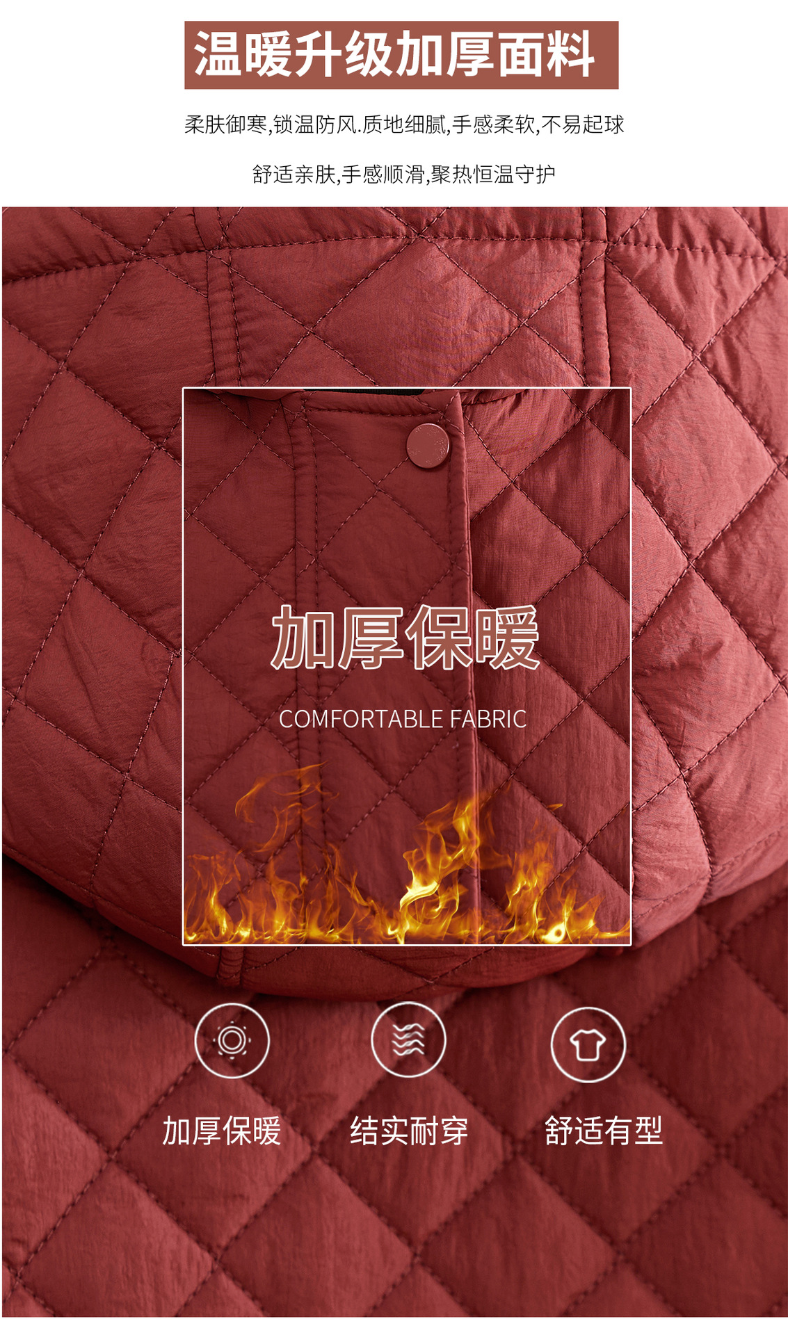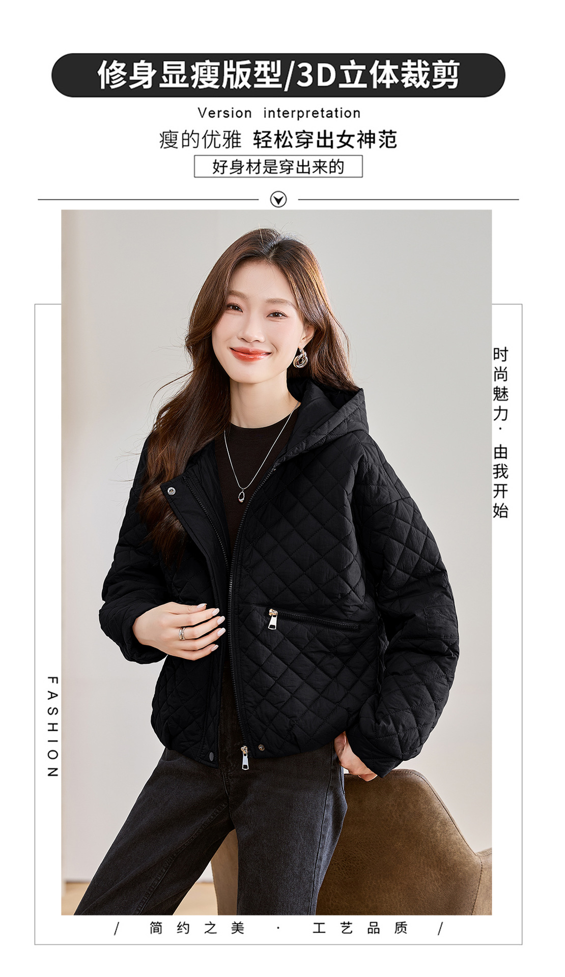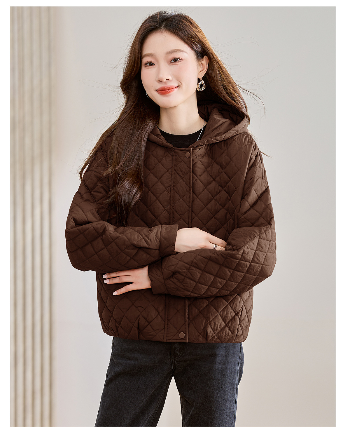 WXN5631红色轻薄棉衣外套女2025冬季新款洋气百搭显瘦夹棉菱形格连帽棉袄
