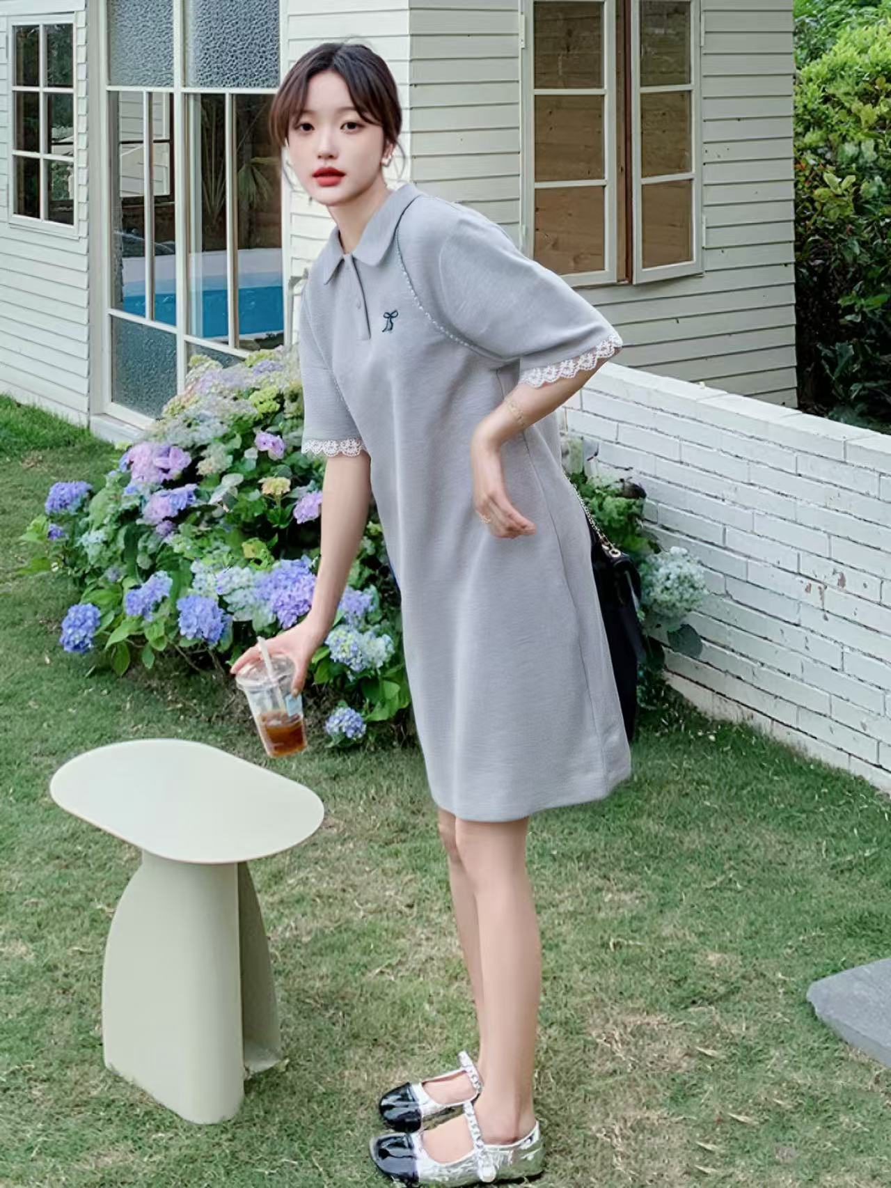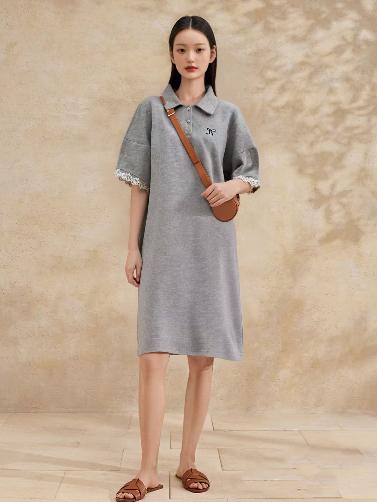 【限八一促】特惠 设计师品牌-Polo领拼接蕾丝花边设计感刺绣卫衣连衣裙5595-喜出
