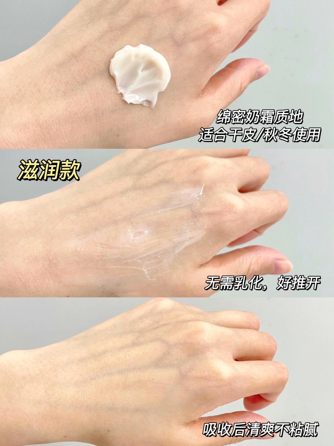 ✅滋润款:绵密奶霜的质地,不厚重好推开,更加保湿,比较推荐干皮秋冬使用