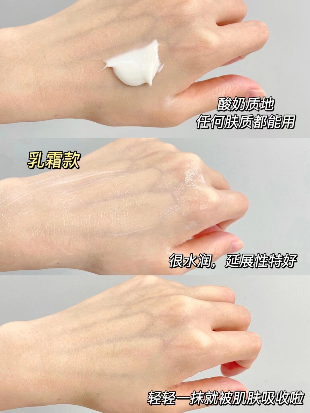 ✅乳霜款:轻盈的酸奶质地,水润润的,吸收超快,肤感清爽!全肤质使用都无压力