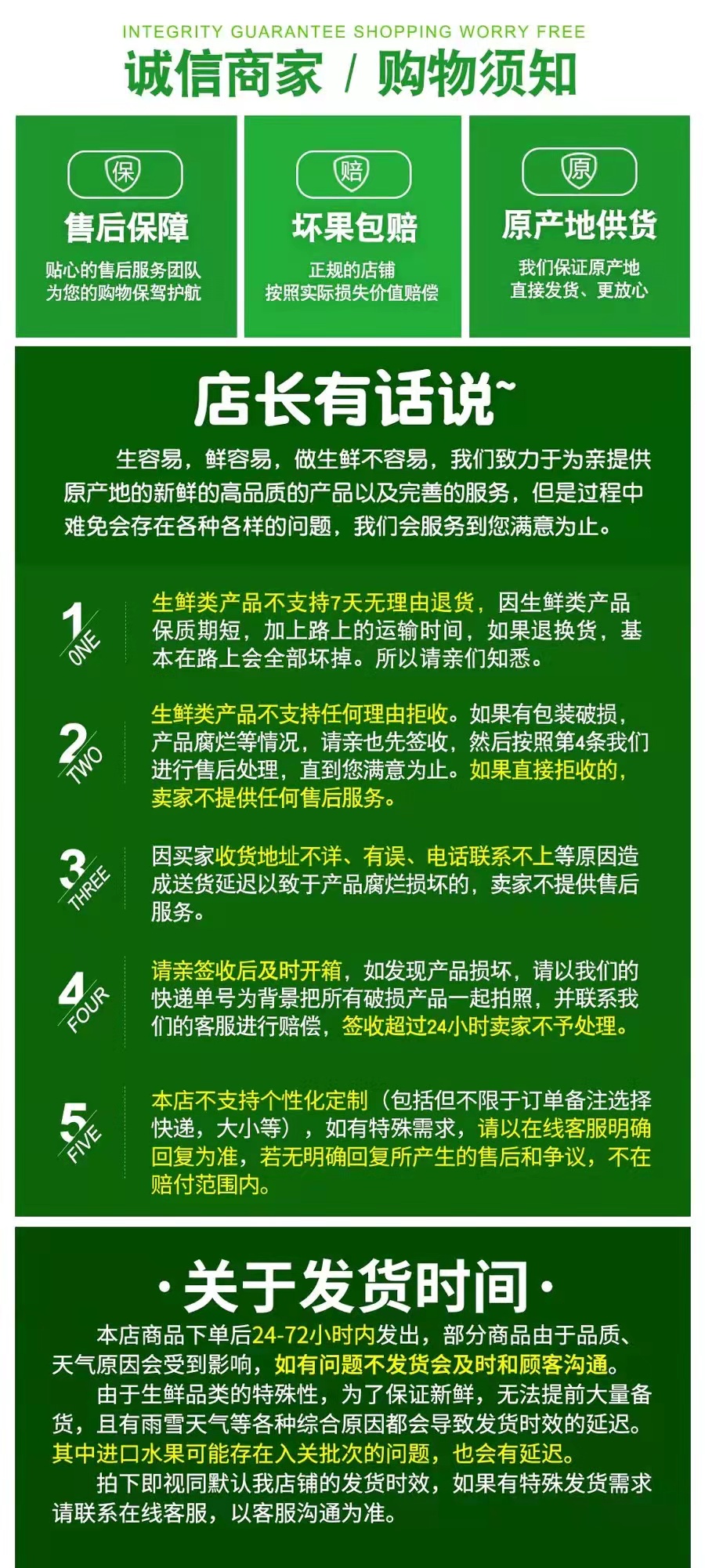 特别说明:由于生鲜水果市场价格波动较大,价保时间为:付款成功之后72小时之内联系客服有效,以付款成功的时间为准。