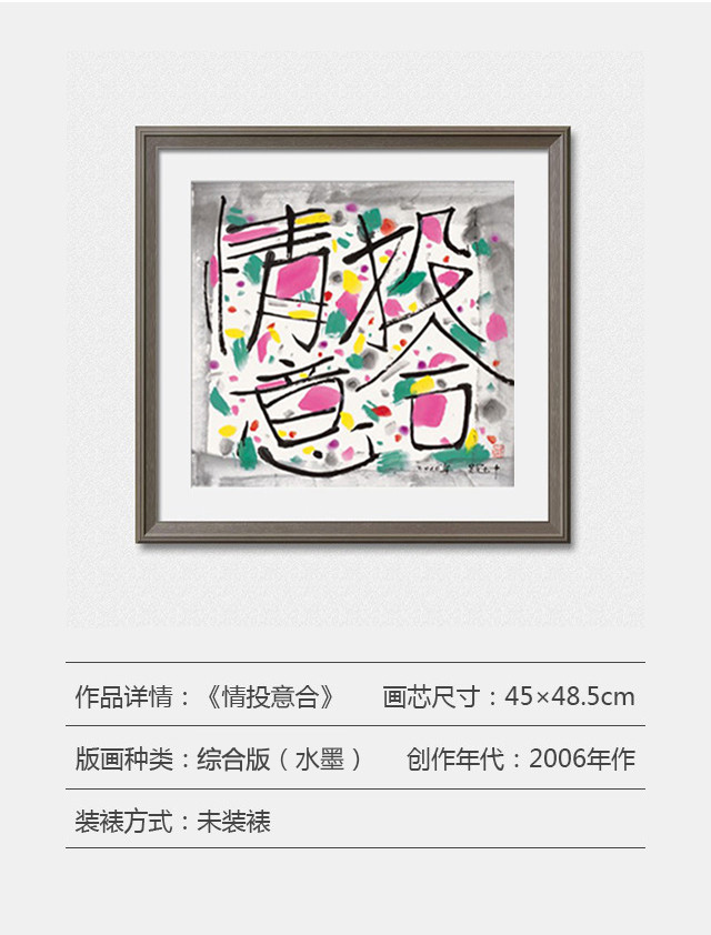 在这幅画中,吴冠中用书法的形式描绘了“情投意合”这四个字,画面构图饱满、结构匀称,运用了红与绿、黄与紫两队互补色,一眼看去,更加新颖。画面寄托了吴冠中对新人的祝福,也寄托了他对知音的寻觅。