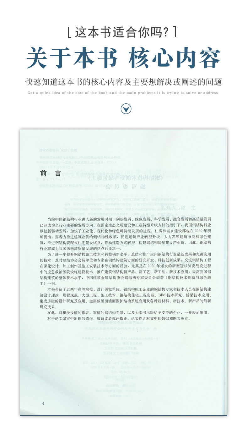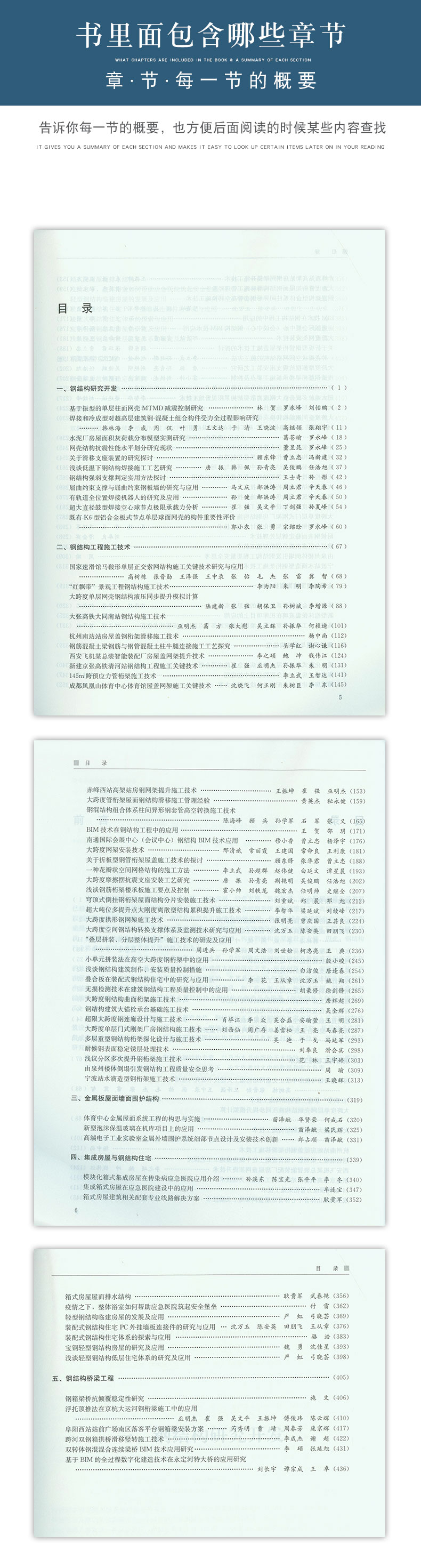 本书共分五大部分,从钢结构工程研究开发、钢结构工程施工技术、金属屋面墙面围护结构系统工程、钢结构住宅与集成房屋工程、钢结构桥梁工程方面,介绍了国内近几年在钢结构和绿色施工中的设计理论、规程规范、BIM技术研究、桥梁技术应用及新材料、新技术、新产品的最新研究成果;对近两年建设竣工的机场航站楼、大剧院、会展中心、超高层建筑、组合桥梁结构、集成房屋等工程,介绍了其中钢结构施工技术研究与应用的最新实践经验。 本书对于从事钢结构的研究、设计、施工和管理工作的从业人员会有所帮助和启发,对钢结构专业的师生具有参考价值。