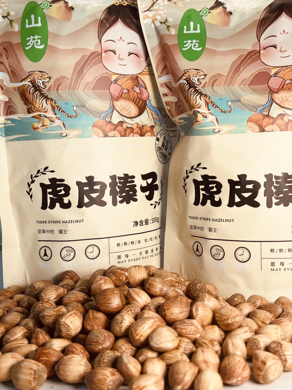 虎皮榛子的果粒个大肉厚,每一颗饱满有分量。元气满满的健康美味,欢乐必备。老人爱吃元气满满,吃的滋味品的开心;小孩爱吃元气满满,好吃健康与家人共分享。