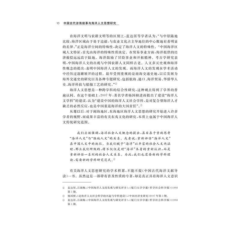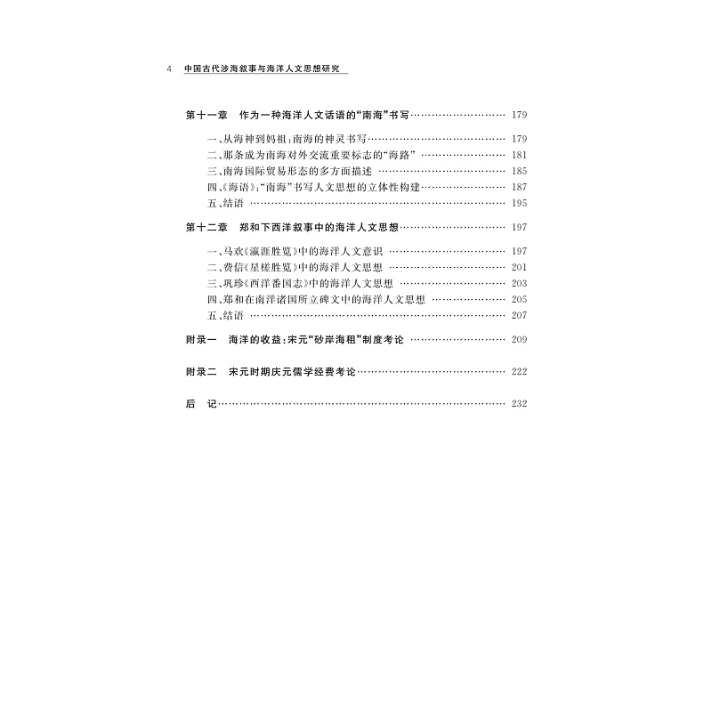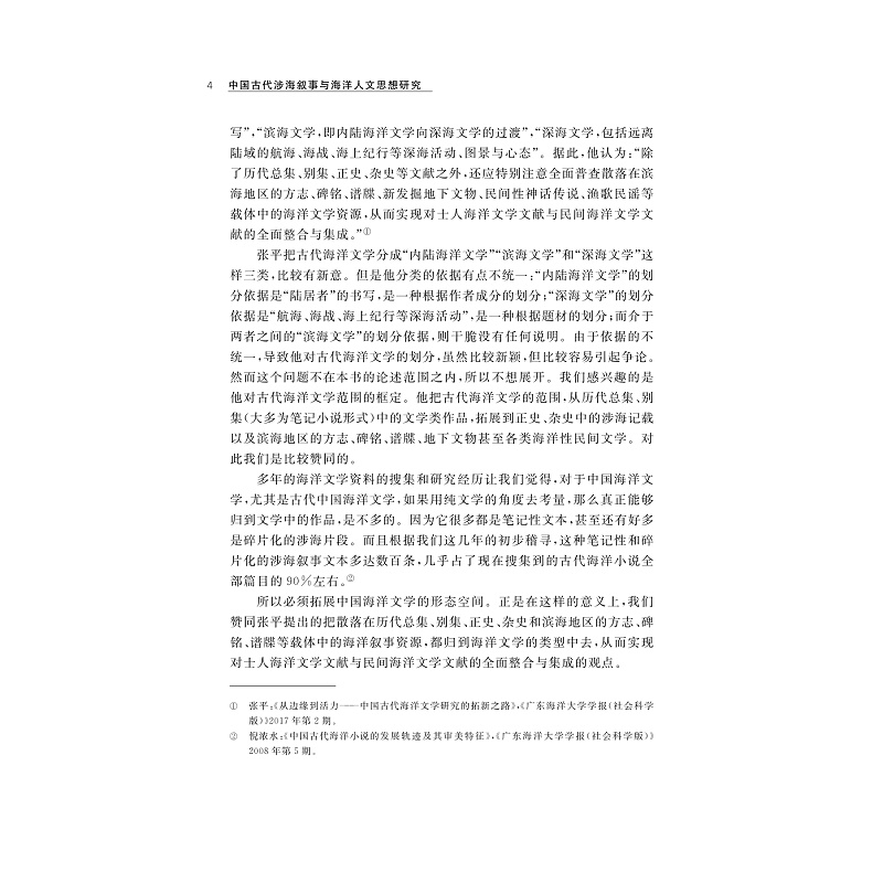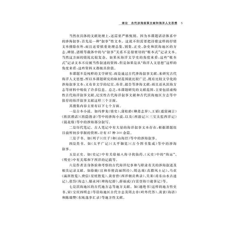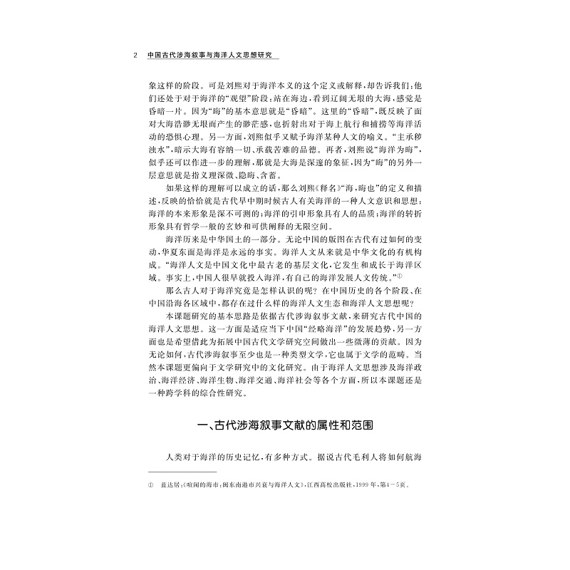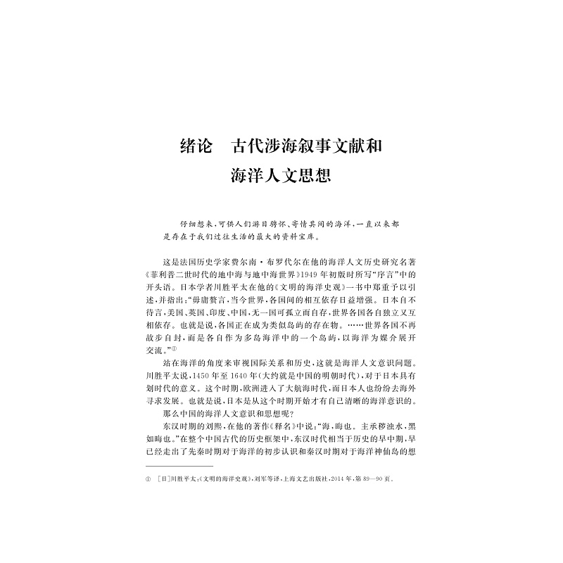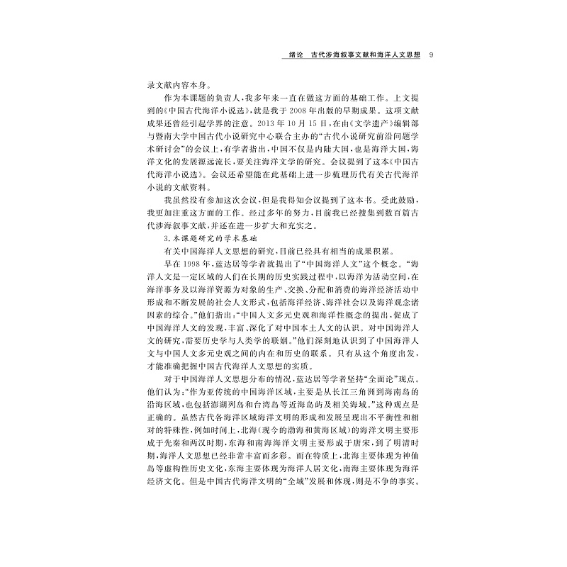 教育部人文社会科学研究规划基金项目(16YJAZH047)研究成果。中国自古以来就是内陆文明和海洋文明并存的伟大国家,在当今国家海洋战略的时代背景下,中国也正从传统的内陆文明为主的国家,走向海陆共同发展的综合性国家。经略海洋需要深刻地认识海洋。xijingping指出,“要进一步关心海洋、 认识海洋、 经略海洋, 推动我国海洋强国建设不断取得新成就。”本书以涉海叙事古文献为基础,通过分析这些古文献所包含的各种海洋信息,来分析和探究古代中国的海洋人文思想,涉及古代海洋文学思想、古代海洋经济思想、古代海洋社会意识、古代海洋习俗形态等等,形成一个综合性的海洋人文思想研究,具有较高的学术价值与创新性。