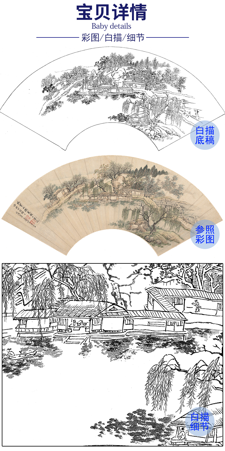 工笔画白描底稿 扇面小品 清 王翚 山水图 SR37