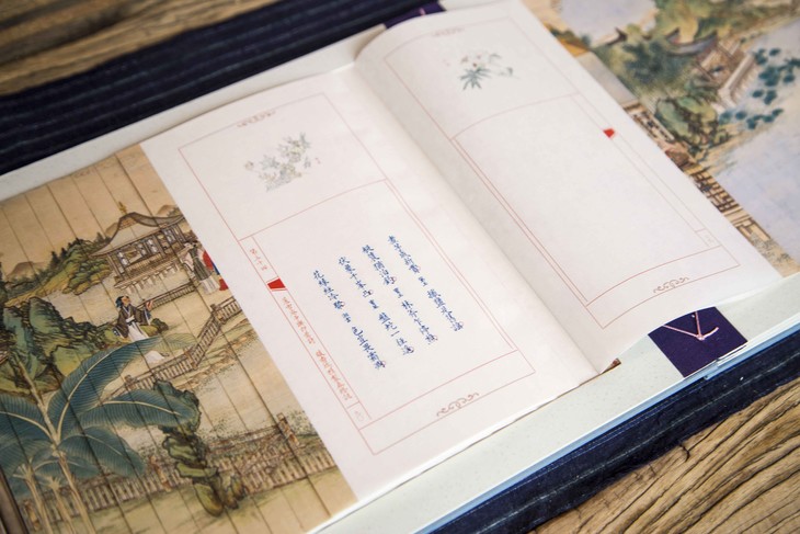 内页设计:传承并创新将原龙身的单片叶子改为筒子页,并于叶子鳞口正反两面配以精美画卷,将典籍、书法、绘画、装帧技艺完美融于一体。运用现代先进的宣纸印刷技术,纯手打造而成。