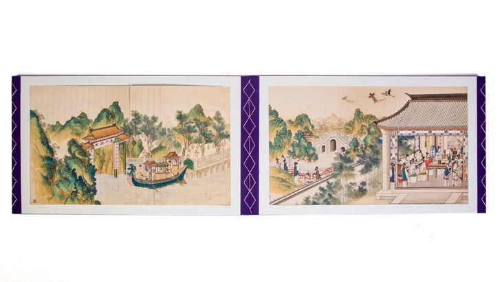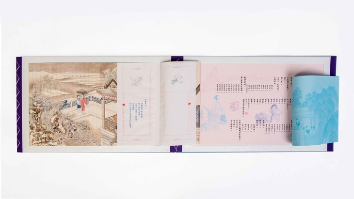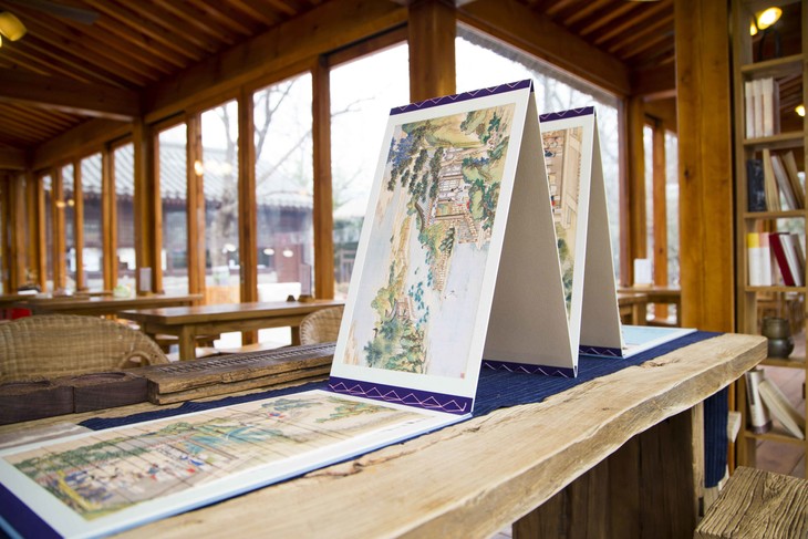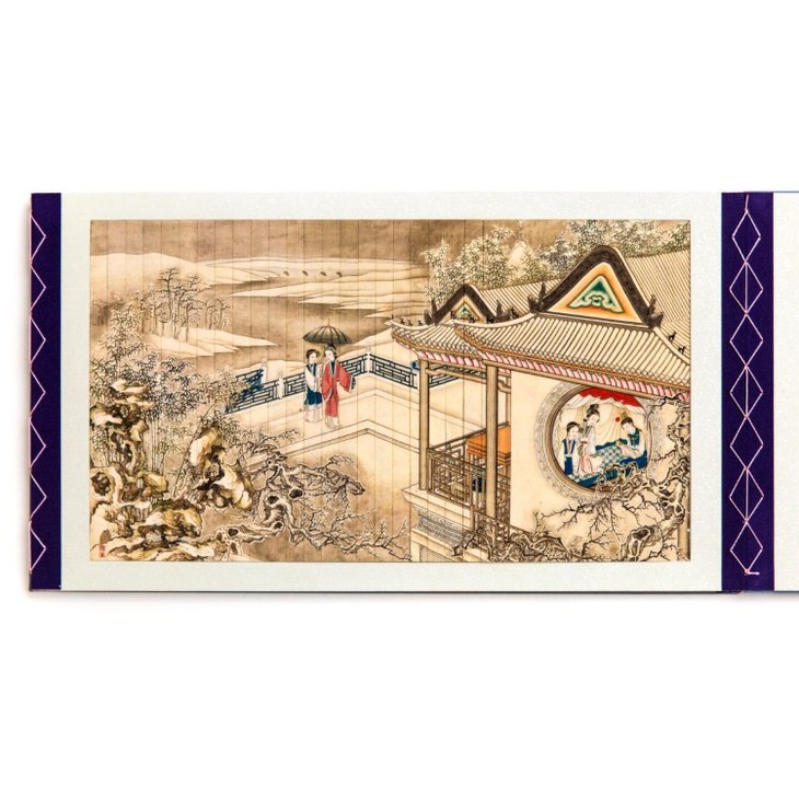 《红楼梦诗词》总共三折,打开3.18米,8幅美图,77首诗词。海棠结社,持蟹咏菊,大观园里最繁华最风雅的生活,收入这本大书。每一页的页边都取孙温图书的一部分,册页依次排列,页边严丝合缝地组成一副完整的图画,一副书页完整地翻过来,又组成另一幅美轮美奂的画面。这样一本书籍艺术品放在家里,人就和几千年的中国生活美学传统接上了血脉。