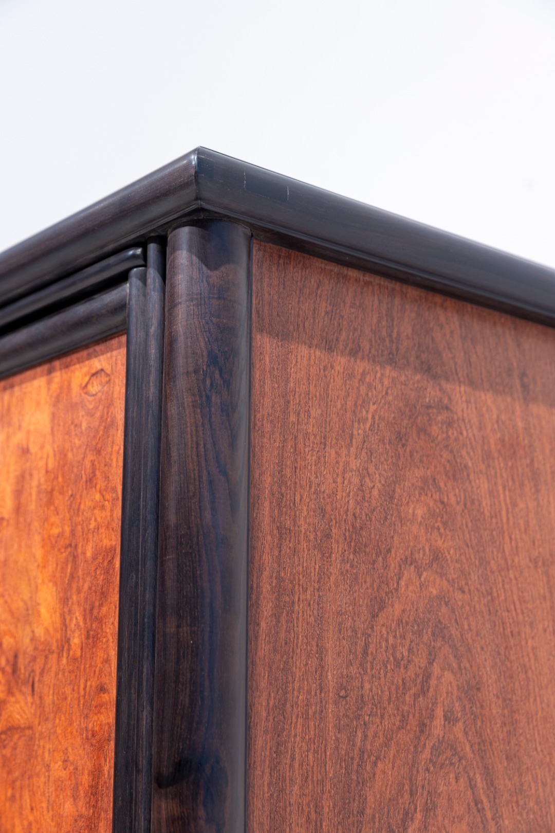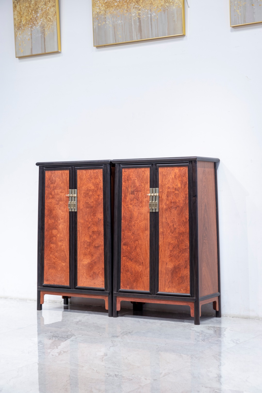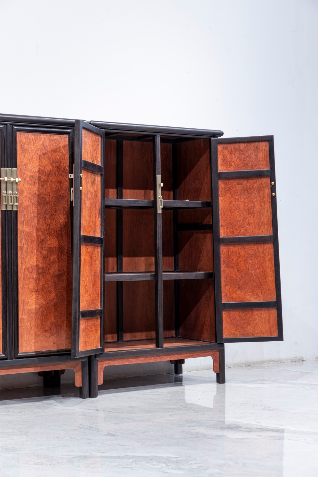 此柜整器全身光素,做撞色效果,四边框之材皆取紫光檀(东非黑黄檀),质坚材硬,暗纹迷人,嵌夹鲜丽缅甸花梨(正宗大果紫檀),赏之如姚黄魏紫。柜帽顶部平镶装板,可摆放器物,柜帽及柜门边抹混面,上下压边线,素牙头。