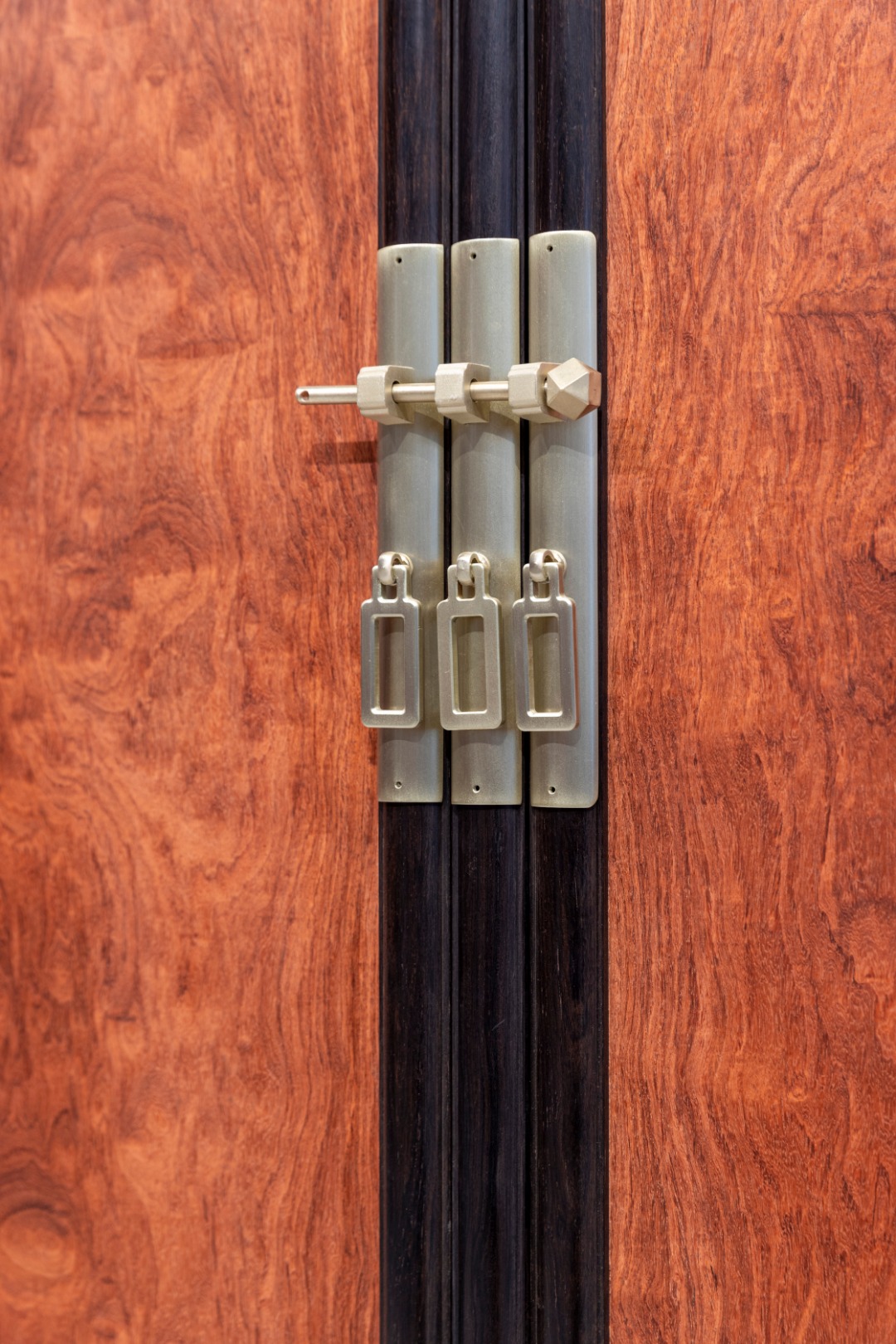 柜门采用木门轴结构,可实现柜门自动闭合。柜门一木对开,纹理对称,有闩杆,中部搭配铜拉手。两扇木轴门,皆攒框打槽镶独板面心,边沿起阳线,细节考究精致,门板内面有穿带加固。柜内上部设抽屉两具,下设有屉板,分隔空间。此柜侧脚显著,腿足外圆内方,柜腿间四面安光素刀牙板。此柜为木轴门柜的最基本式,整体造型简约明朗,意呈材质自然天趣。