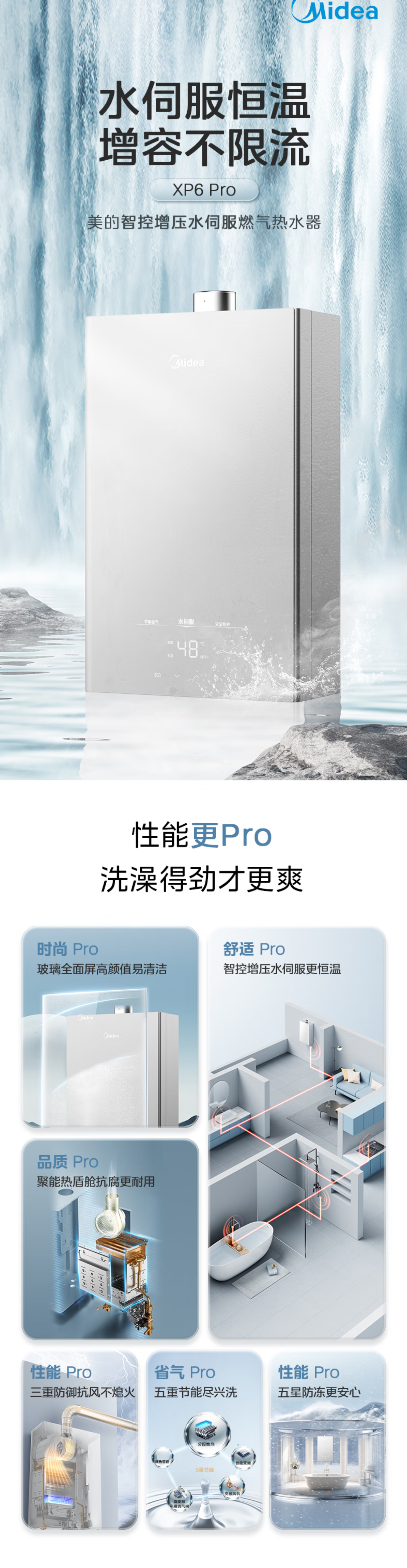 美的(Midea)家用热水器 燃气热水器 水伺服恒温 全面玻璃屏 智控增容水伺服热水器JSQ30-XP6 pro*