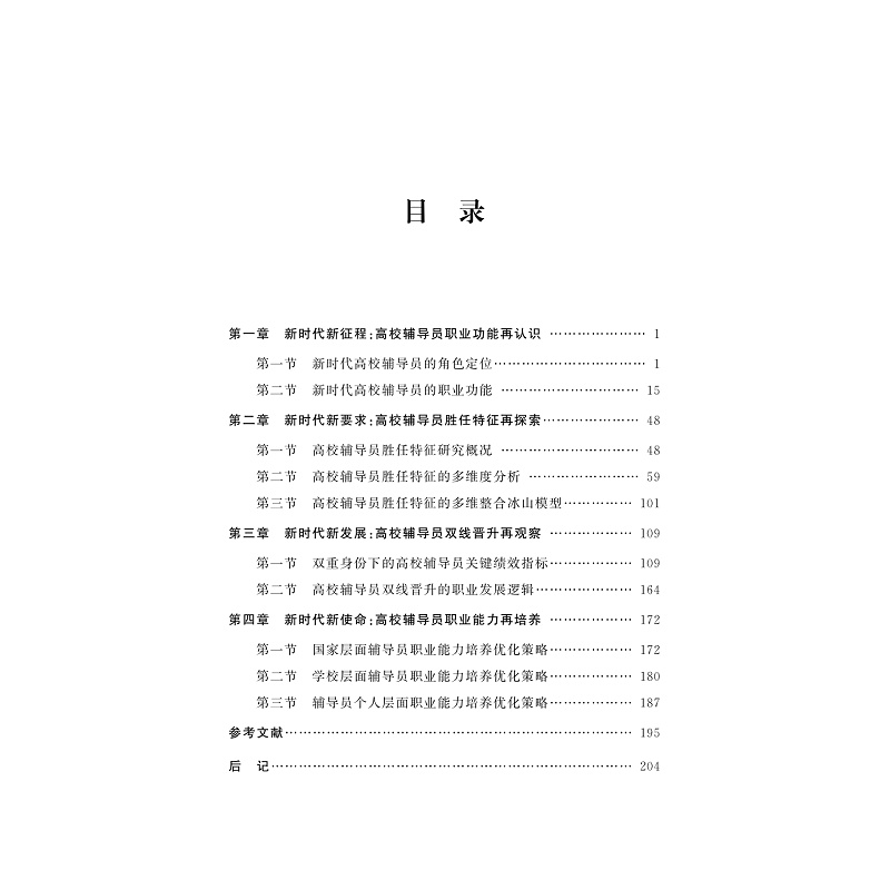 本书为浙江省社科基金项目研究成果。在国家高度重视和大力推进高校思想政治工作新的历史时期,本书对高校辅导员队伍建设命题进行了再审视,系统地回顾了高校辅导员制度和角色的变迁历程,剖析了新时代高校辅导员职业功能的构成及其内部关系,探索了新时代高校辅导员胜任特征的多维整合冰山模型,围绕辅导员“教师”和“管理”双重身份的特点构建了新时代高校辅导员关键绩效指标体系,并根据胜任特征—工作绩效—职业发展的关系对辅导员“双线晋升”的职业发展路径做了深入的观察和讨论。最后,提出了以工作绩效为导向的高校辅导员职业能力培养优化策略,以期为新时代我国高校辅导员队伍建设提供因应之策。