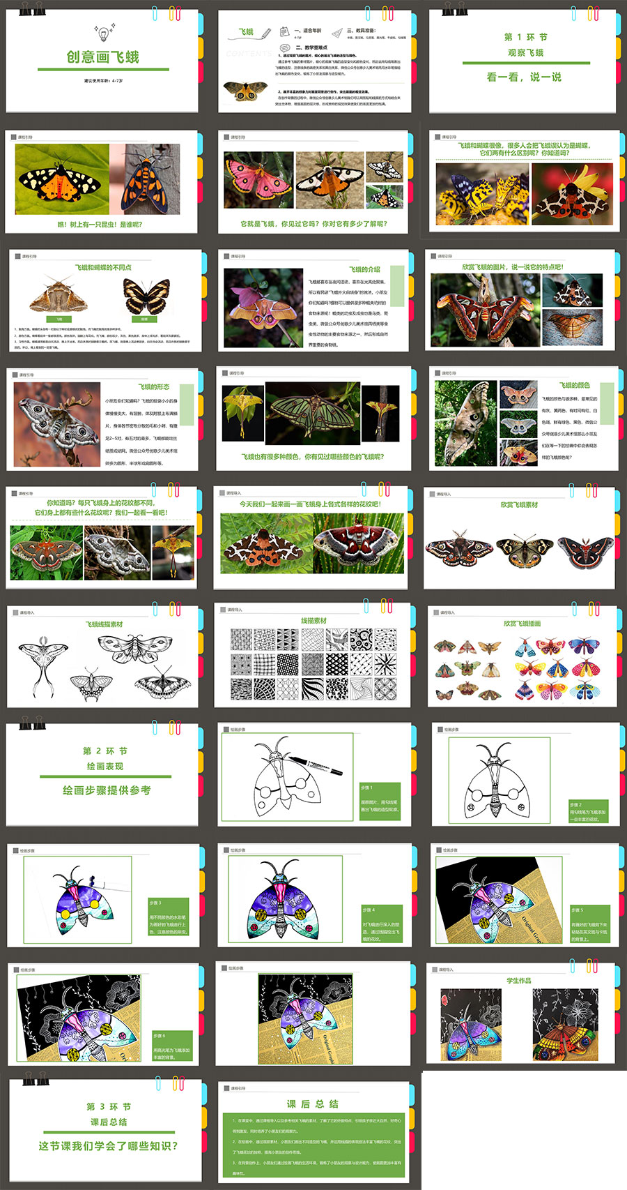 1、通过观察飞蛾的图片,细心的画出飞蛾的造型与颜色。