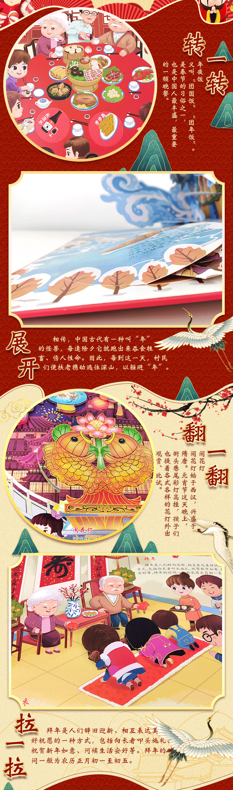 《年年在一起》立体书是一本高档精美,互动性强,充满游戏趣味的儿童立体图书。图书涵盖神话故事,民间传统,用有趣易识记的方式讲述年的来历以及过年时的习俗,通过食俗和庆祝活动让孩子们能更清楚直观的了解我国的传统中国年。让孩子在知道过年期间的各种春节仪式的同时,了解中国文化对世界影响力,更能全方位中国新年所蕴含的文化与意义。