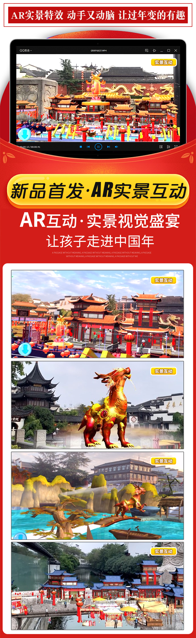 礼盒装,包含立体书、对联、红包、贴纸、门神、游戏棋等。