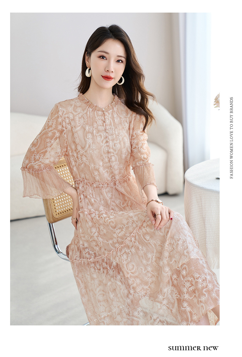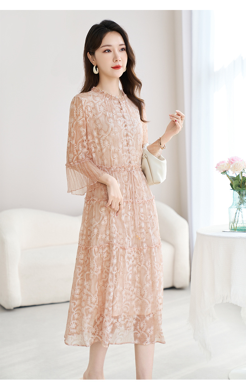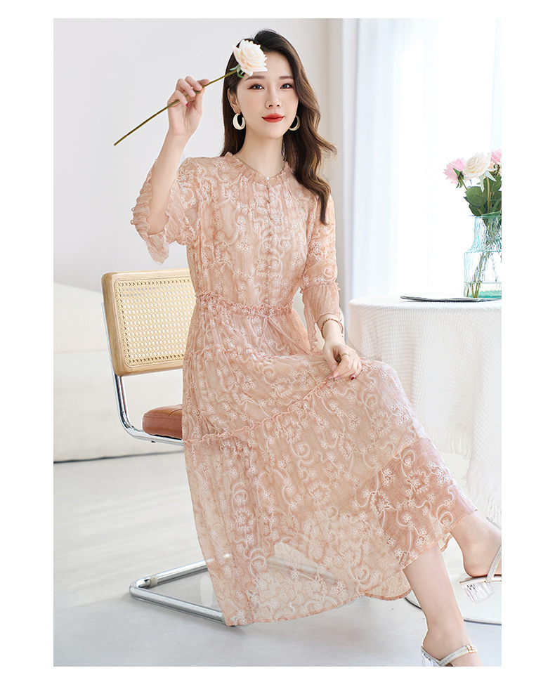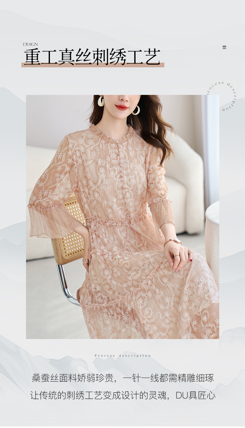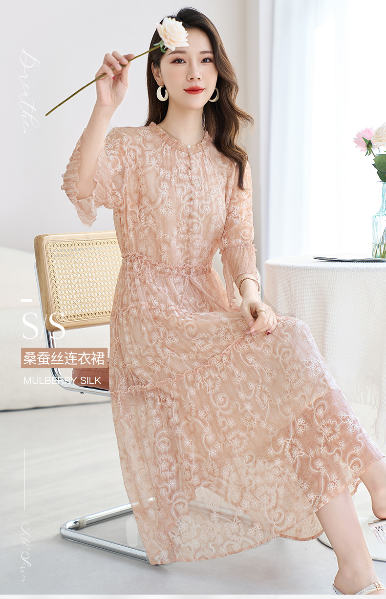 QS-82599726【真丝顺纡绣花】夏季显瘦木耳边中长裙减龄桑蚕丝连衣裙女9726