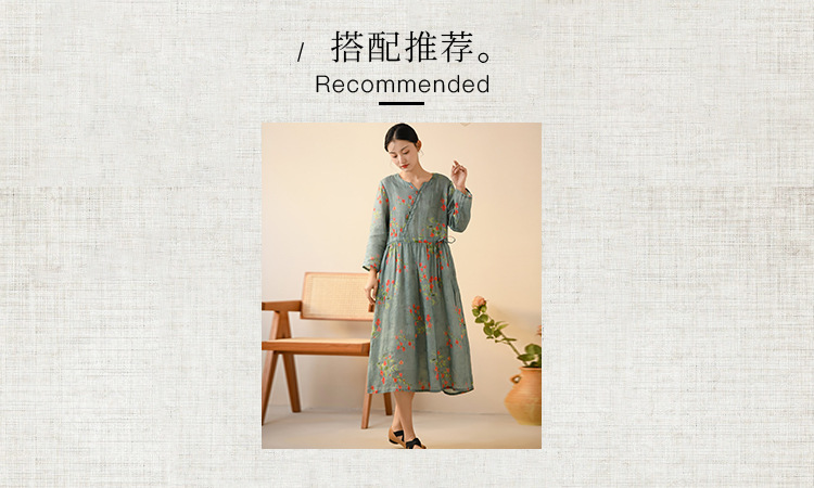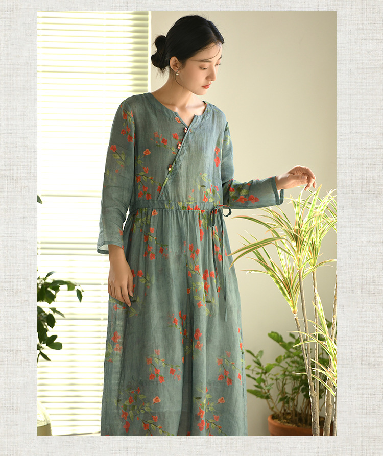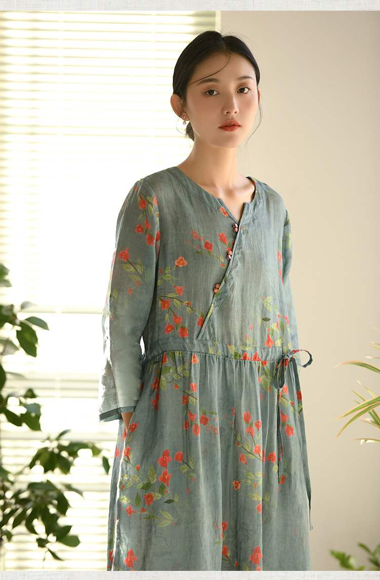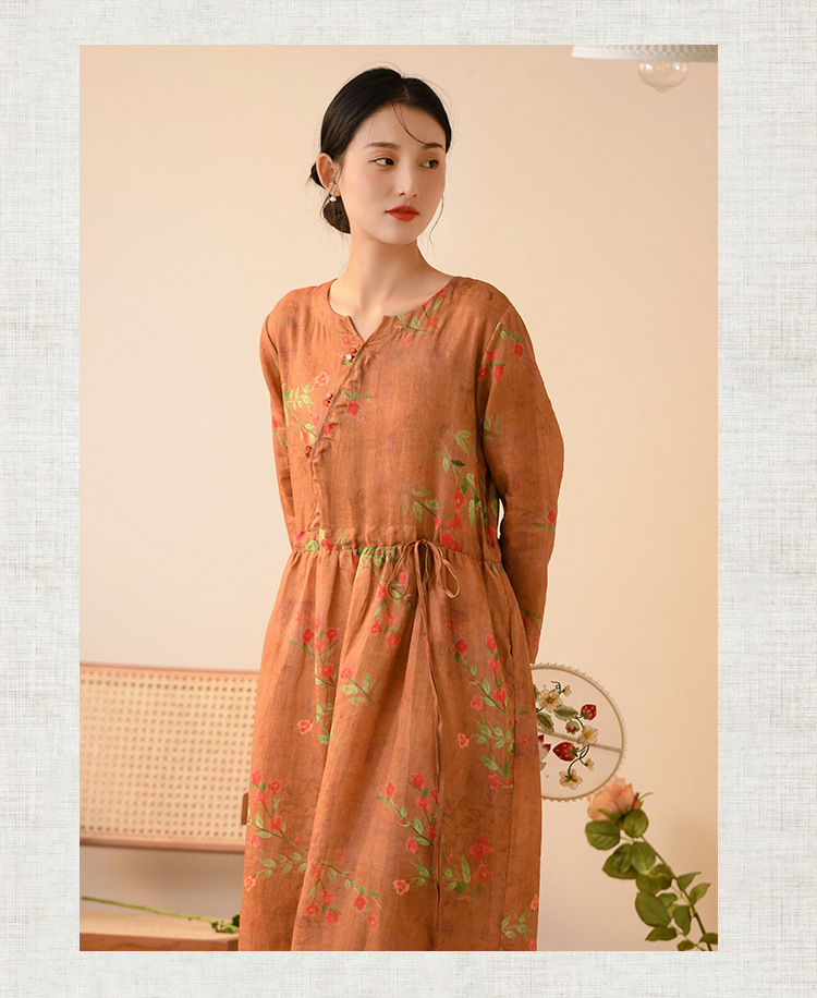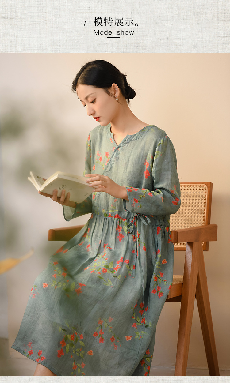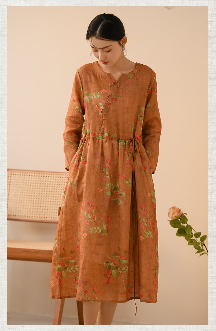 QM-6014春发-苎麻收腰连衣裙 复古女装2023春季新款收腰苎麻连衣裙女新中式长袖棉麻碎花裙