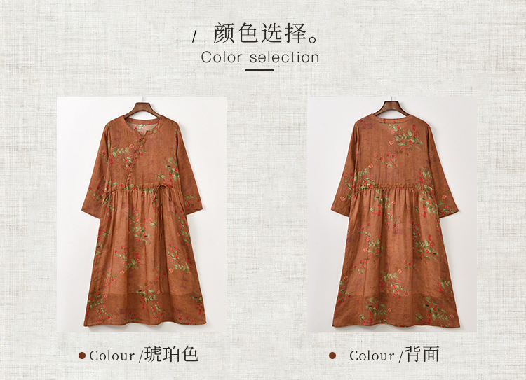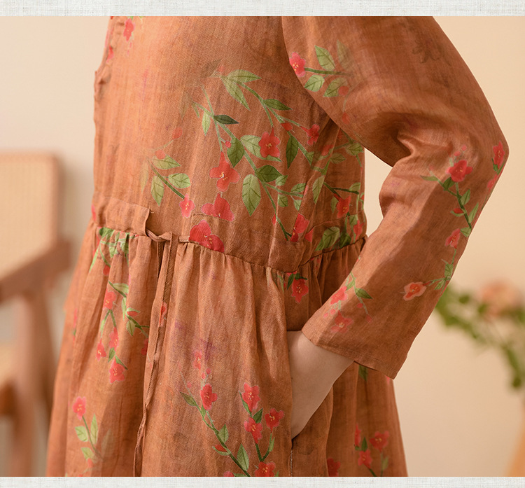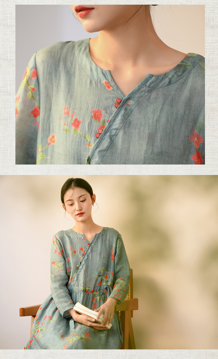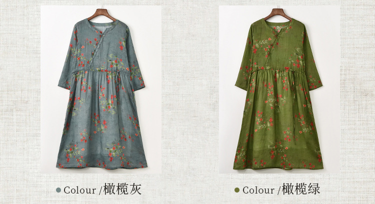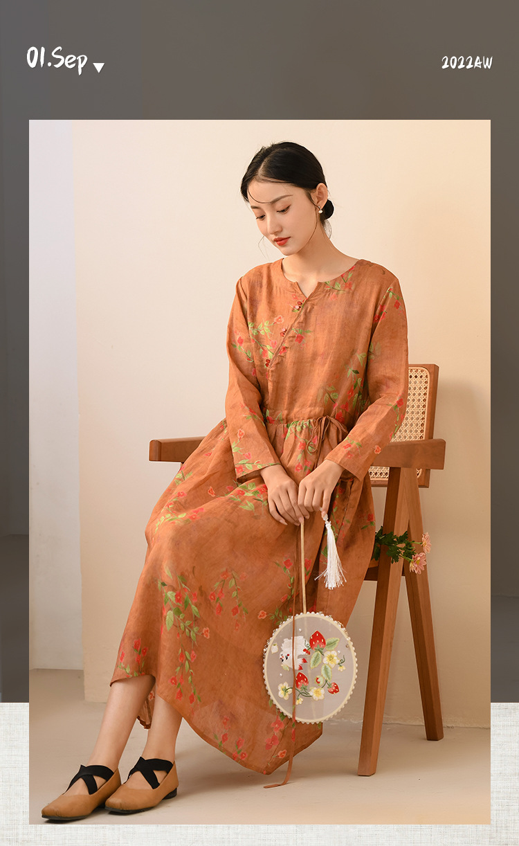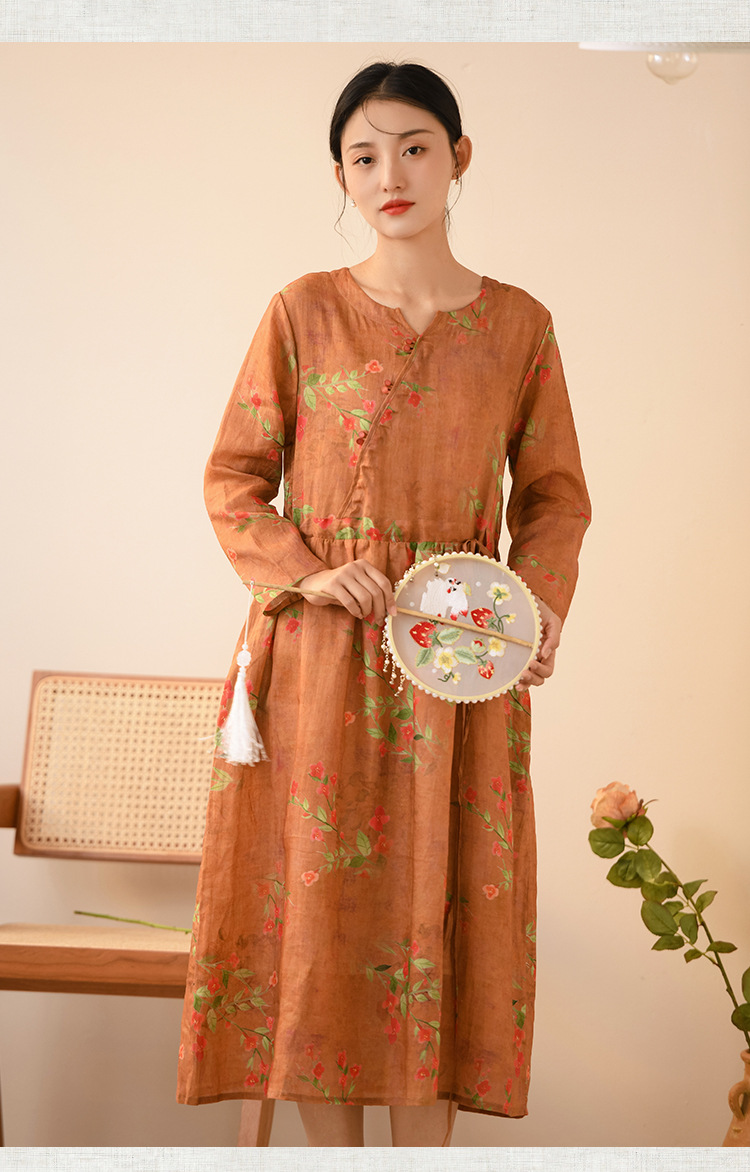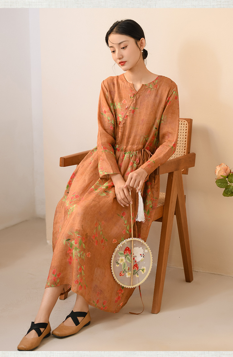 QM-6014春发-苎麻收腰连衣裙 复古女装2023春季新款收腰苎麻连衣裙女新中式长袖棉麻碎花裙