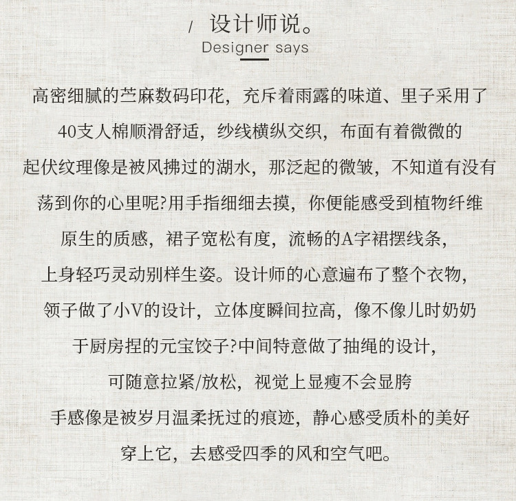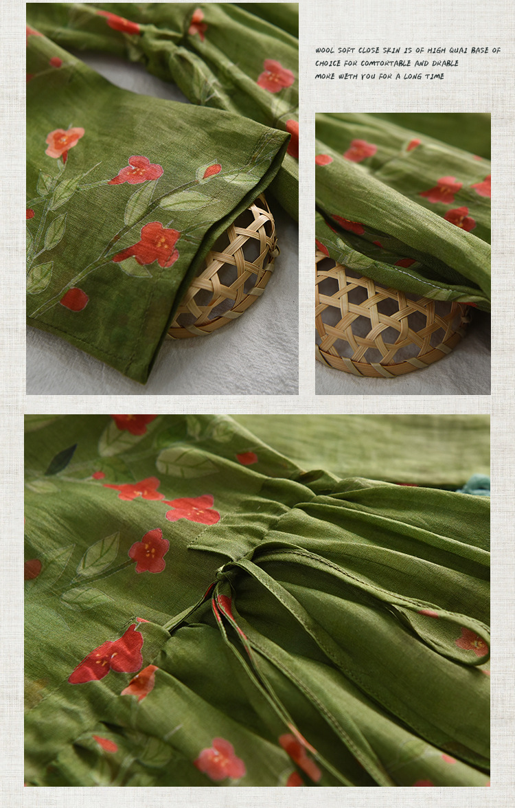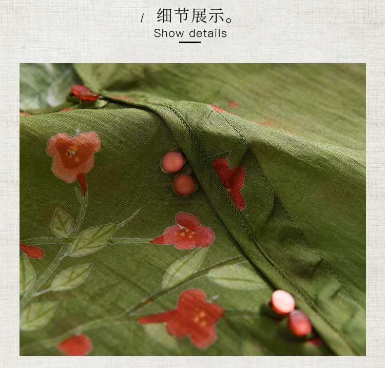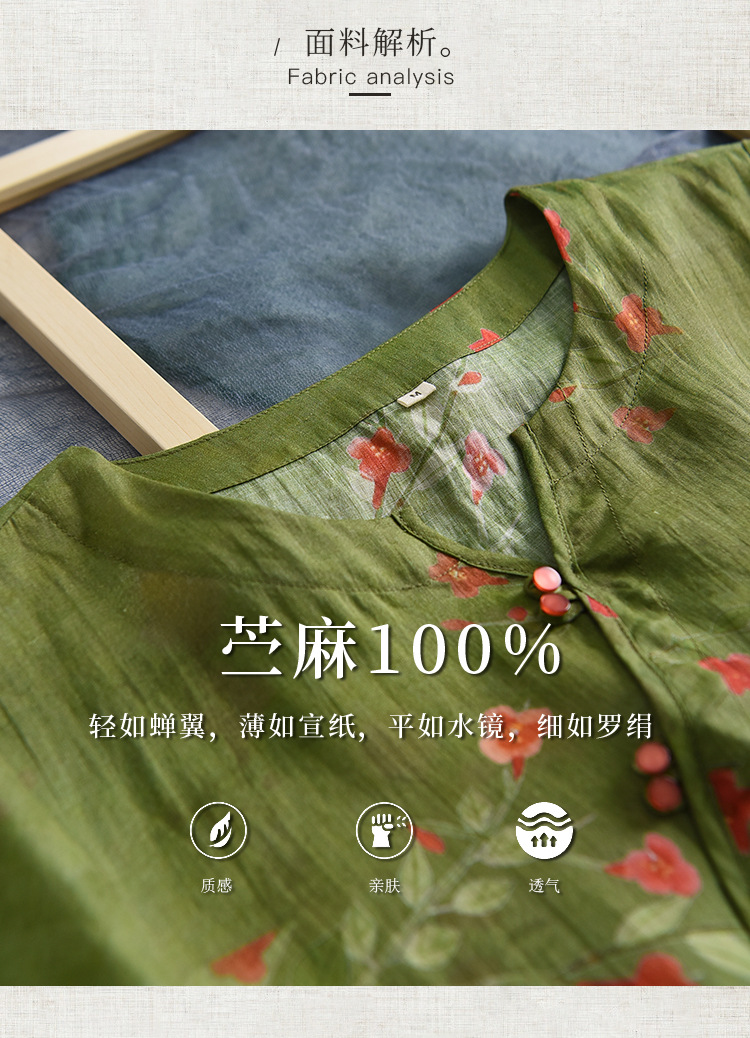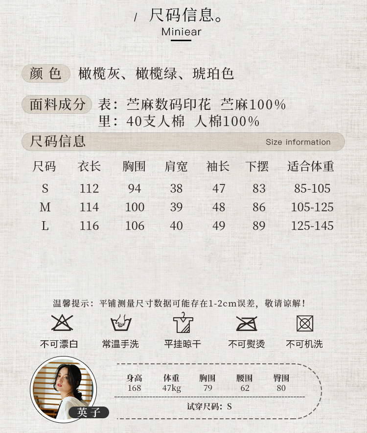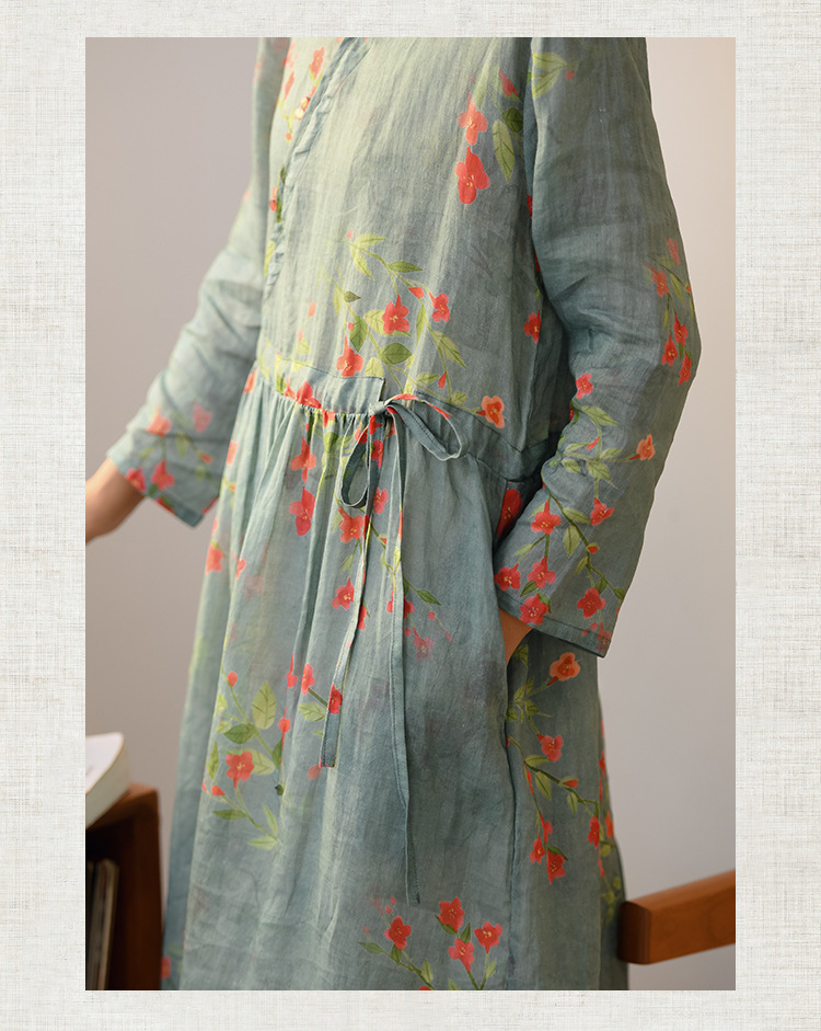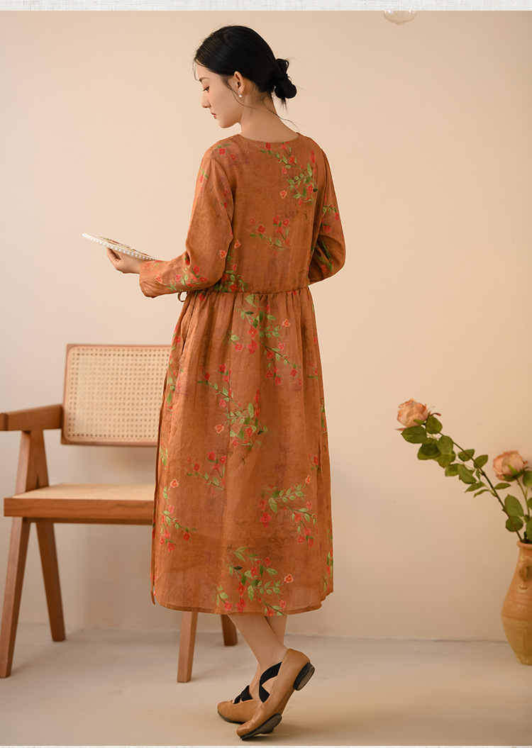 QM-6014春发-苎麻收腰连衣裙 复古女装2023春季新款收腰苎麻连衣裙女新中式长袖棉麻碎花裙