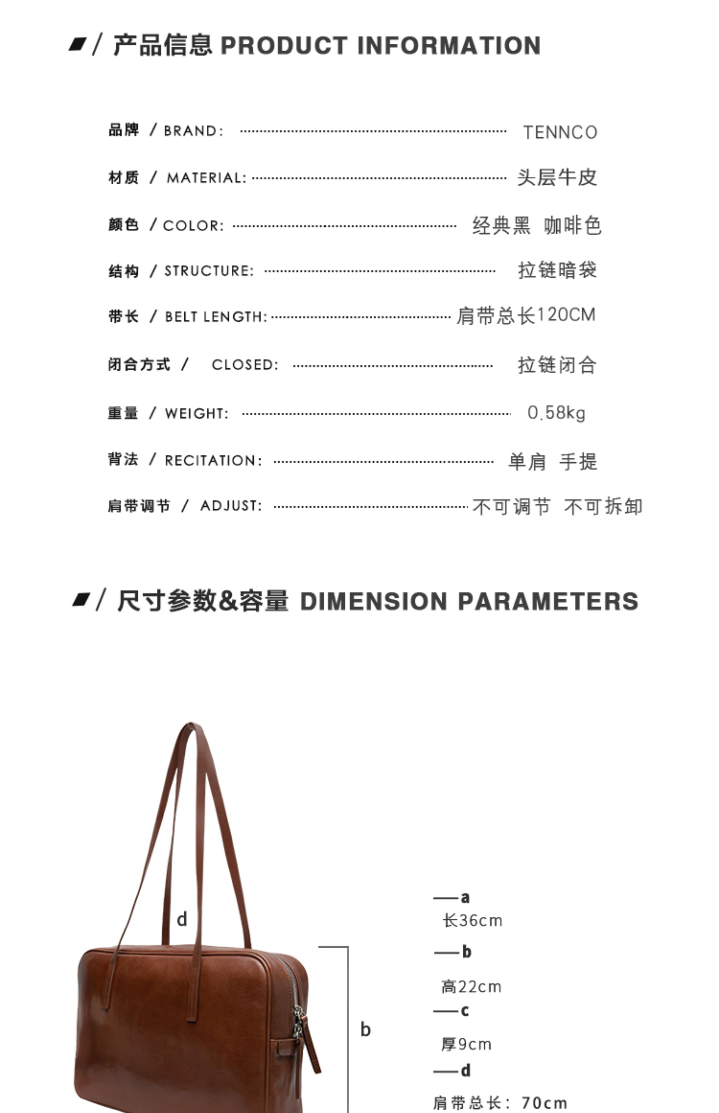 TENNCO 原创头层牛皮大容量单肩包植鞣皮波士顿包手提包托特女包