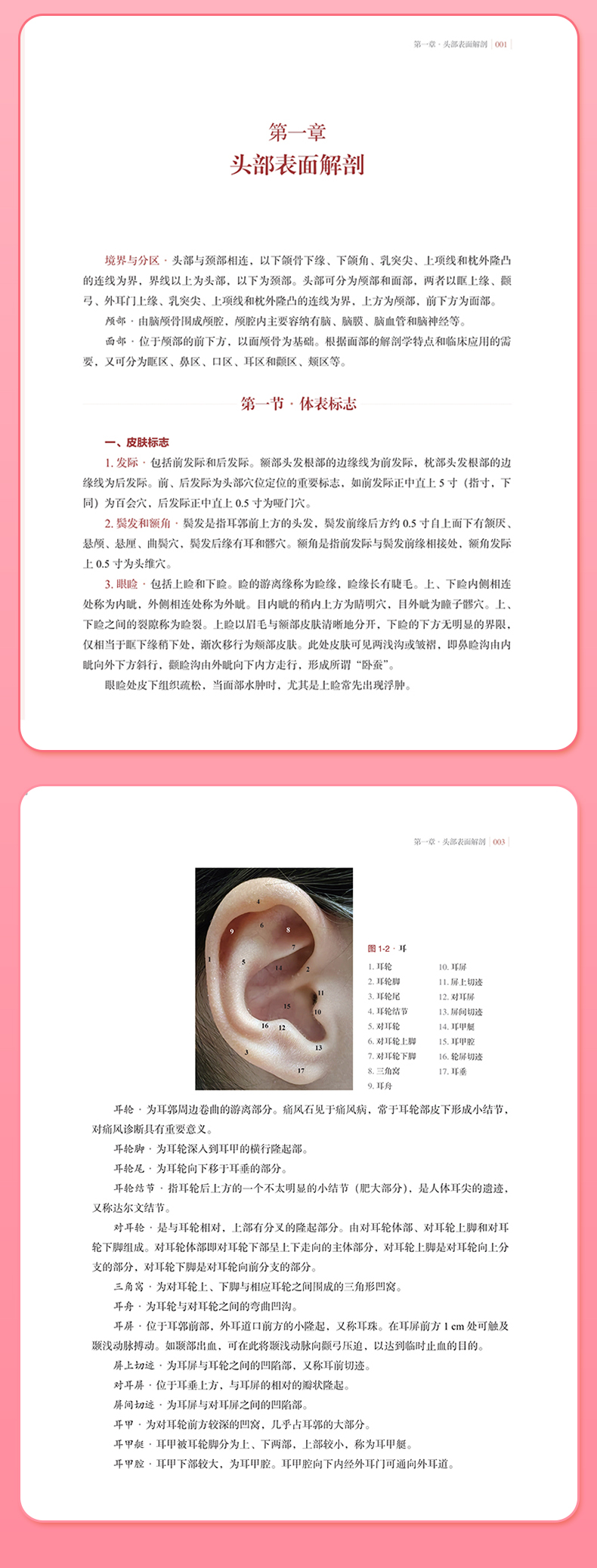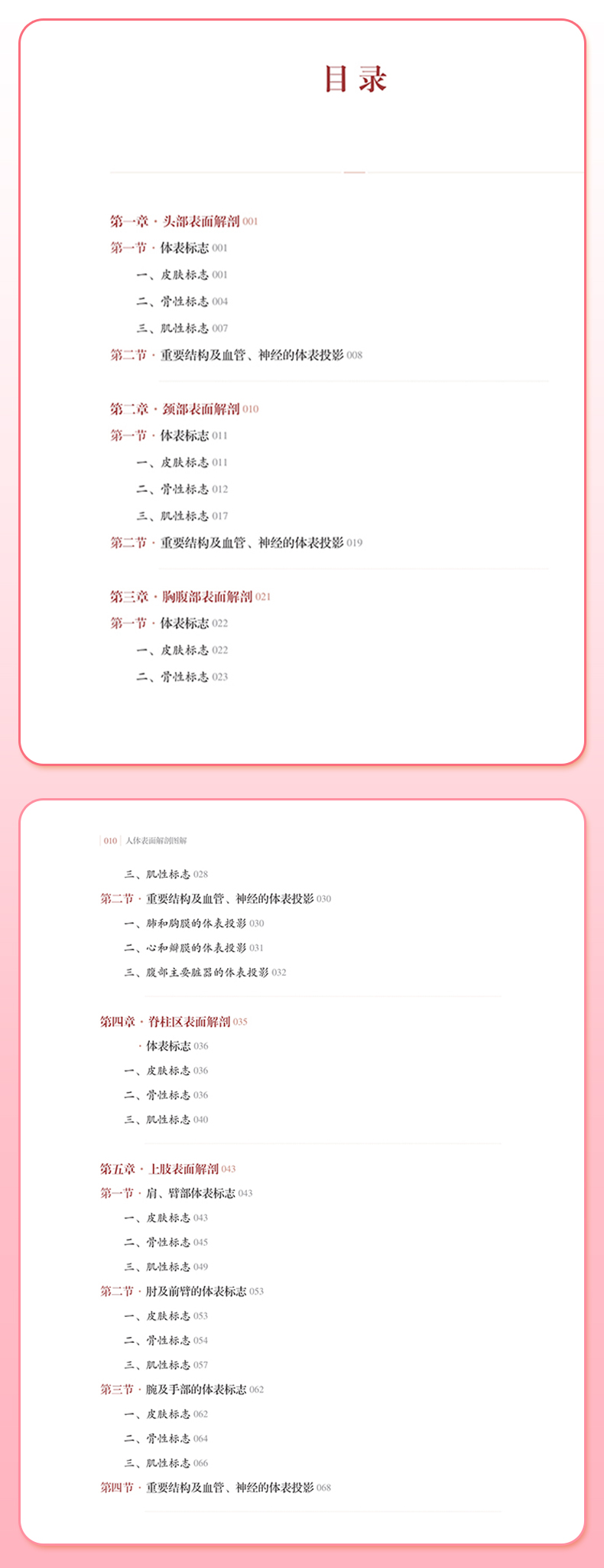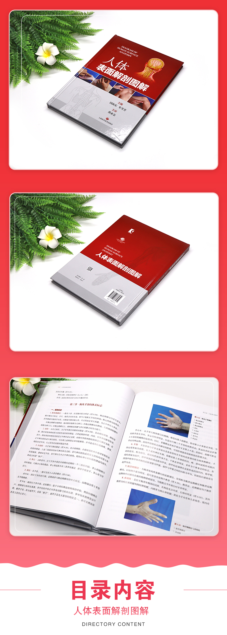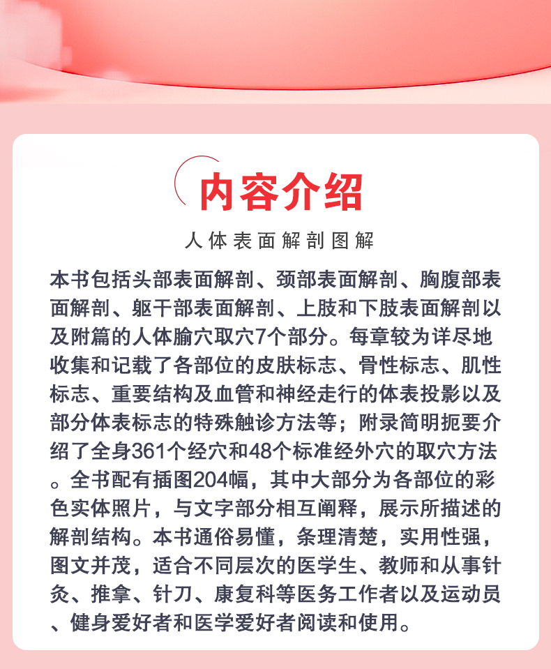 本书包括头部表面解剖、颈部表面解剖、胸腹部表面解剖、躯干部表面解剖、上肢和下肢表面解剖以及附篇的人体腧穴取穴7个部分。每章较为详尽地收集和记载了各部位的皮肤标志、骨性标志、肌性标志、重要结构及血管和神经走行的体表投影以及部分体表标志的特殊触诊方法等;附录简明扼要介绍了全身361个经穴和48个标准经外穴的取穴方法。全书配有插图204幅,其中大部分为各部位的彩色实体照片,与文字部分相互阐释,展示所描述的解剖结构。本书通俗易懂,条理清楚,实用性强,图文并茂,适合不同层次的医学生、教师和从事针灸、推拿、针刀、康复科等医务工作者以及运动员、健身爱好者和医学爱好者阅读和使用。