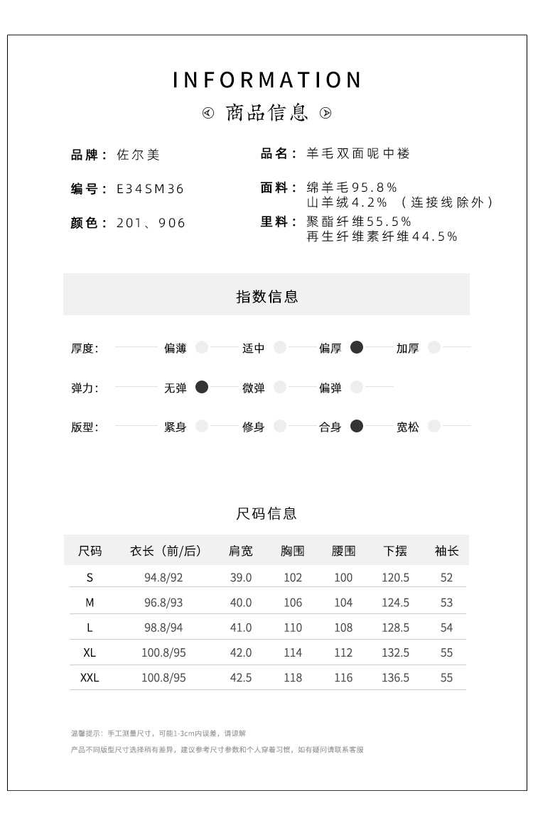 佐尔美冬季新款 气质时尚95%绵羊毛双面呢大衣女E34SM36