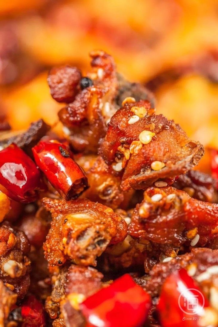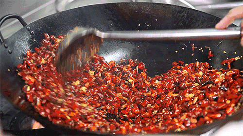 用香料、干辣椒、花椒和事先炒好的鸡丁进行翻炒,不一会就会闻到诱人的“火辣辣”的辣子鸡的味道,真的是下饭一绝的神器。