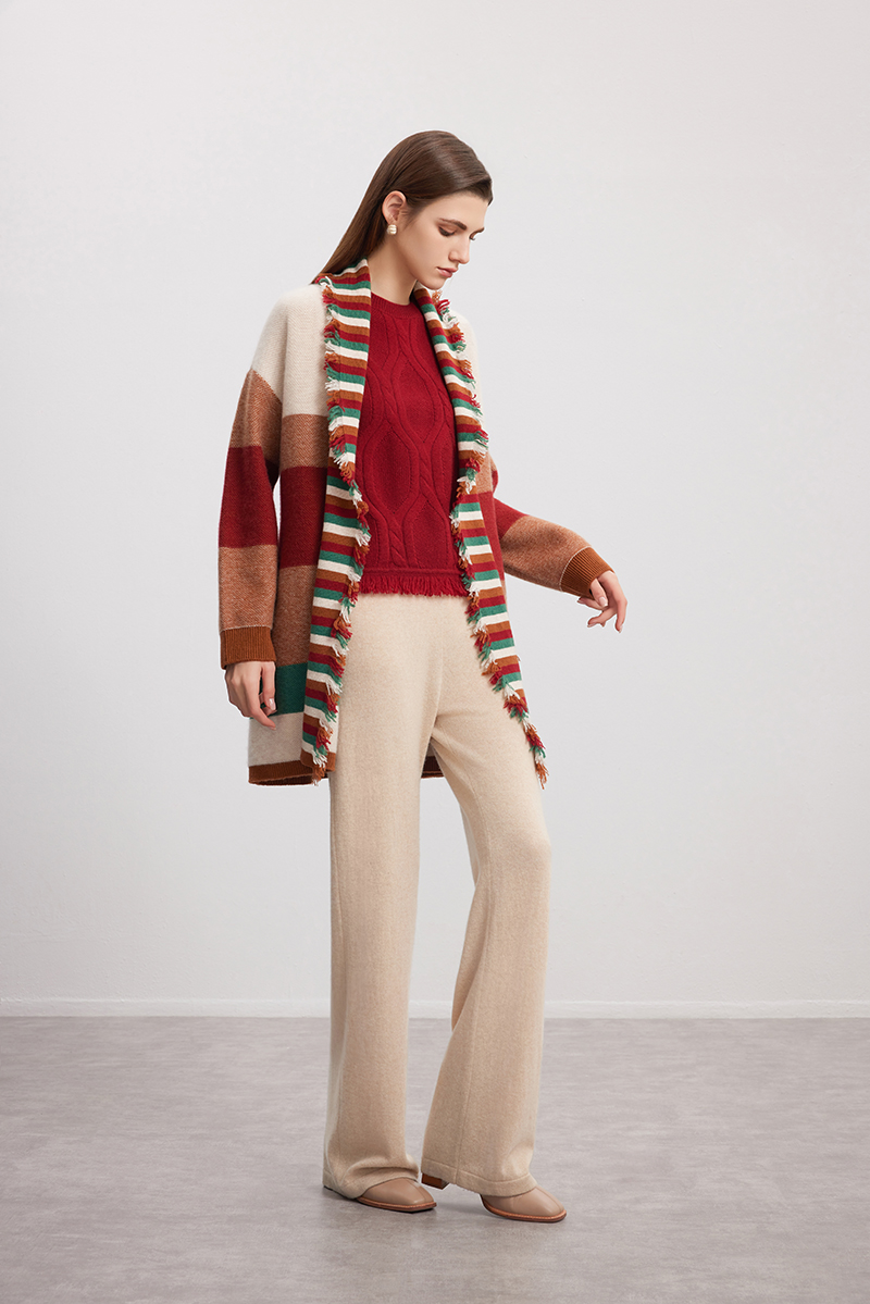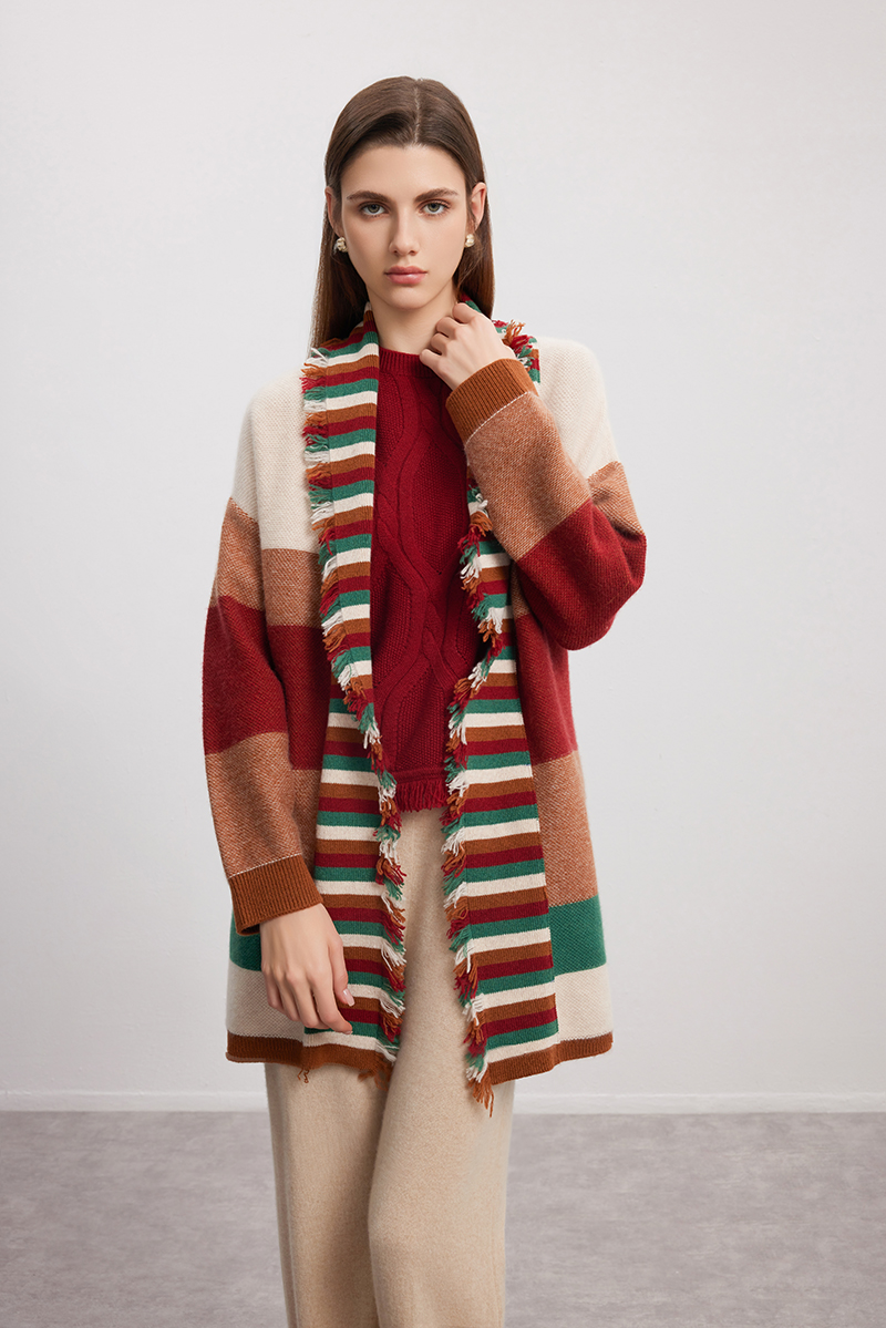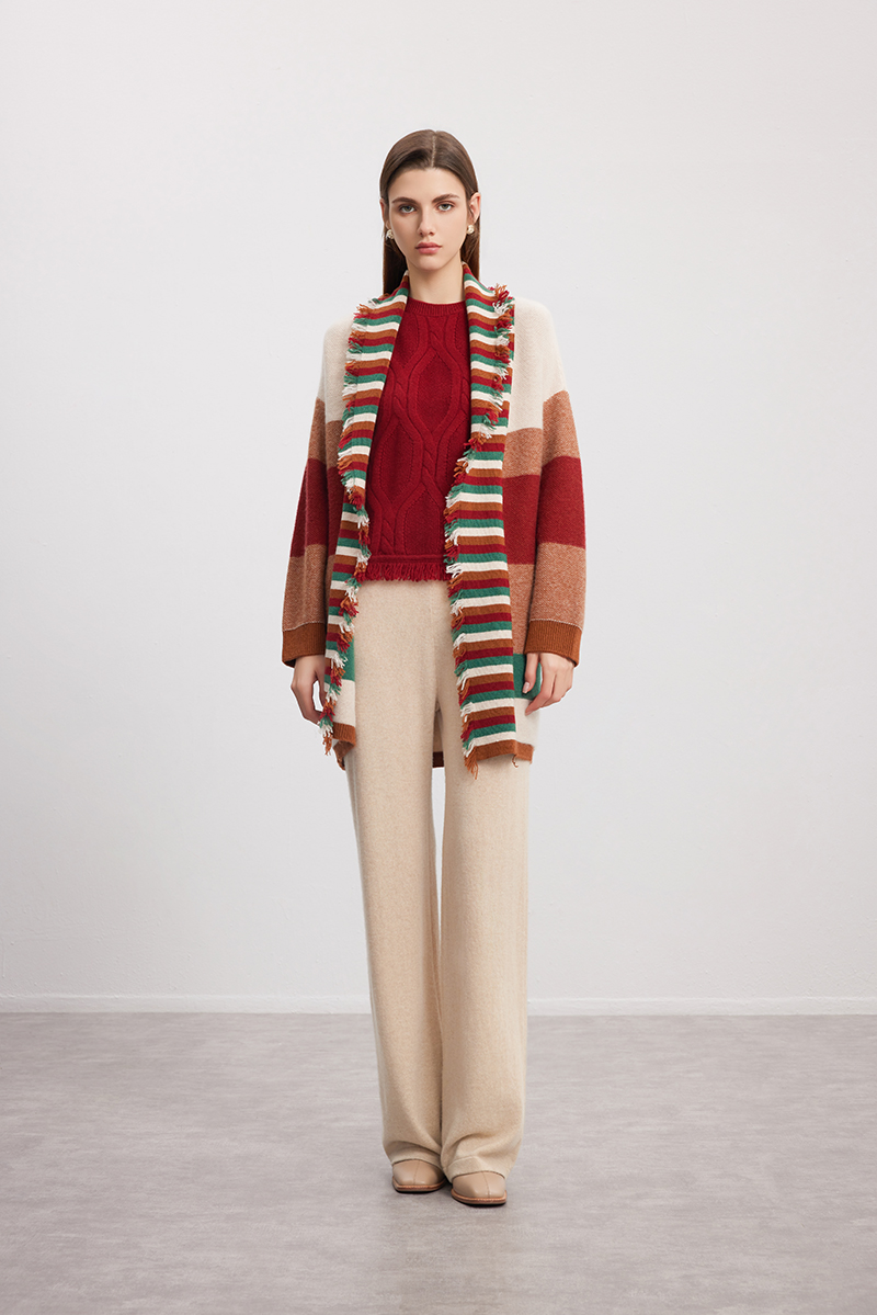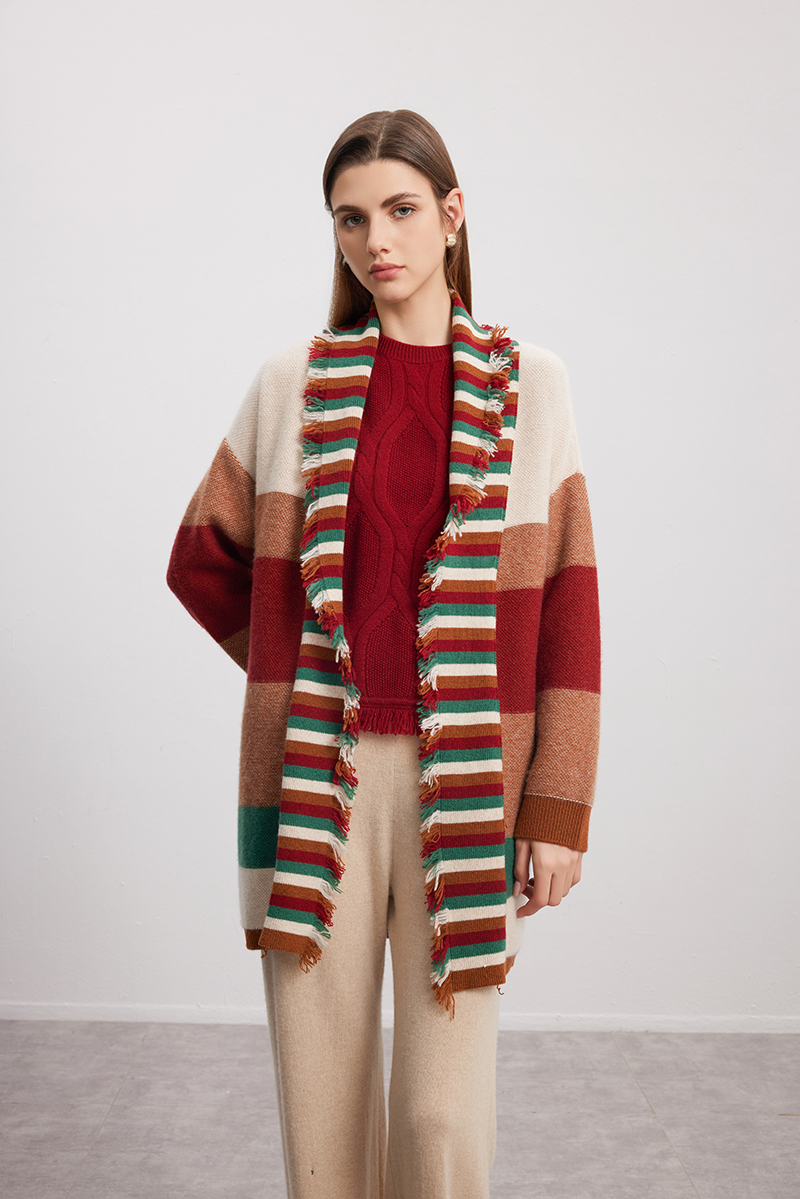【条纹撞色羊绒开衫】羊绒世家秋冬新品女士100%山羊绒针织开衫外套
