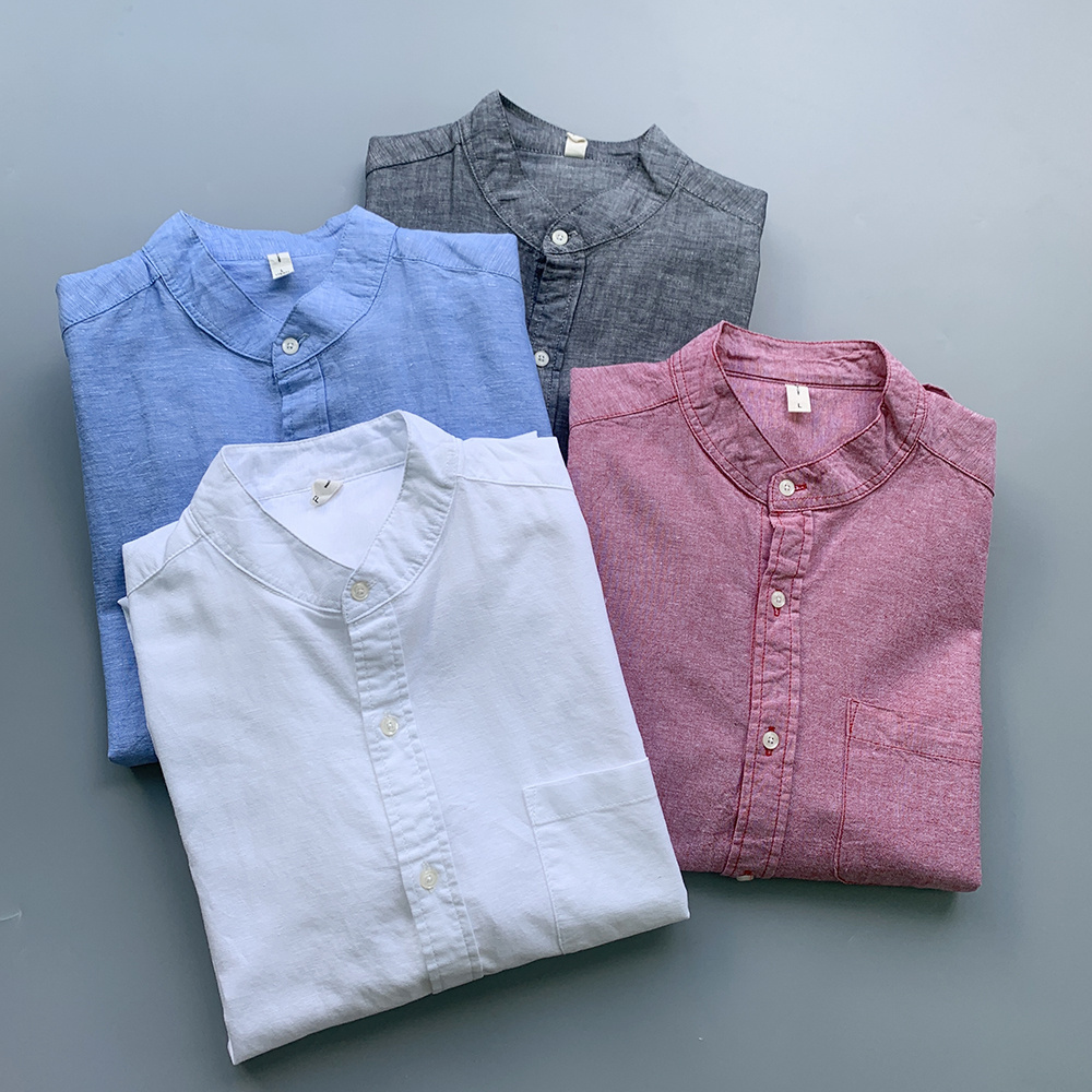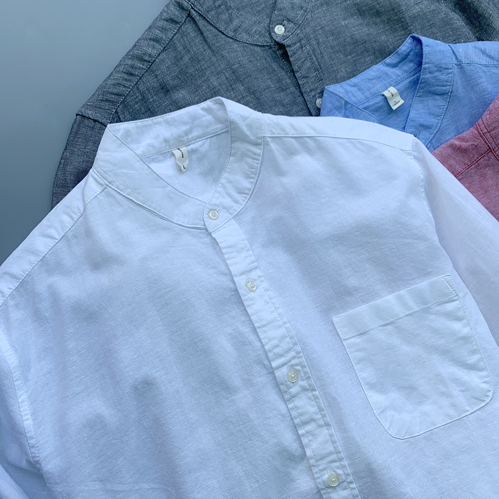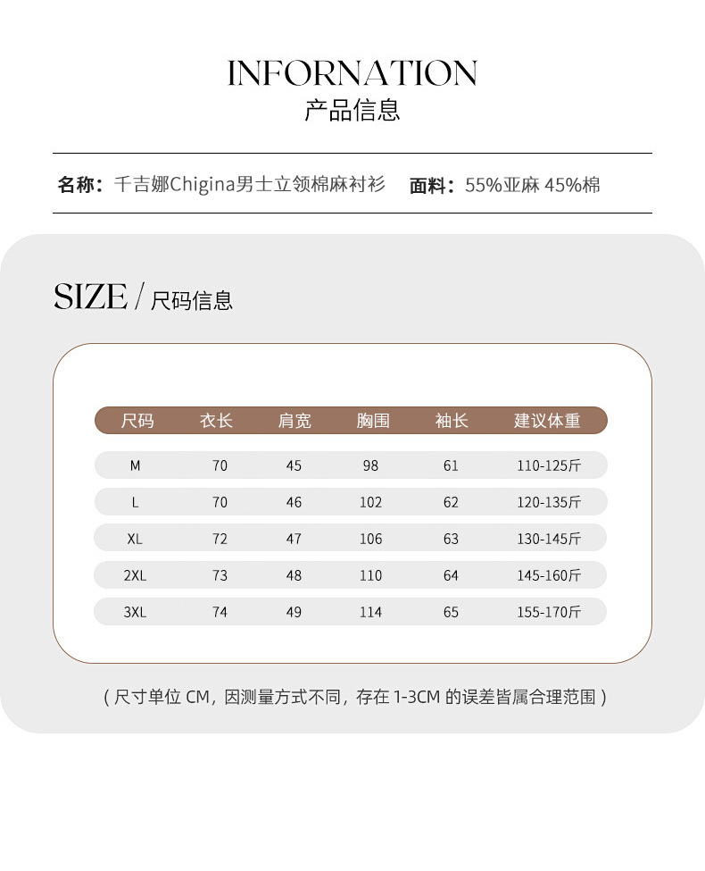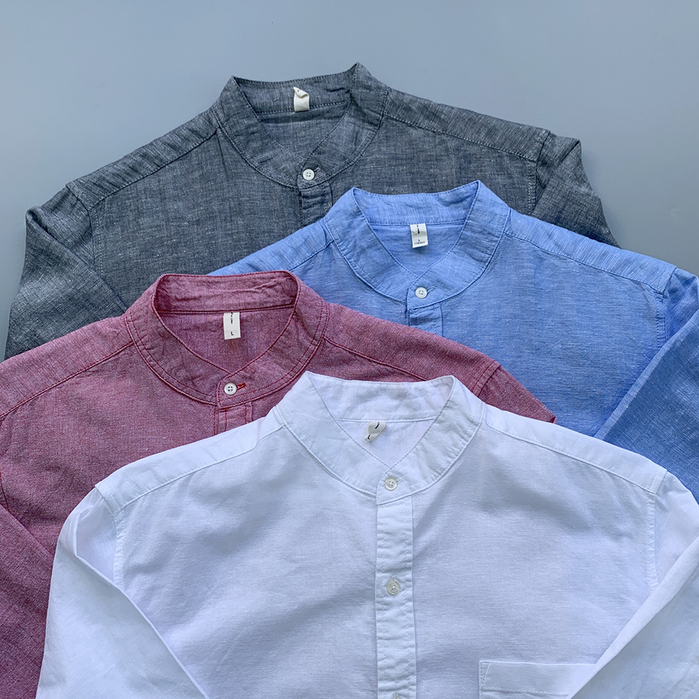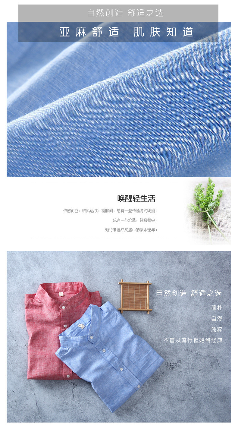 下单详情 【品牌】千吉娜Chigina 【品名】男士立领棉麻衬衫 【材质】55%亚麻45%棉 【颜色】蓝色、灰色、白色、红色 【尺码】M—3XL码